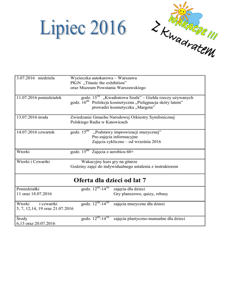 3.07.2016 niedziela Wycieczka autokarowa – Warszawa PKiN „Titanic the exhibition” oraz Muzeum Powstania Warszawskiego 11.07.2016 poniedziałek godz. 1530 „Kwadratowa Szafa” – Giełda rzeczy używanych godz. 1600 Prelekcja kosmetyczna „Pielęgnacja skóry latem” prowadzi kosmetyczka „Margota” 13.07.2016 środa Zwiedzanie Gmachu Narodowej Orkiestry Symfonicznej Polskiego Radia w Katowicach 14.07.2016 czwartek godz. 1500 „Podstawy improwizacji muzycznej” Pre-zajęcia informacyjne Zajęcia cykliczne – od września 2016 Wtorki godz. 1500 Zajęcia z aerobicu 60+ Wtorki i Czwartki Wakacyjny kurs gry na gitarze Godziny zajęć do indywidualnego ustalenia z instruktorem Oferta dla dzieci od lat 7 Poniedziałki 11 oraz 18.07.2016 godz. 1200-1430 zajęcia dla dzieci Gry planszowe, quizy, rebusy Wtorki i czwartki 5, 7, 12,14, 19 oraz 21.07.2016 godz. 1200-1430 zajęcia muzyczne dla dzieci Środy 6,13 oraz 20.07.2016 godz. 1200-1430 zajęcia plastyczno-manualne dla dzieci