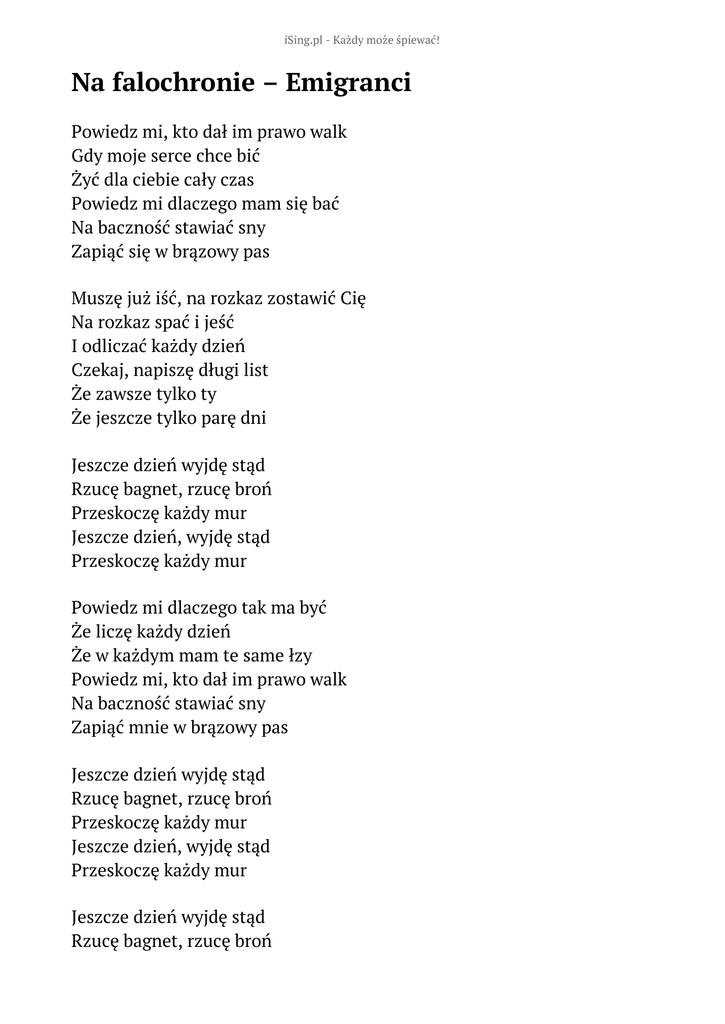 iSing.pl - Każdy może śpiewać! Na falochronie – Emigranci Powiedz mi, kto dał im prawo walk Gdy moje serce chce bić Żyć dla ciebie cały czas Powiedz mi dlaczego mam się bać Na baczność stawiać sny Zapiąć się w brązowy pas Muszę już iść, na rozkaz zostawić Cię Na rozkaz spać i jeść I odliczać każdy dzień Czekaj, napiszę długi list Że zawsze tylko ty Że jeszcze tylko parę dni Jeszcze dzień wyjdę stąd Rzucę bagnet, rzucę broń Przeskoczę każdy mur Jeszcze dzień, wyjdę stąd Przeskoczę każdy mur Powiedz mi dlaczego tak ma być Że liczę każdy dzień Że w każdym mam te same łzy Powiedz mi, kto dał im prawo walk Na baczność stawiać sny Zapiąć mnie w brązowy pas Jeszcze dzień wyjdę stąd Rzucę bagnet, rzucę broń Przeskoczę każdy mur Jeszcze dzień, wyjdę stąd Przeskoczę każdy mur Jeszcze dzień wyjdę stąd Rzucę bagnet, rzucę broń Przeskoczę każdy mur Jeszcze dzień wyjdę stąd Rzucę bagnet, rzucę broń Przeskoczę każdy mur Jeszcze dzień wyjdę stąd Rzucę bagnet, rzucę broń Przeskoczę każdy mur Jeszcze dzień wyjdę stąd Rzucę bagnet, rzucę broń Przeskoczę każdy mur Słowa: P. Kukiz Muzyka: E. Stasiak Rok wydania: brak danych Płyta: brak danych