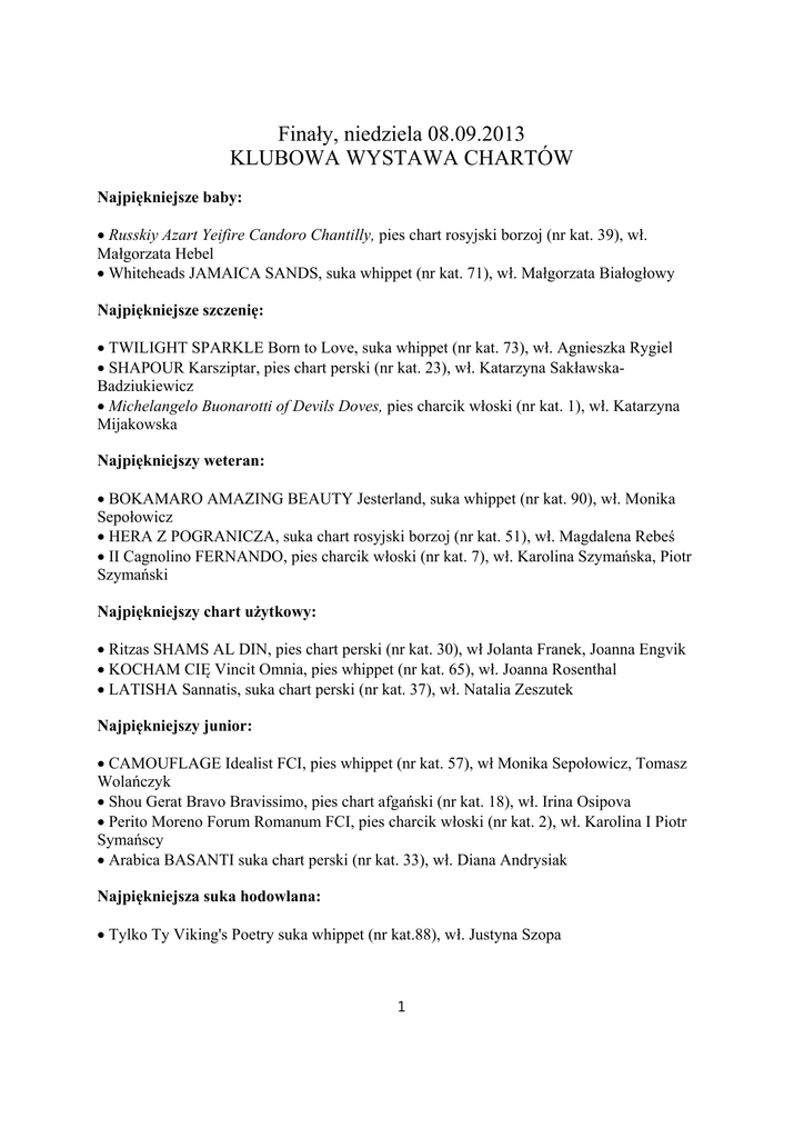 Finały, niedziela 08.09.2013 KLUBOWA WYSTAWA CHARTÓW Najpiękniejsze baby: Russkiy Azart Yeifire Candoro Chantilly, pies chart rosyjski borzoj (nr kat. 39), wł. Małgorzata Hebel Whiteheads JAMAICA SANDS, suka whippet (nr kat. 71), wł. Małgorzata Białogłowy Najpiękniejsze szczenię: TWILIGHT SPARKLE Born to Love, suka whippet (nr kat. 73), wł. Agnieszka Rygiel SHAPOUR Karsziptar, pies chart perski (nr kat. 23), wł. Katarzyna SakławskaBadziukiewicz Michelangelo Buonarotti of Devils Doves, pies charcik włoski (nr kat. 1), wł. Katarzyna Mijakowska Najpiękniejszy weteran: BOKAMARO AMAZING BEAUTY Jesterland, suka whippet (nr kat. 90), wł. Monika Sepołowicz HERA Z POGRANICZA, suka chart rosyjski borzoj (nr kat. 51), wł. Magdalena Rebeś II Cagnolino FERNANDO, pies charcik włoski (nr kat. 7), wł. Karolina Szymańska, Piotr Szymański Najpiękniejszy chart użytkowy: Ritzas SHAMS AL DIN, pies chart perski (nr kat. 30), wł Jolanta Franek, Joanna Engvik KOCHAM CIĘ Vincit Omnia, pies whippet (nr kat. 65), wł. Joanna Rosenthal LATISHA Sannatis, suka chart perski (nr kat. 37), wł. Natalia Zeszutek Najpiękniejszy junior: CAMOUFLAGE Idealist FCI, pies whippet (nr kat. 57), wł Monika Sepołowicz, Tomasz Wolańczyk Shou Gerat Bravo Bravissimo, pies chart afgański (nr kat. 18), wł. Irina Osipova Perito Moreno Forum Romanum FCI, pies charcik włoski (nr kat. 2), wł. Karolina I Piotr Symańscy Arabica BASANTI suka chart perski (nr kat. 33), wł. Diana Andrysiak Najpiękniejsza suka hodowlana: Tylko Ty Viking's Poetry suka whippet (nr kat.88), wł. Justyna Szopa 1 Najpiękniejszy reproduktor: Calicanto du Domaine de Chanteloup pies charcik włoski (nr kat. 5), wł. Karolina, Piotr Szymańscy Najpiękniejsza para: Zapytać Najlepsza Grupa Hodowlana: Festina wilczarz irlandzki, hod. Hanna Woźna-Gil Bello di Tatrebest chart rosyjski borzoj, hod. Magdalena Rebeś Meradith whippet, hod. Agnieskza Nakonieczna Forum Romanum charcik włoski, hod. Karolina, Piotr Szymańscy Najpiękniejszy chart wystawy klubowej: CAMOUFLAGE Idealist FCI, pies whippet (nr kat. 57), wł Monika Sepołowicz, Tomasz Wolańczyk OLIMPIA Celtic Alanda, suka wilczarz irlandzki (nr kat. 102) wł. Karol Skowronek CAESAR Yrtep, pies chart perski (nr kat. 31), Agnieszka Jędrzejczak Imladris Moonshine Prelude, suka chart angielski greyhound (nr kat. 55), wł. Marzena Pietruchowska 2