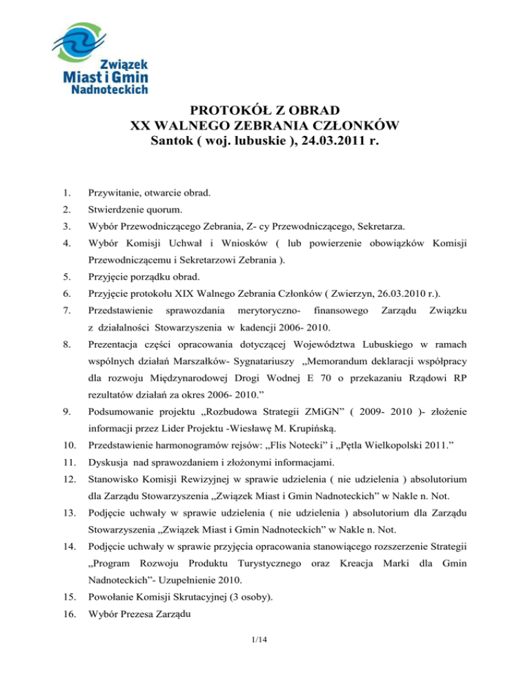 PROTOKÓŁ Z OBRAD XX WALNEGO ZEBRANIA CZŁONKÓW Santok ( woj. lubuskie ), 24.03.2011 r. 1. Przywitanie, otwarcie obrad. 2. Stwierdzenie quorum. 3. Wybór Przewodniczącego Zebrania, Z- cy Przewodniczącego, Sekretarza. 4. Wybór Komisji Uchwał i Wniosków ( lub powierzenie obowiązków Komisji Przewodniczącemu i Sekretarzowi Zebrania ). 5. Przyjęcie porządku obrad. 6. Przyjęcie protokołu XIX Walnego Zebrania Członków ( Zwierzyn, 26.03.2010 r.). 7. Przedstawienie sprawozdania merytoryczno- finansowego Zarządu Związku z działalności Stowarzyszenia w kadencji 2006- 2010. 8. Prezentacja części opracowania dotyczącej Województwa Lubuskiego w ramach wspólnych działań Marszałków- Sygnatariuszy „Memorandum deklaracji współpracy dla rozwoju Międzynarodowej Drogi Wodnej E 70 o przekazaniu Rządowi RP rezultatów działań za okres 2006- 2010.” 9. Podsumowanie projektu „Rozbudowa Strategii ZMiGN” ( 2009- 2010 )- złożenie informacji przez Lider Projektu -Wiesławę M. Krupińską. 10. Przedstawienie harmonogramów rejsów: „Flis Notecki” i „Pętla Wielkopolski 2011.” 11. Dyskusja nad sprawozdaniem i złożonymi informacjami. 12. Stanowisko Komisji Rewizyjnej w sprawie udzielenia ( nie udzielenia ) absolutorium dla Zarządu Stowarzyszenia „Związek Miast i Gmin Nadnoteckich” w Nakle n. Not. 13. Podjęcie uchwały w sprawie udzielenia ( nie udzielenia ) absolutorium dla Zarządu Stowarzyszenia „Związek Miast i Gmin Nadnoteckich” w Nakle n. Not. 14. Podjęcie uchwały w sprawie przyjęcia opracowania stanowiącego rozszerzenie Strategii „Program Rozwoju Produktu Turystycznego oraz Kreacja Marki dla Gmin Nadnoteckich”- Uzupełnienie 2010. 15. Powołanie Komisji Skrutacyjnej (3 osoby). 16. Wybór Prezesa Zarządu 1/14 a) zgłaszanie kandydatur, b) głosowanie, c) przedstawienie wyników, d) podjęcie uchwały. 17. Wybór pozostałych członków Zarządu (6 osób) a) zgłaszanie kandydatur, b) głosowanie, c) przedstawienie wyników, d) podjęcie uchwały. 18. Wybór Komisji Rewizyjnej Związku (5 osób) a) zgłaszanie kandydatur, b) głosowanie, c) przedstawienie wyników, d) podjęcie uchwały. 19. Podjęcie uchwał XX Walnego Zebrania Członków: 19.1. Uchwała w sprawie przeniesienia nadwyżki przychodów nad kosztami za 2010 rok, która zwiększy Fundusz Statutowy Stowarzyszenia. 19.2. Uchwała w sprawie planu działania ZWIĄZKU na rok 2011. 19.3. Uchwała w sprawie budżetu ZWIĄZKU na rok 2011. 19.4. Uchwała w sprawie zaopiniowania projektu Koncepcji Przestrzennego Zagospodarowania Kraju 2030. 20. Wnioski i dyskusja. Zakończenie obrad. Ad. 1 i 2. Obrady XX Walnego Zebrania Członków Związku w Santoku otworzył Prezes Związku- Franciszek Strugała wraz z Wójtem Gminy Santok- Stanisławem Chudzikiem. Po powitaniu zaproszonych gości, o zabranie głosu został poproszony gospodarz spotkania- Wójt Gminy Santok, który przypomniał, że po raz drugi (2004r.) w Santoku, gminie nadnoteckiej odbywa się Walne Zebranie Członków. Włodarz podkreślił także fakt, że od początku istnienia Związku – Gmina Santok jako członek założyciel aktywnie wspiera działalność statutową. Właściwe obrady rozpoczęły się nawiązaniem do historii nakielskiego Stowarzyszenia, co poprzedzone zostało wystąpieniem przygotowanym w charakterze informacyjno- promocyjnym o ziemi santockiej, dokonaniach inwestycyjnych gminy i 2/14 planach na przyszłość. W uzupełnieniu przekazanych informacji goście zostali zachęceni do obejrzenia tematycznej wystawy promocyjnej, ponadto otrzymali pamiątkowe wydawnictwa albumowe i materiały reklamowe. Rozpoczynając obrady Prezes Związku- Franciszek Strugała stwierdził quorum, władne do podejmowania prawomocnych uchwał. W XX Walnym Zebraniu Członków (Zebraniu Sprawozdawczo- Wyborczym) uczestniczyło 14 na 15 Delegatów miast i gmin należących do Związku Miast i Gmin Nadnoteckich, ponadto udział w obradach z głosem „doradczym” wzięli przedstawiciele instytucji wspierających (członkowie honorowy i wspierający). Zał. nr 1 - Listy obecności : 1) delegaci miast i gmin członkowskich, 2) członkowie wspierający i honorowy, 3) przedstawiciele instytucji współpracujących. Ad. 3. Prezes Związku- Franciszek Strugała poprosił o zgłaszanie kandydatur w celu dokonania wyboru na Przewodniczącego Zebrania, Zastępcy Przewodniczącego i Sekretarza. Na Przewodniczącego Zebrania zaproponowano kandydaturę Pana Stanisława Chudzikadelegata Gminy Santok. Innych kandydatur nie zgłoszono. W wyniku jawnego głosowania, przy 13 głosach „za” i 1 „wstrzymującym” wybrano na Przewodniczącego ZebraniaStanisława Chudzika. Następnie delegaci wybrali na Zastępcę Przewodniczącego- Franciszka Strugałę- delegata Miasta Czarnków. Innych kandydatur nie zgłoszono. W wyniku jawnego głosowania, przy 13 głosach „za” i 1 „wstrzymującym” wybrano Z- cę Przewodniczącego Zebrania. Pan Franciszek Strugała zaproponował, aby Sekretarzem Zebrania została Dyrektor Biura- Hanna Forbrich. W wyniku głosowania jawnego (14- „za”) propozycję przyjęto i dokonano wyboru Sekretarza Zebrania. Ad. 4. Przewodniczący Zebrania zaproponował powierzenie obowiązków Komisji Skrutacyjnej oraz Komisji Uchwał i Wniosków- Przewodniczącemu Zebrania i Sekretarzowi. Delegaci w wyniku jednomyślnego głosowania (14- „za”) zdecydowali o powierzeniu obowiązków w/w Komisji- Przewodniczącemu i Sekretarzowi Zebrania. Ad. 5. Przewodniczący Zebrania- Stanisław Chudzik odczytał proponowany porządek obrad XX Walnego Zebrania Członków, wprowadzając trzy autopoprawki dotyczące pkt. 17 „Wybór pozostałych członków Zarządu,” w którym zaproponowano zwiększenie o 1 os. 3/14 dotychczasowej ilości Członków Zarządu, tj. dokonanie wyboru 7 członków Zarządu (maksymalna ilość w Statucie) oraz pkt. 18 „Wybór Komisji Rewizyjnej Związku,” w którym zaproponowano zwiększenie także o 1 os