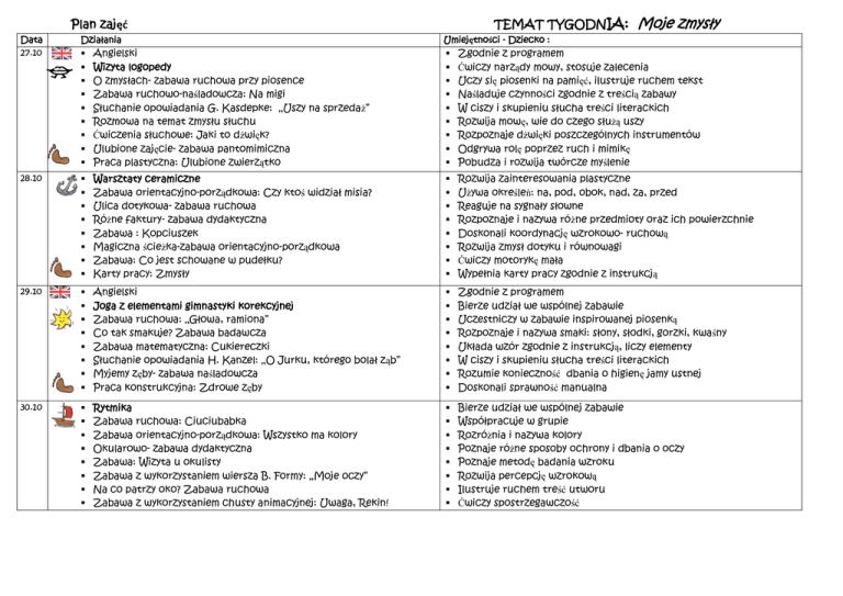TEMAT TYGODNIA: Plan zajęć Moje zmysły Data 27.10 Działania Angielski Wizyta logopedy O zmysłach- zabawa ruchowa przy piosence Zabawa ruchowo-naśladowcza: Na migi Słuchanie opowiadania G. Kasdepke: „Uszy na sprzedaż” Rozmowa na temat zmysłu słuchu Ćwiczenia słuchowe: Jaki to dźwięk? Ulubione zajęcie- zabawa pantomimiczna Praca plastyczna: Ulubione zwierzątko Zgodnie z programem Ćwiczy narządy mowy, stosuje zalecenia Uczy się piosenki na pamięć, ilustruje ruchem tekst Naśladuje czynności zgodnie z treścią zabawy W ciszy i skupieniu słucha treści literackich Rozwija mowę, wie do czego służą uszy Rozpoznaje dźwięki poszczególnych instrumentów Odgrywa rolę poprzez ruch i mimikę Pobudza i rozwija twórcze myślenie 28.10 Warsztaty ceramiczne Zabawa orientacyjno-porządkowa: Czy ktoś widział misia? Ulica dotykowa- zabawa ruchowa Różne faktury- zabawa dydaktyczna Zabawa : Kopciuszek Magiczna ścieżka-zabawa orientacyjno-porządkowa Zabawa: Co jest schowane w pudełku? Karty pracy: Zmysły Rozwija zainteresowania plastyczne Używa określeń: na, pod, obok, nad, za, przed Reaguje na sygnały słowne Rozpoznaje i nazywa różne przedmioty oraz ich powierzchnie Doskonali koordynację wzrokowo- ruchową Rozwija zmysł dotyku i równowagi Ćwiczy motorykę mała Wypełnia karty pracy zgodnie z instrukcją 29.10 Angielski Joga z elementami gimnastyki korekcyjnej Zabawa ruchowa: „Głowa, ramiona” Co tak smakuje? Zabawa badawcza Zabawa matematyczna: Cukiereczki Słuchanie opowiadania H. Kanzel: „O Jurku, którego bolał ząb” Myjemy zęby- zabawa naśladowcza Praca konstrukcyjna: Zdrowe zęby Zgodnie z programem Bierze udział we wspólnej zabawie Uczestniczy w zabawie inspirowanej piosenką Rozpoznaje i nazywa smaki: słony, słodki, gorzki, kwaśny Układa wzór zgodnie z instrukcją, liczy elementy W ciszy i skupieniu słucha treści literackich Rozumie konieczność dbania o higienę jamy ustnej Doskonali sprawność manualna 30.10 Rytmika Zabawa ruchowa: Ciuciubabka Zabawa orientacyjno-porządkowa: Wszystko ma kolory Okularowo- zabawa dydaktyczna Zabawa: Wizyta u okulisty Zabawa z wykorzystaniem wiersza B. Formy: „Moje oczy” Na co patrzy oko? Zabawa ruchowa Zabawa z wykorzystaniem chusty animacyjnej: Uwaga, Rekin! Bierze udział we wspólnej zabawie Współpracuje w grupie Rozróżnia i nazywa kolory Poznaje różne sposoby ochrony i dbania o oczy Poznaje metodę badania wzroku Rozwija percepcję wzrokową Ilustruje ruchem treść utworu Ćwiczy spostrzegawczość Umiejętności - Dziecko : 31.10 Basen-zajęcia fakultatywne Zabawa muzyczno-ruchowa: „Labado” Pachnie ładnie, pachnie brzydko- zabawa dydaktyczna Zabawa badawcza: Taki sam zapach Ćwiczenia logopedyczne na podstawie wiersza E. M. Skorek „Zapachy” Żółw i zając- zabawa ruchowa Zabawa relaksacyjna: Naleśnik Bierze udział we wspólnej zabawie Śpiewa piosenkę, zgodnie się bawi Rozpoznaje niektóre zapachy Wącha i dobiera do pary identyczny zapach Ćwiczy narząd mowy Rozróżnia tempo w muzyce: szybko, wolno Kształtuje poczucie bezpieczeństwa