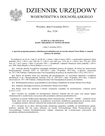 DZIENNIK URZĘDOWY WOJEWÓDZTWA DOLNOŚLĄSKIEGO Wrocław, dnia 8 września 2014 r. Elektronicznie podpisany przez: Matylda Furmanek Poz. 3729 Data: 2014-09-08 15:35:46 UCHWAŁA NR 455/LII/14 RADY MIEJSKIEJ W NOWEJ RUDZIE z dnia 3 września 2014 r. w sprawie programu pomocy udzielanej przedsiębiorcom na terenie miasta Nowa Ruda w ramach pomocy de minimis Na podstawie art.18 ust. 2 pkt 8 i art.40 ust. 1 ustawy z dnia 8 marca 1990 r. o samorządzie gminnym (tekst jednolity: Dz.U. z 2013 r. poz. 594; Dz. U. z 2013 r. poz. 645, poz. 1318, Dz. U. z 2014 r. poz. 379, poz. 1072) oraz art. 7 ust.3 ustawy z dnia 12 stycznia 1991 r. o podatkach i opłatach lokalnych (tekst jednolity z 2014 r poz. 849). Rada Miejska w Nowej Rudzie u c h w a l a : § 1. Uchwała określa szczegółowe przesłanki udzielania pomocy de minimis, do której ma zastosowanie Rozporządzenie Komisji (UE) nr 1407/2013 z dnia 18 grudnia 2013 roku, w sprawie stosowania art. 107 i 108 Traktatu o funkcjonowaniu Unii Europejskiej do pomocy de minimis (Dz.U.UE.L.2013.352.1). § 2. Pomoc de minimis może być udzielona dla przedsiębiorstw we wszystkich sektorach z wyjątkiem określonych w art. 1 Rozporządzenia Komisji (UE) nr 1407/2013 z dnia 18 grudnia 2013 roku, w sprawie stosowania art. 107 i 108 Traktatu o funkcjonowaniu Unii Europejskiej do pomocy de minimis. § 3. Benificjentami pomocy są przedsiębiorcy prowadzący działalność na terenie Miasta Nowa Ruda. § 4. Organem udzielającym pomocy jest Burmistrz Miasta Nowa Ruda. § 5. Pomoc może być udzielona w formie zwolnienia z podatku od nieruchomości, o którym mowa w § 6 § 7 i § 9. § 6. 1. Zwalnia się z podatku od nieruchomości budowle, budynki lub ich części oraz grunty będące własnością lub w użytkowaniu wieczystym albo posiadaniu zależnym przedsiębiorców: 1) położone na terenie Wałbrzyskiej Specjalnej Strefy Ekonomicznej „INVEST – PARK” - podstrefa Nowa Ruda, które służą do prowadzenia, na podstawie zezwolenia, działalności gospodarczej na terenie strefy, z wyjątkiem terenów, których właściciel lub użytkownik wieczysty zezwolenie takie utracił. § 7. 1. Zwalnia się na okres obowiązywania niniejszego programu z podatku od nieruchomości grunty, budowle, budynki lub ich części położone na terenie Noworudzkiego Parku Przemysłowego oraz Noworudzkiego Centrum Przedsiębiorczości i będące własnością lub w użytkowaniu wieczystym albo posiadaniu zależnym przedsiębiorców. Dziennik Urzędowy Województwa Dolnośląskiego –2– Poz. 3729 2. Obszar Noworudzkiego Parku Przemysłowego oraz Noworudzkiego Centrum Przedsiębiorczości obejmuje następujące działki geodezyjne: Obręb 3 – Nowa Ruda AM 19 dz. Nr 334/14,334/15, 334/17, 334/18, 334/19, 334/20, 334/21, 334/22, 334/23, 334/24, 334/25; AM 20 dz. Nr 424/2; Obręb 7 Słupiec AM 14 dz. Nr 338/4; AM 15 dz. Nr: 43/4 43/5, 43/7; AM 16 dz. Nr 1/4, 1/10, 1/16, 1/17, 1/26, 1/28, 1/29, 1/31, 1/39, 1/49, 1/51, 1/52, 1/53, 1/54, 1/55, 1/56, 1/58, 1/63, 1/64, 1/66, 1/67, 1/75, 1/77, 1/79, 1/81, 1/87, 1/91, 1/93, 1/94, 1/95, 1/96, 1/97, 1/99, 1/100, 1/102, 1/103, 1/105, 1/107, 1/108, 1/109, 1/110, 1/111, 1/112, 1/113, 1/114, 1/115, 1/116, 1/117, 1/119, 1/120, 1/121, 1/122, 1/124, 1/127, 1/128, 1/130, 1/131, 1/132, 1/133, 1/136, 1/138, 1/139, 1/140, 1/141, 1/142, 1/143, 1/144, 1/145, 1/146, 1/147, 1/149, 1/150, 1/151, 1/152, 1/153, 1/156, 1/158, 1/159, 1/160, 1/161, 1/162, 1/163, 1/169, 1/170, 1/210, 1/211, 2/3, 2/6, 2/7, 2/8, 2/9, 3/3, 3/4, 3/5, 3/6, 3/7, 4, 5/1, 5/2, 5/3, 5/4, 5/5, 5/6, 5,7; Obręb 8 Słupiec AM 3 dz. Nr: 2/6, 2/7, 2/14, 2/16, 2/17, 2/18, 2/20, 2/21, 2/23, 2/27, 2/28, 2/30, 23; AM 5 dz. Nr: 1/2, 1/3, 1/5, 1/10, 1/13, 1/14, 1/15, 1/19, 1/23, 1/24, 1/25, 1/29, 1/30, 1/35, 1/36, 1/38, 1/39, 1/40, 1/41, 1/44, 1/45, 1/46, 1/47, 1/50. 3. Zwolnienie określone w § 7 ust. 1 przysługuje na okres nie dłuższy niż 10 lat od dnia nabycia prawa do korzystania z pomocy publicznej w ramach zasady de minimis z nieruchomości położonej na obszarze Noworudzkiego Parku Przemysłowego, jednak nie dłużej niż do dnia obowiązywania niniejszego programu. 4. Zwolnienie wymienione w § 7 ust. 1, dotyczące nieruchomości zajętych na Noworudzki Inkubator Technologiczny, nie przysługuje w zakresie przekazania do korzystania z nieruchomości lub jej części na prowadzenie działalności gospodarczej na podstawie umowy najmu lub umowy o podobnym charakterze zawartej z tym samym podmiotem, jeżeli łączny okres trwania umów przekracza pięć lat, jednak nie dłużej niż do dnia obowiązywania niniejszego programu. 5. Zwolnienie wymienione w § 7 ust. 1, dotyczące nieruchomości zajętych na Noworudzki Inkubator Przedsiębiorczości oraz Noworudzkie Centrum Przedsiębiorczości, nie przysługuje w zakresie przekazania do korzystania z nieruchomości lub jej części na prowadzenie działalności gospodarczej na podstawie umowy najmu lub umowy o podobnym charakterze zawartej z tym samym podmiotem, jeżeli łączny okres trwania umów przekracza trzy lata, jednak nie dłużej niż do dnia obowiązywania niniejszego programu. § 8. 1. Przed przyznaniem pomocy, o której mowa w § 6 i § 7, przedsiębiorca jest zobowiązany złożyć Burmistrzowi Miasta Nowa Ruda: 1) wniosek o udzielenie pomocy de minimis stanowiący załącznik Nr 1 niniejszej uchwały, 2) oświadczenie o wysokości uzyskanej pomocy publicznej otrzymanej w roku bieżącym oraz w ciągu 2 poprzedzających go lat, bądź oświadczenie o nieotrzymaniu takiej pomocy, stanowiący załącznik Nr 2 niniejszej uchwały, 3) formularz informacji zgodnej ze wzorem stanowiącym załącznik do rozporządzenia Rady Ministrów w sprawie zakresu informacji przedstawianych przez podmiot ubiegający się o pomoc de minimis, wraz z deklaracją podatkową w terminie do 30 stycznia każdego roku, natomiast osoby fizyczne w terminie do 15 marca każdego roku bądź w terminie 14 dni od momentu powstania obowiązku podatkowego,
