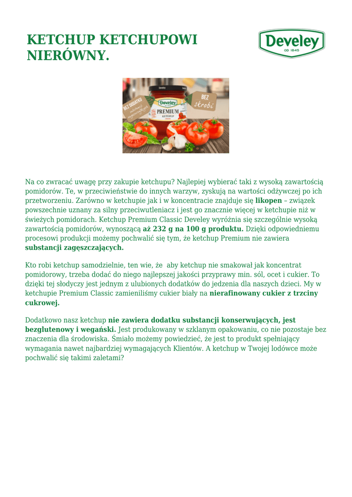 KETCHUP KETCHUPOWI NIERÓWNY. Na co zwracać uwagę przy zakupie ketchupu? Najlepiej wybierać taki z wysoką zawartością pomidorów. Te, w przeciwieństwie do innych warzyw, zyskują na wartości odżywczej po ich przetworzeniu. Zarówno w ketchupie jak i w koncentracie znajduje się likopen – związek powszechnie uznany za silny przeciwutleniacz i jest go znacznie więcej w ketchupie niż w świeżych pomidorach. Ketchup Premium Classic Develey wyróżnia się szczególnie wysoką zawartością pomidorów, wynoszącą aż 232 g na 100 g produktu. Dzięki odpowiedniemu procesowi produkcji możemy pochwalić się tym, że ketchup Premium nie zawiera substancji zagęszczających. Kto robi ketchup samodzielnie, ten wie, że aby ketchup nie smakował jak koncentrat pomidorowy, trzeba dodać do niego najlepszej jakości przyprawy min. sól, ocet i cukier. To dzięki tej słodyczy jest jednym z ulubionych dodatków do jedzenia dla naszych dzieci. My w ketchupie Premium Classic zamieniliśmy cukier biały na nierafinowany cukier z trzciny cukrowej. Dodatkowo nasz ketchup nie zawiera dodatku substancji konserwujących, jest bezglutenowy i wegański. Jest produkowany w szklanym opakowaniu, co nie pozostaje bez znaczenia dla środowiska. Śmiało możemy powiedzieć, że jest to produkt spełniający wymagania nawet najbardziej wymagających Klientów. A ketchup w Twojej lodówce może pochwalić się takimi zaletami?