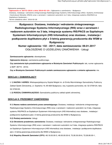 http://bzp0.portal.uzp.gov.pl/index.php?ogloszenie=show&pozycja=1... Ogłoszenie powiązane: Ogłoszenie nr 36772-2016 z dnia 2016-02-18 r. Ogłoszenie o zamówieniu - Bydgoszcz Dostawa, instalacja i wdrożenie zintegrowanego Radiologicznego Systemu Informatycznego (RIS) i Systemu Archiwizacji i Dystrybucji Obrazów (PACS) wraz z serwisem i nadzorem autorskim na 3 lata, integracja systemu RIS/PACS ze Szpitalnym Systemem... Termin składania ofert: 2016-02-26 Bydgoszcz: Dostawa, instalacja i wdrożenie zintegrowanego Radiologicznego Systemu Informatycznego (RIS) wraz z serwisem i nadzorem autorskim na 3 lata, integracja systemu RIS/PACS ze Szpitalnym Systemem Informatycznym (HIS Infomedica) oraz dostawa , instalacja i podłączenie duplikatora płyt z 3-letnią gwarancją producenta dla WSM w Bydgoszczy Numer ogłoszenia: 132 - 2017; data zamieszczenia: 09.01.2017 OGŁOSZENIE O UDZIELENIU ZAMÓWIENIA - Usługi Zamieszczanie ogłoszenia: obowiązkowe. Ogłoszenie dotyczy: zamówienia publicznego. Czy zamówienie było przedmiotem ogłoszenia w Biuletynie Zamówień Publicznych: tak, numer ogłoszenia w BZP: 36772 - 2016r. Czy w Biuletynie Zamówień Publicznych zostało zamieszczone ogłoszenie o zmianie ogłoszenia: nie. SEKCJA I: ZAMAWIAJĄCY I. 1) NAZWA I ADRES: Wielospecjalistyczny Szpital Miejski im. dr Emila Warmińskiego Samodzielny Publiczny Zakład Opieki Zdrowotnej, ul. Szpitalna 19, 85-826 Bydgoszcz, woj. kujawsko-pomorskie, tel. 52 3709124, faks 52 3709125. I. 2) RODZAJ ZAMAWIAJĄCEGO: Samodzielny publiczny zakład opieki zdrowotnej. SEKCJA II: PRZEDMIOT ZAMÓWIENIA II.1) Nazwa nadana zamówieniu przez zamawiającego: Dostawa, instalacja i wdrożenie zintegrowanego Radiologicznego Systemu Informatycznego (RIS) wraz z serwisem i nadzorem autorskim na 3 lata, integracja systemu RIS/PACS ze Szpitalnym Systemem Informatycznym (HIS Infomedica) oraz dostawa , instalacja i podłączenie duplikatora płyt z 3-letnią gwarancją producenta dla WSM w Bydgoszczy. II.2) Rodzaj zamówienia: Usługi. II.3) Określenie przedmiotu zamówienia: Dostawa, instalacja i wdrożenie zintegrowanego Radiologicznego Systemu Informatycznego (RIS) wraz z serwisem i nadzorem autorskim na 3 lata, integracja systemu RIS/PACS ze Szpitalnym Systemem Informatycznym (HIS Infomedica) oraz dostawa , instalacja i podłączenie duplikatora płyt z 3-letnią gwarancją producenta dla WSM w Bydgoszczy. II.4) Wspólny Słownik Zamówień (CPV): 48.18.00.00-3, 48.00.00.00-8, 72.26.30.00-6, 72.26.80.00-1, 1z2 09.01.2017 09:37 http://bzp0.portal.uzp.gov.pl/index.php?ogloszenie=show&pozycja=1... 72.59.00.00-7, 79.63.20.00-3, 30.23.31.53-8. SEKCJA III: PROCEDURA III.1) TRYB UDZIELENIA ZAMÓWIENIA: Przetarg nieograniczony III.2) INFORMACJE ADMINISTRACYJNE Zamówienie dotyczy projektu/programu finansowanego ze środków Unii Europejskiej: nie SEKCJA IV: UDZIELENIE ZAMÓWIENIA IV.1) DATA UDZIELENIA ZAMÓWIENIA: 14.03.2016. IV.2) LICZBA OTRZYMANYCH OFERT: 3. IV.3) LICZBA ODRZUCONYCH OFERT: 0. IV.4) NAZWA I ADRES WYKONAWCY, KTÓREMU UDZIELONO ZAMÓWIENIA: ALTERIS S.A., ul. Ceglana 35, 40-515 Katowice, kraj/woj. śląskie. IV.5) Szacunkowa wartość zamówienia (bez VAT): 159000,00 PLN. IV.6) INFORMACJA O CENIE WYBRANEJ OFERTY ORAZ O OFERTACH Z NAJNIŻSZĄ I NAJWYŻSZĄ CENĄ Cena wybranej oferty: 157410,00 Oferta z najniższą ceną: 157410,00 / Oferta z najwyższą ceną: 197244,03 Waluta: PLN . 2z2 09.01.2017 09:37