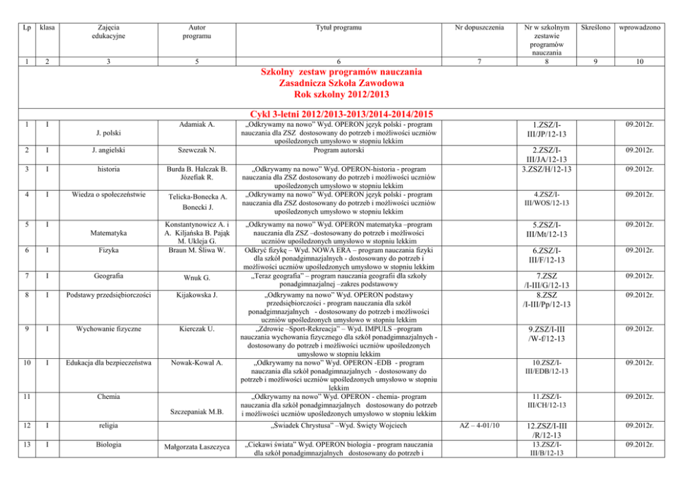 Lp klasa Zajęcia edukacyjne Autor programu Tytuł programu Nr dopuszczenia 1 2 3 5 6 7 Nr w szkolnym zestawie programów nauczania 8 Skreślono wprowadzono 9 10 Szkolny zestaw programów nauczania Zasadnicza Szkoła Zawodowa Rok szkolny 2012/2013 Cykl 3-letni 2012/2013-2013/2014-2014/2015 1 I Adamiak A. J. polski 2 I J. angielski Szewczak N. 3 I historia Burda B. Halczak B. Józefiak R. 4 I Wiedza o społeczeństwie Telicka-Bonecka A. Bonecki J. 5 I 6 I Fizyka Konstantynowicz A. i A. Kiljańska B. Pająk M. Ukleja G. Braun M. Śliwa W. 7 I Geografia Wnuk G. 8 I Podstawy przedsiębiorczości Kijakowska J. 9 I Wychowanie fizyczne Kierczak U. 10 I Edukacja dla bezpieczeństwa Nowak-Kowal A. Matematyka 11 Chemia Szczepaniak M.B. 12 I religia 13 I Biologia „Odkrywamy na nowo” Wyd. OPERON język polski - program nauczania dla ZSZ dostosowany do potrzeb i możliwości uczniów upośledzonych umysłowo w stopniu lekkim Program autorski „Odkrywamy na nowo” Wyd. OPERON-historia - program nauczania dla ZSZ dostosowany do potrzeb i możliwości uczniów upośledzonych umysłowo w stopniu lekkim „Odkrywamy na nowo” Wyd. OPERON język polski - program nauczania dla ZSZ dostosowany do potrzeb i możliwości uczniów upośledzonych umysłowo w stopniu lekkim „Odkrywamy na nowo” Wyd. OPERON matematyka –program nauczania dla ZSZ –dostosowany do potrzeb i możliwości uczniów upośledzonych umysłowo w stopniu lekkim Odkryć fizykę – Wyd. NOWA ERA – program nauczania fizyki dla szkół ponadgimnazjalnych - dostosowany do potrzeb i możliwości uczniów upośledzonych umysłowo w stopniu lekkim „Teraz geografia” – program nauczania geografii dla szkoły ponadgimnazjalnej –zakres podstawowy „Odkrywamy na nowo” Wyd. OPERON podstawy przedsiębiorczości - program nauczania dla szkół ponadgimnazjalnych - dostosowany do potrzeb i możliwości uczniów upośledzonych umysłowo w stopniu lekkim „Zdrowie –Sport-Rekreacja” – Wyd. IMPULS –program nauczania wychowania fizycznego dla szkół ponadgimnazjalnych dostosowany do potrzeb i możliwości uczniów upośledzonych umysłowo w stopniu lekkim „Odkrywamy na nowo” Wyd. OPERON -EDB - program nauczania dla szkół ponadgimnazjalnych - dostosowany do potrzeb i możliwości uczniów upośledzonych umysłowo w stopniu lekkim „Odkrywamy na nowo” Wyd. OPERON - chemia- program nauczania dla szkół ponadgimnazjalnych dostosowany do potrzeb i możliwości uczniów upośledzonych umysłowo w stopniu lekkim „Świadek Chrystusa” –Wyd. Święty Wojciech Małgorzata Łaszczyca „Ciekawi świata” Wyd. OPERON biologia - program nauczania dla szkół ponadgimnazjalnych dostosowany do potrzeb i AZ – 4-01/10 1.ZSZ/IIII/JP/12-13 09.2012r. 2.ZSZ/IIII/JA/12-13 3.ZSZ/H/12-13 09.2012r. 4.ZSZ/IIII/WOS/12-13 09.2012r. 5.ZSZ/IIII/Mt/12-13 09.2012r. 6.ZSZ/IIII/F/12-13 09.2012r. 7.ZSZ /I-III/G/12-13 8.ZSZ /I-III/Pp/12-13 09.2012r. 09.2012r. 09.2012r. 9.ZSZ/I-III /W-f/12-13 09.2012r. 10.ZSZ/IIII/EDB/12-13 09.2012r. 11.ZSZ/IIII/CH/12-13 09.2012r. 12.ZSZ/I-III /R/12-13 09.2012r. 13.ZSZ/IIII/B/12-13 09.2012r. Grażyna Skirmuntt możliwości uczniów upośledzonych umysłowo w stopniu lekkim „Wędrując ku dorosłości” Wychowanie do życia w rodzinie. Program nauczania dla klas I-III szkół ponadgimnazjalnych. Wyd. Rubikon „Odkrywamy na nowo” Wyd. OPERON informatyka –program nauczania dla ZSZ –dostosowany do potrzeb i możliwości uczniów upośledzonych umysłowo w stopniu lekkim PRZEDMIOTY ZAWODOWE KUCHARZ MAŁEJ GASTRONOMII Program nauczania dla zawodu kucharz 512001 14 I Wychowanie do życia w rodzinie Król T. 15 I Informatyka Gawełek A. 1 2 I I 3 4 I I 5 I 6 7 I I Język obcy zawodowy Technologia gastronomiczna z towaroznawstwem Podstawy żywienia człowieka Wyposażenie techniczne zakładów gastronowmicznych Podstawy rachunkowości gastronomicznej Bezpieczeństwo i higiena Kształcenie zawodowe praktyczne 8 I 1 I-II Kucharz 512001 –Program zmodyfikowany na podstawie przykładowego programu nauczania zamieszczonego na stronie internetowej Krajowego Ośrodka Wspierania Edukacji Zawodowej i Ustawicznej WWW.koweziu.edu.pl 14.ZSZ/I-III /Wdż/12-13 09.2012r. 15.ZSZ/IIII/I/12-13 09.2012r. 16.ZSZ/IIII/Pz/12-13 Cykl 2-letni 2011/2012 -2012/2013 Język polski 2 I-II 3 I-II 4 I-II 5 I-II 6 I-II 7 I-II 8 I-II 9 I-II Program opracowany w oparciu o podstawę programową kształcenia ogólnego dla szkół ponadgimnazjalnych Dz.U. 210//2003 poz. 2040 zał. nr 3; Dz. U. 157/2007, poz. 1100, zał. nr 5; (w brzmieniu z Dz. U. 210/2003 zał. nr 3); Dz. U. 159/2008, poz. 992 (lektury)Podręczniki i inne źródła Program nauczania języka angielskiego w Zasadniczej Szkole Zawodowej Program nauczania historii i wiedzy o społeczeństwie w Zasadniczej Szkole Zawodowej Kl. I-II Język angielski Monika i Marcin Mizak Historia i wiedza o społeczeństwie Jarosław Adamski Matematyka Lidia Olszewska Program autorski Fizyka z astronomią Sławomir Ziemicki Fizyka i astronomia. Program nauczania dla zasadniczych szkół zawodowych Geografia z ochroną środowiska B.SienkiewiczDembek A.Kassenberg W.Osuch Geografia z ochroną środowiska Mordecki Podstawy przedsiębiorczości Wychowanie fizyczne Program nauczania geografii z ochroną i kształtowaniem środowiska. Program nauczania ZSZ „Geografia z ochroną i kształtowaniem środowiska”. OPERON Przedsiębiorczość Ewa Czerska Wybierz sam”- Program wychowania fizycznego o profilu rekreacyjno-zdrowotnym dla gimnazjum i liceum. 1.ZSZ/JP/0708 DKOS-5002-73/03 2.ZSZ/JA/0708 DKOS-4015-137/02 3.ZSZ/H/07-08 DKOS 5052-7/ 03 5.ZSZ/Mt/0910 6.ZSZ /I-II/F/07-08 DKOS-4015-210/02 7.ZSZ /I-II/G/07-08 DKOS 354/03 8.ZSZ/III/G/10-11 DKOS-4015-48/02 DKW- 4014-283/99 9.ZSZ /III/Pp/07-08 10.ZSZ /W-f/07-08 09.2012r. 10 I-II Przysposobienie obronne 11 I-II Religia 12 I-II 13 I-II Wychowanie do życia w rodzinie Technologia informacyjna 1 Zbigniew Smutek ks.Jan Szpet Teresa Król, Maria Ryś Ewa Gurbiel,