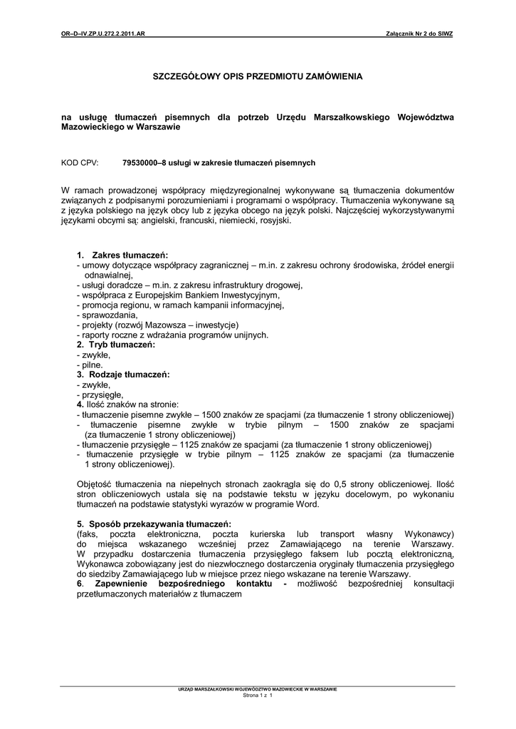 OR–D–IV.ZP.U.272.2.2011.AR Załącznik Nr 2 do SIWZ SZCZEGÓŁOWY OPIS PRZEDMIOTU ZAMÓWIENIA na usługę tłumaczeń pisemnych dla potrzeb Urzędu Marszałkowskiego Województwa Mazowieckiego w Warszawie KOD CPV: 79530000–8 usługi w zakresie tłumaczeń pisemnych W ramach prowadzonej współpracy międzyregionalnej wykonywane są tłumaczenia dokumentów związanych z podpisanymi porozumieniami i programami o współpracy. Tłumaczenia wykonywane są z języka polskiego na język obcy lub z języka obcego na język polski. Najczęściej wykorzystywanymi językami obcymi są: angielski, francuski, niemiecki, rosyjski. 1. Zakres tłumaczeń: - umowy dotyczące współpracy zagranicznej – m.in. z zakresu ochrony środowiska, źródeł energii odnawialnej, - usługi doradcze – m.in. z zakresu infrastruktury drogowej, - współpraca z Europejskim Bankiem Inwestycyjnym, - promocja regionu, w ramach kampanii informacyjnej, - sprawozdania, - projekty (rozwój Mazowsza – inwestycje) - raporty roczne z wdrażania programów unijnych. 2. Tryb tłumaczeń: - zwykłe, - pilne. 3. Rodzaje tłumaczeń: - zwykłe, - przysięgłe, 4. Ilość znaków na stronie: - tłumaczenie pisemne zwykłe – 1500 znaków ze spacjami (za tłumaczenie 1 strony obliczeniowej) - tłumaczenie pisemne zwykłe w trybie pilnym – 1500 znaków ze spacjami (za tłumaczenie 1 strony obliczeniowej) - tłumaczenie przysięgłe – 1125 znaków ze spacjami (za tłumaczenie 1 strony obliczeniowej) - tłumaczenie przysięgłe w trybie pilnym – 1125 znaków ze spacjami (za tłumaczenie 1 strony obliczeniowej). Objętość tłumaczenia na niepełnych stronach zaokrągla się do 0,5 strony obliczeniowej. Ilość stron obliczeniowych ustala się na podstawie tekstu w języku docelowym, po wykonaniu tłumaczeń na podstawie statystyki wyrazów w programie Word. 5. Sposób przekazywania tłumaczeń: (faks, poczta elektroniczna, poczta kurierska lub transport własny Wykonawcy) do miejsca wskazanego wcześniej przez Zamawiającego na terenie Warszawy. W przypadku dostarczenia tłumaczenia przysięgłego faksem lub pocztą elektroniczną, Wykonawca zobowiązany jest do niezwłocznego dostarczenia oryginały tłumaczenia przysięgłego do siedziby Zamawiającego lub w miejsce przez niego wskazane na terenie Warszawy. 6. Zapewnienie bezpośredniego kontaktu - możliwość bezpośredniej konsultacji przetłumaczonych materiałów z tłumaczem URZĄD MARSZAŁKOWSKI WOJEWÓDZTWO MAZOWIECKIE W WARSZAWIE Strona 1 z 1