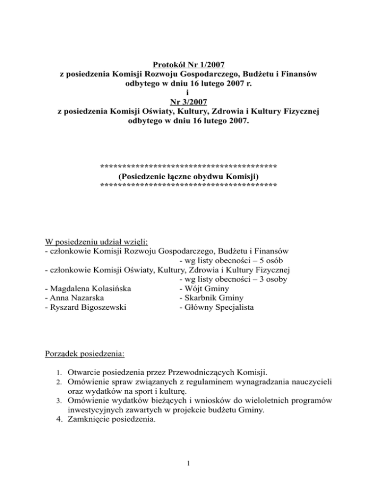 Protokół Nr 1/2007 z posiedzenia Komisji Rozwoju Gospodarczego, Budżetu i Finansów odbytego w dniu 16 lutego 2007 r. i Nr 3/2007 z posiedzenia Komisji Oświaty, Kultury, Zdrowia i Kultury Fizycznej odbytego w dniu 16 lutego 2007. **************************************** (Posiedzenie łączne obydwu Komisji) **************************************** W posiedzeniu udział wzięli: - członkowie Komisji Rozwoju Gospodarczego, Budżetu i Finansów - wg listy obecności – 5 osób - członkowie Komisji Oświaty, Kultury, Zdrowia i Kultury Fizycznej - wg listy obecności – 3 osoby - Magdalena Kolasińska - Wójt Gminy - Anna Nazarska - Skarbnik Gminy - Ryszard Bigoszewski - Główny Specjalista Porządek posiedzenia: 1. Otwarcie posiedzenia przez Przewodniczących Komisji. 2. Omówienie spraw związanych z regulaminem wynagradzania nauczycieli oraz wydatków na sport i kulturę. 3. Omówienie wydatków bieżących i wniosków do wieloletnich programów inwestycyjnych zawartych w projekcie budżetu Gminy. 4. Zamknięcie posiedzenia. 1 Ad 1. Otwarcia posiedzenia dokonali Pan Robert Góra – Przewodniczący Komisji Rozwoju Gospodarczego, Budżetu i Finansów oraz Pani Kamila Chruściel – Przewodnicząca Komisji Oświaty, Kultury, Zdrowia i Kultury Fizycznej. Stwierdzili quorum, a tym samym prawomocność obrad. Ad 2. i Ad 3. Na samym początku posiedzenia Pani Wójt przedstawiła wniosek Koła Gospodyń Wiejskich w Zacywilkach i w Wągrach, które zwróciły się do Gminy o przekazanie środków na dofinansowanie swojej działalności. Powiedziała także o wniosku Ochotniczej Straży Pożarnej w Przyłęku Dużym, która zwróciła się o przekazanie pieniędzy na II ratę ubezpieczenia autobusu oraz wystąpiła o umorzenie I raty podatku od środków transportowych. Powiedziała również o prośbie Rady Sołeckiej Olszy, która zwróciła się o utwardzenie pobocza w miejscowości Mroga Górna. Pan Bigoszewski przedstawił informację na temat negocjacji Wójta z przedstawicielami Związku Nauczycielstwa Polskiego w sprawie regulaminu wynagradzania nauczycieli. Powiedział, że wystąpiły dwa sporne punkty. Pierwszy to sprawa wysokości dodatku za wychowawstwo. Drugi to propozycja ZNP, aby nie obniżać wynagrodzenia nauczycielom, którzy nie podnieśli kwalifikacji zawodowych. Pan Bigoszewski powiedział, że Gmina podtrzymuje stanowisko, iż dodatek za wychowawstwo powinien pozostać na dotychczasowym poziomie 40 zł. ZNP obstaje przy kwocie 50 zł. Spotkanie, które odbyło się 14 lutego nie przyniosło porozumienia, obie strony podtrzymują swoje dotychczasowe stanowiska. Zapadło jedynie ustalenie, iż sprawa ta będzie poddana pod dyskusje na Komisjach Rady Gminy. Pan Bigoszewski dodał też, że dodatek za wychowawstwo został zwiększony w ubiegłym roku z 30 zł na 40 zł. Wzrost wynagrodzeń został zapisany w ustawie budżetowej i jest ustalony na poziomie 5%, tymczasem w związku z coraz mniejszą liczbą dzieci będzie maleć kwota subwencji oświatowej. Głos zabrał Pan Góra i zapytał, co będzie, jeżeli Gmina nie zgodzi się i nie będzie porozumienia ze związkami zawodowymi. Pan Bigoszewski odpowiedział, że bez porozumienia nie można uchwalić regulaminu wynagradzania nauczycieli, gdyż zostanie on uchylony przez wojewodę. Stary regulamin obowiązuje jeszcze przez 3 miesiące od dnia wejście w życie ustawy budżetowej. Pan Zarębski zapytał, dlaczego nauczyciele, którzy mogą odejść na emeryturę ciągle pracują. 2 Pan Bigoszewski odpowiedział, że nie zatrudnia się emerytów. Pracują jedynie te osoby, które kończą swoją pracę. Wyjaśnił też kwestie związane z wynagradzaniem nauczycieli, którzy do końca sierpnia 2006 roku nie uzupełnili wymaganych kwalifikacji. Pan Więciorek zapytał, jakie ustalenia powinny być podjęte w zaistniałej sytuacji. Pani Chruściel zwróciła się o opinię do Pani Wójt. Pani Wójt odpowiedziała, że kolejne spotkania z przedstawicielami związków nic nie dają. Poprosiła Pana Bigoszewskiego o wyjaśnienie, jakie są możliwości działania w takiej sytuacji. Pan Bigoszewski odpowiedział, że jeżeli nie uda się osiągnąć porozumienia jest możliwe podpisanie protokołu rozbieżności, który zostanie przesłany do wojewody wraz z uchwalonym regulaminem wynagradzania nauczycieli. Pani Wójt powiedziała, że skoro radni jednomyślnie opowiadają się przeciwko podwyżce, dodatek należy utrzymać na dotychczasowym poziomie. Głos zabrał Pan Wasilewski i powiedział, że zgadza się z Panem Bigoszewskim. Zaproponował doprowadzenie do spotkania z reprezentantami związku i podpisania choćby protokołu rozbieżności. Pani Chruściel powiedziała, iż rozumie, że końcowym ustaleniem jest kwota 40 zł. Pan Wasilewski zasugerował, aby rozważyć możliwość podjęcia ostatecznej decyzji przez całą Radę. Pani Wójt powiedziała, że może podać informację, która pokaże na różnice w kosztach funkcjonowania oświaty w Gminie Rogów i Gminie Jeżów. Rogów dopłaca do oświaty blisko 1 mln zł natomiast Jeżów 250 tys. zł. Pani Chruściel zwróciła się z pytaniem do Pani Skarbnik, czy jest szansa na znalezienie w budżecie środków w wysokości wnioskowanej przez kluby sportowe. Pan Wasilewski zapytał, czy na finansowanie działalności klubów w projekcie budżetu zaplanowano 40 tys. zł. Pani Skarbik odpowiedziała Panu Wasilewskiemu, że tak. Powiedziała także, iż nie można się skupiać wyłącznie na kwestii finansowania klubów sportowych, bo doszedł jeszcze projekt rozbudowy biblioteki i budowy boiska obok szkoły, który byłby finansowany częściowo ze środków ministerstwa sportu. Pani Skarbnik zwróciła się do Pana Bigoszewskiego o przedstawienie szczegółów. Pan Bigoszewski poinformował radnych, że wnioski muszą być składane do 31 marca a inwestycja ukończona do końca roku. 30% środków daje ministerstwo, ale do kwoty 140 tys. zł., 40% PZU do kwoty 180 