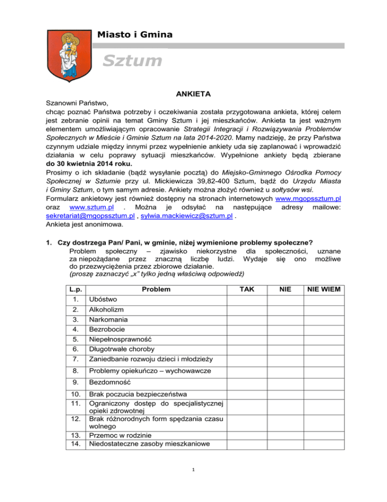 Miasto i Gmina Sztum ANKIETA Szanowni Państwo, chcąc poznać Państwa potrzeby i oczekiwania została przygotowana ankieta, której celem jest zebranie opinii na temat Gminy Sztum i jej mieszkańców. Ankieta ta jest ważnym elementem umożliwiającym opracowanie Strategii Integracji i Rozwiązywania Problemów Społecznych w Mieście i Gminie Sztum na lata 2014-2020. Mamy nadzieję, że przy Państwa czynnym udziale między innymi przez wypełnienie ankiety uda się zaplanować i wprowadzić działania w celu poprawy sytuacji mieszkańców. Wypełnione ankiety będą zbierane do 30 kwietnia 2014 roku. Prosimy o ich składanie (bądź wysyłanie pocztą) do Miejsko-Gminnego Ośrodka Pomocy Społecznej w Sztumie przy ul. Mickiewicza 39,82-400 Sztum, bądź do Urzędu Miasta i Gminy Sztum, o tym samym adresie. Ankiety można złożyć również u sołtysów wsi. Formularz ankietowy jest również dostępny na stronach internetowych www.mgopssztum.pl oraz www.sztum.pl . Można je odsyłać na następujące adresy mailowe: [email protected] , [email protected] . Ankieta jest anonimowa. 1. Czy dostrzega Pan/ Pani, w gminie, niżej wymienione problemy społeczne? Problem społeczny – zjawisko niekorzystne dla społeczności, uznane za niepożądane przez znaczną liczbę ludzi. Wydaje się ono możliwe do przezwyciężenia przez zbiorowe działanie. (proszę zaznaczyć „x” tylko jedną właściwą odpowiedź) L.p. Problem TAK 1. Ubóstwo 2. Alkoholizm 3. 4. Narkomania Bezrobocie 5. 6. Niepełnosprawność Długotrwałe choroby 7. Zaniedbanie rozwoju dzieci i młodzieży 8. Problemy opiekuńczo – wychowawcze 9. Bezdomność 10. 11. Brak poczucia bezpieczeństwa Ograniczony dostęp do specjalistycznej opieki zdrowotnej Brak różnorodnych form spędzania czasu wolnego Przemoc w rodzinie Niedostateczne zasoby mieszkaniowe 12. 13. 14. 1 NIE NIE WIEM 15. Inne – wskaż jakie………………………….. 16. Inne – wskaż jakie………………………….. 2. Jakie są według Pana/Pani najważniejsze problemy społeczne gminy? - prosimy uszeregować od 1 do 3 najważniejsze problemy, (gdzie 1 jest najważniejszym problemem) wykorzystując listę przedstawioną w pytaniu nr 1 Problem 1 ……………………………………………………………………………………………… Problem 2 ……………………………………………………………………………………………… Problem 3 ……………………………………………………………………………………………… 3. Czy czuje się Pan/ Pani bezpieczna na terenie gminy? (proszę zaznaczyć „x” właściwą odpowiedź), a) zdecydowanie tak b) raczej tak c) trudno powiedzieć d) raczej nie e) zdecydowanie nie □ □ □ □ □ 4. Proszę wskazać z niżej wymienionych zagrożeń te, które Pana/Pani zdaniem stanowią największy problem dla mieszkańców Gminy Sztum. Proszę zaznaczyć „x” maksymalnie 2 odpowiedzi), a) b) c) d) e) f) g) h) i) j) k) l) m) n) rozboje, pobicia □ kradzieże □ chuligaństwo, wandalizm □ narkomania □ okupy, haracze □ przestępczość zorganizowana □ włamania do mieszkań □ przemoc wśród nieletnich □ nietrzeźwi kierowcy □ przestępczość nieletnich □ wypadki, kolizje drogowe □ przemoc w rodzinie □ korupcja □ inne zagrożenia jakie………………………………………………………… 5. Jakie problemy społeczne osób starszych uważa Pan/Pani za najważniejsze na terenie gminy? (proszę zaznaczyć „x” maksymalnie 2 odpowiedzi), a) samotność b) ubóstwo c) niepełnosprawność i choroby wieku podeszłego d) niewystarczający dostęp do domów pomocy społecznej e) utrudniony dostęp do opieki medycznej f) brak zorganizowanych form wspólnego spędzania czasu 2 □ □ □ □ □ □ 6. Jakie problemy społeczne osób niepełnosprawnych za najważniejsze na terenie gminy? (proszę zaznaczyć „x” maksymalnie 2 odpowiedzi), uważa a) bariery architektoniczne b) niewystarczający dostęp do placówek rehabilitacyjnych i opiekuńczych c) brak odpowiednich ofert pracy d) izolacja społeczna e) problemy psychologiczne Pan/Pani □ □ □ □ □ 7. Jakie problemy społeczne w obszarze opieki zdrowotnej uważa Pan/Pani za najważniejsze na terenie gminy? (proszę zaznaczyć „x” maksymalnie 2 odpowiedzi), a) długi okres oczekiwania na usługi medyczne b) niska dostępność zakładów opieki zdrowotnej c) mała liczba lekarzy specjalistów d) ograniczona liczba wizyt domowych lekarza u osób przewlekle chorych i niepełnosprawnych □ □ □ □ 8. Jakie problemy społeczne rodzin uważa Pan/Pani za najważniejsze na terenie gminy? (proszę zaznaczyć „x” maksymalnie 2 odpowiedzi), a) nieporadność życiowa b) ubóstwo c) bezrobocie d) alkoholizm e) przemoc f) bezradność opiekuńczo-wychowawcza g) brak poradnictwa psychologiczno-prawnego □ □ □ □ □ □ □ 9. Jakie problemy społeczne dzieci i młodzieży uważa Pan/Pani za najważniejsze na terenie gminy? (proszę zaznaczyć „x” maksymalnie 2 odpowiedzi), a) przemoc ze strony rodziców b) zaniedbanie wychowawcze c) alkohol i papierosy d) narkotyki e) przestępczość f) brak zorganizowanych form spędzania wolnego czasu □ □ □ □ □ □ 10. Jakie problemy społeczne w obszarze edukacji uważa Pan/Pani za najważniejsze na terenie gminy? (proszę zaznaczyć „x” maksymalnie 2 odpowiedzi), a) brak placówek wychowania przedszkolnego b) niewystarczająca liczba zajęć pozalekcyjnych c) brak wykorzystania bazy szkolnej w czasie wolnym od nauki d) niewystarczające wsparcie psychologiczno-pedagogiczne e) niewystarczająca profilaktyka uzależnień wśród dzieci i młodzieży f) brak stołówek szkolnych g) niedostosowanie oferty edukacyjnej do potrzeb rynku pracy 3 □ □ □ □ □ □ □ 11. Jakie problemy społeczne w obszarze kultury, sportu i rekreacji uważa Pan/Pani za najważniejsze na terenie gm