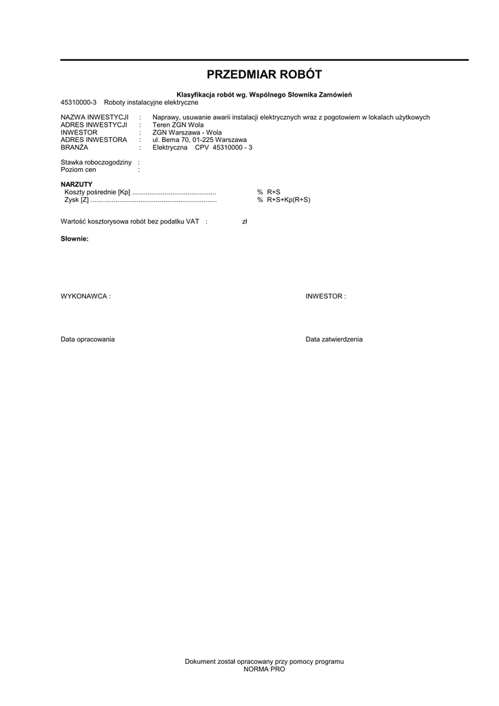 PRZEDMIAR ROBÓT 45310000-3 Klasyfikacja robót wg. Wspólnego Słownika Zamówień Roboty instalacyjne elektryczne NAZWA INWESTYCJI ADRES INWESTYCJI INWESTOR ADRES INWESTORA BRANŻA : : : : : Naprawy, usuwanie awarii instalacji elektrycznych wraz z pogotowiem w lokalach użytkowych Teren ZGN Wola ZGN Warszawa - Wola ul. Bema 70, 01-225 Warszawa Elektryczna CPV 45310000 - 3 Stawka roboczogodziny : Poziom cen : NARZUTY Koszty pośrednie [Kp] ............................................ Zysk [Z] .................................................................. Wartość kosztorysowa robót bez podatku VAT : % R+S % R+S+Kp(R+S) zł Słownie: WYKONAWCA : INWESTOR : Data opracowania Data zatwierdzenia Dokument został opracowany przy pomocy programu NORMA PRO Lp. Podstawa Opis 1 KNR-W 4-03 1201-03 2 KNR-W 4-03 0615-09 Sprawdzenie próbnikiem punktu odbioru energii dla instalacji wtynkowych Wymiana jednoramiennych wysięgników rurowych do 0,9 m oświetlenia zewnętrznego o masie do 15 kg mocowanych na ścianie 3 KNR-W 4-03 Wymiana oprawek do żarówek zwykłych porcelanowych lub metalowych do przykręcania na cegle 0601-03 4 KNR 4-03 Wymiana opraw żarowych hermetycznych kanało0602-04 ana- wych do przykręcania na cegle lub gruzobetonie Naprawa oprawy żarowej logia 5 KNR-W 4-03 Wymiana lub uzupełnienie źródeł światła w oprawach oświetlenia zewnętrznego - uzupełnienie 0616-04 lampy w oprawie rtęciowej - lampy sodowe, samochód wieżowy z balkonem 6 kalkulacja Wymiana kloszy do opraw żarowych hermetyczwłasna (KNR- nych do przykręcania - klosz do opraw żarowych W 4-03 060803 analog) 7 kalkulacja Wymiana kloszy opraw jarzeniowych - klosz do własna (KNR- opraw jarzeniowych W 4-03 060803 analog) 8 KNR 4-03 Wymiana żarowych źródeł światła w oprawach wnętrzowych (zainstalowanych) zwykłych, bryz0608-02 goszczelnych, strugoodpornych, metalowych lub porcelanowych zamkniętych-żarówki 60W 9 KNR 4-03 Wymiana żarowych źródeł światła w oprawach wnętrzowych (zainstalowanych) zwykłych, bryz0608-02 goszczelnych, strugoodpornych, metalowych lub porcelanowych zamkniętych-żaeówki 75 W 10 KNR-W 4-03 Wymiana opraw żarowych hermetycznych kanałowych OPKZ 60 do przykręcania na cegle 0602-04 11 KNR-W 4-03 Wymiana opraw żarowych WOS 60 bez specjalnych zabezpieczeń ściennych lub sufitowych na 0603-03 cegle lub gruzobetonie 12 KNR-W 4-03 Wymiana opraw żarowych WOS 100 bez specjalnych zabezpieczeń ściennych lub sufitowych na 0603-03 cegle lub gruzobetonie 13 KNR-W 4-03 Wymiana opraw żarowych hermetycznych porcelanowych do przykręcania na cegle 0602-03 14 KNR 4-03 Wymiana swietlówek w oprawach wnętrzowych (zainstalowanych) świetlówkowych zamkniętych i 0608-09 belek montażowych metalowych i z tworzyw sztucznych-pierwsza - Świetlówka LF 36W 15 KNR 4-03 Wymiana swietlówek w oprawach wnętrzowych (zainstalowanych) świetlówkowych i belek monta0608-10 żowych metalowych i z tworzyw sztucznych - każda następna - Świetlówka LF 36W 16 KNR 4-03 Wymiana opraw świetlówkowych z blachy stalowej z kloszem z tworzyw sztucznych lub rastrem 0606-01 metalowym względnie z tworzyw szt. 1x20 W 17 KSNR 9 Wymiana opraw oświetleniowych świetlówkowych ruchu 1 x 20W 0501-02 18 KNR 4-03 Wymiana opraw świetlówkowych z blachy stalowej z kloszem z tworzyw sztucznych lub rastrem 0606-02 metalowym względnie z tworzyw szt. 2x20 W 19 KNR-W 4-03 Wymiana opraw świetlówkowych 2x36 W 0606-05 analogia 20 KNR 4-03 Wymiana opraw świetlówkowych z blachy stalowej z kloszem z tworzyw sztucznych lub rastrem 0606-04 metalowym względnie z tworzyw szt. 1x40 W 21 KNR-W 4-03 Wymiana opraw świetlówkowych 2x40 W 0606-05 -2- Norma PRO Wersja 4.43 Nr seryjny: 27173 Jedn. przedm. pkt. Ilość 2.0 szt. 1.0 kpl. 3.0 szt. 2.0 szt. 1.0 szt. 3.0 kpl. 2.0 szt. 5.0 szt. 6.0 kpl. 2.0 kpl. 4.0 kpl. 2.0 kpl. 2.0 szt. 3.0 szt. 4.0 szt. 2.0 szt. 2.0 szt. 3.0 kpl. 3.0 szt. 2.0 kpl. 3.0 Cena jedn. Wartość Lp. Podstawa Opis 22 KNR 4-03 Wymiana opraw świetlówkowych z blachy stalo0606-05 ana- wej z kloszem z tworzyw sztucznych lub rastrem metalowym względnie z tworzyw szt. 2x40 W log Naprawa oprawy świetlówkowej 23 KNR 4-03 Wymiana swietlówek w oprawach wnętrzowych (zainstalowanych) świetlówkowych zamkniętych i 0608-09 belek montażowych metalowych i z tworzyw sztucznych-pierwsza - świetlówki 58W' 24 KNR-W 4-03 Wymiana opraw oświetleniowych w sufitach podwieszanych - oprawa świetlówkowa 4 x 18 W 0609-03 25 KNR 4-03 Wymiana swietlówek w oprawach wnętrzowych (zainstalowanych) świetlówkowych i belek monta0608-10 żowych metalowych i z tworzyw sztucznych - każda następna - świetlówki 58W' 26 KNR 4-03 Wymiana swietlówek kompaktowych w oprawach wnętrzowych (zainstalowanych) świetlówkowych 0608-09 zamkniętych i belek montażowych metalowych i z tworzyw sztucznych-pierwsza - świetlówki kompaktowe' 36W 27 KNR 4-03 Wymiana swietlówek kompaktowych w oprawach wnętrzowych (zainstalowanych) świetlówkowych i 0608-10 belek montażowych metalowych i z tworzyw sztucznych - każda następna - świetlówki kompaktowe 36W 28 KNR 4-03 Wymiana swietlówek w oprawach wnętrzowych (zainstalowanych) świetlówkowych zamkniętych i 0608-09 belek montażowych metalowych i z tworzyw sztucznych-pierwsza - świetlówki 18W' 29 KNR 4-03 Wymiana swietlówek w oprawach wnętrzowych (zainstalowanych) świetlówkowych i belek monta0608-10 żowych metalowych i z tworzyw sztucznych - każda następna - świetlówki 18W' 30 KNR 4-03 Wymiana swietlówek w oprawach wnętrzowych (zainstalowanych) świetlówkowych otwartych i be0608-08 lek montażowych metalowych i z tworzyw sztucznych-pierwsza-świetlówki 36W 31 KNR 4-03 Wymiana swietlówek w oprawach wnętrzowych (zainstalowanych) świetlówkowych i belek monta0608-10 żowych metalowych i z tworzyw sztucznych - każda następna-świetlówki 36W 32 KNR 4-03 Wymiana opraw świetlówkowych z blachy stalowej z kloszem z tworzyw sztucznych lub rastrem 0606-04 metalowym wzgl