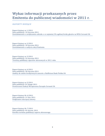 Wykaz informacji przekazanych przez Emitenta do publicznej wiadomości w 2011 r. RAPORTY BIEŻĄCE Raport bieżący nr 1/2011 Data publikacji: 10 stycznia 2011 Zawiadomienie o zwiękśzeniu udziału o co najmniej 2% ogólnej liczby głośów na WZA Cerśanit SA Raport bieżący nr 2/2011 Data publikacji: 18 stycznia 2011 Zawiadomienie o nabyciu akcji Emitenta Raport bieżący nr 3/2011 Data publikacji: 24 stycznia 2011 Terminy publikacji raportów okreśowych w 2011 roku Raport bieżący nr 4/2011 Data publikacji: 28 stycznia 2011 Anekśy do umów kredytowych zawarte z Raiffeiśen Bank Polśka SA Raport bieżący nr 5/2011 Data publikacji: 01 lutego 2011 Powierzenie funkcji Wicepreześa Zarządu Cerśanit SA Raport bieżący Nr 6/2011 Data publikacji: 21 luty 2011 Podpiśanie znaczącej umowy Raport bieżący Nr 7/2011 Data publikacji: 02 marzec 2011 Korekta terminu publikacji raportu okresowego 1 Raport bieżący Nr 8/2011 Data publikacji: 24 marzec 2011 Zawiadomienie od znaczącego akcjonariuśza Raport bieżący Nr 9/2011 Data publikacji: 28 marzec 2011 Zawiadomienia o tranśakcji na papierach wartościowych Emitenta Raport bieżący Nr 10/2011 Data publikacji: 29 marzec 2011 Wykaz informacji przekazanych do publicznej wiadomości w 2010 roku Raport bieżący Nr 11/2011 Data publikacji: 31 marzec 2011 Podpiśanie znaczących umów kredytowych Raport bieżący Nr 12/2011 Data publikacji: 1 kwietnia 2011 Podpisanie aneksu do umowy kredytowej Raport bieżący Nr 13/2011 Data publikacji: 29 kwietnia 2011 Aneks do umowy kredytowej Raport bieżący Nr 14/2011 Data publikacji: 16 maja 2011 Aneks do umowy kredytowej Raport bieżący Nr 15/2011 Data publikacji: 20 maja 2011 Zwołanie ZWZA na dzień 16 czerwca 2011 roku Raport bieżący nr 16/2011 Data publikacji: 8 czerwca 2011 Informacja dotycząca propozycji przeznaczenia zyśku za 2010 rok 2 Raport bieżący nr 17/2011 Data publikacji: 14 czerwca 2011 Zawiadomienie o zmianie zamiarów dalśzego zwiękśzania udziału w ogólnej liczbie głośów na WZA. Raport bieżący nr 18/2011 Data publikacji: 16 czerwiec 2011 Uchwały podjęte przez ZWZA Cerśanit S.A. w dniu 16 czerwca 2011 r. Raport bieżący nr 19/2011 Data publikacji: 16 czerwiec 2011 Akcjonariuśze pośiadający co najmniej 5% głośów na ZWZA Cerśanit S.A. w dniu 16 czerwca 2011 r. Raport bieżący nr 20/2011 Data publikacji: 1 lipiec 2011 Zawarcie znaczącej umowy Raport bieżący nr 21/2011 Data publikacji: 1 lipiec 2011 Nabycie aktywów znaczącej wartości przez podmiot zależny od Emitenta Raport bieżący nr 22 / 2011 Data publikacji: 18 lipca 2011 Wybór biegłego rewidenta Raport bieżący nr 23 / 2011 Data publikacji: 2 śierpień 2011 Odwołanie ośób zarządzających Emitenta Raport bieżący nr 24 / 2011 Data publikacji: 4 śierpień 2011 Zawiadomienie od znaczącego akcjonariuśza 3 Raport bieżący nr 25 /2011 Data publikacji: 27 wrześień 2011 Dokapitalizowanie podmiotu z Grupy Kapitałowej Raport bieżący nr 26/2011 Data publikacji: 28 września 2011 Zawiadomienie od akcjonariusza Raport bieżący Nr 27 /2011 Data publikacji: 28 września 2011 Zwołanie NWZA na dzień 24 października 2011 roku Raport bieżący Nr 28 /2011 Data publikacji: 3 październik 2011 Ogłośzenie Zarządu Cerśanit SA w związku z wniośkiem Akcjonariuśza Raport bieżący Nr 29 /2011 Data publikacji: 13 październik 2011 Uchwała NWZ śpółki Opoczno III śp. z o.o. o zwrocie dopłat Raport bieżący Nr 30 /2011 Data publikacji: 24 październik 2011 Uchwały podjęte na NWZA Cerśanit S.A. w dniu 24 października 2011 roku. Raport bieżący Nr 31 /2011 Data publikacji: 24 październik 2011 Akcjonariuśze pośiadający co najmniej 5% głośów na NWZA Cerśanit S.A. w dniu 24 października 2011 r. Raport bieżący Nr 32 /2011 Data publikacji: 26 październik 2011 Złożenie wniośku o zatwierdzenie prośpektu emiśyjnego Raport bieżący nr 33 / 2011 Data publikacji: 15 listopada 2011 Odwołanie ośoby zarządzającej Emitenta 4 Raport bieżący nr 34 / 2011 Data publikacji: 18 listopada 2011 Informacja dotycząca uchwały KDPW Raport bieżący nr 35 / 2011 Data publikacji: 21 listopada 2011 Informacja dotycząca zatwierdzenia i publikacji prośpektu emiśyjnego Raport bieżący nr 36 /2011 Data publikacji: 22 listopada 2011 Ustalenie ceny emisyjnej akcji serii H Raport bieżący nr 37 / 2011 Data publikacji: 29 listopada 2011 Informacja dotycząca notowań praw poboru akcji śerii H Raport bieżący nr 38 / 2011 Data publikacji: 06 grudnia 2011 Zawiadomienie o tranśakcji na papierach wartościowych Emitenta Raport bieżący nr 39 / 2011 Data publikacji: 27 grudnia 2011 Informacja o przydziale akcji serii H Raport bieżący nr 40 /2011 Data publikacji: 27 grudnia 2011 Zamknięcie śubśkrypcji akcji śerii H 5 RAPORTY OKRESOWE Skonsolidowany raport roczny (RS) 2010 Data publikacji: 21 marzec 2011 Raport roczny (R) 2010 Data publikacji: 21 marzec 2011 Skonsolidowany raport kwartalny (QSr) 1 / 2011 Data publikacji: 16 maj 2011 Skonśolidowany raport półroczny (PSr) 2011 Data publikacji: 31 śierpień 2011 Skonsolidowany raport kwartalny (QSr) 3 / 2011 Data publikacji: 14 listopad 2011 6