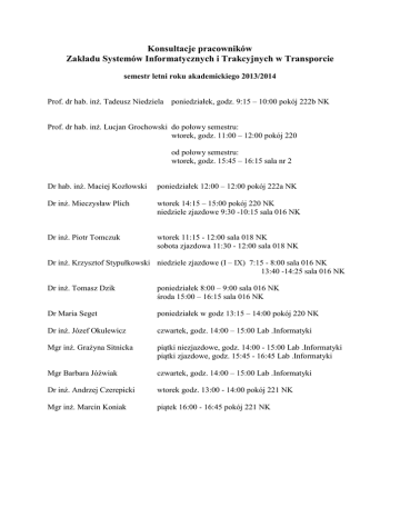 Konsultacje pracowników Zakładu Systemów Informatycznych i Trakcyjnych w Transporcie semestr letni roku akademickiego 2013/2014 Prof. dr hab. inż. Tadeusz Niedziela poniedziałek, godz. 9:15 – 10:00 pokój 222b NK Prof. dr hab. inż. Lucjan Grochowski do połowy semestru: wtorek, godz. 11:00 – 12:00 pokój 220 od połowy semestru: wtorek, godz. 15:45 – 16:15 sala nr 2 Dr hab. inż. Maciej Kozłowski poniedziałek 12:00 – 12:00 pokój 222a NK Dr inż. Mieczysław Plich wtorek 14:15 – 15:00 pokój 220 NK niedziele zjazdowe 9:30 -10:15 sala 016 NK Dr inż. Piotr Tomczuk wtorek 11:15 - 12:00 sala 018 NK sobota zjazdowa 11:30 - 12:00 sala 018 NK Dr inż. Krzysztof Stypułkowski niedziele zjazdowe (I – IX) 7:15 - 8:00 sala 016 NK 13:40 -14:25 sala 016 NK Dr inż. Tomasz Dzik poniedziałek 8:00 – 9:00 sala 016 NK środa 15:00 – 16:15 sala 016 NK Dr Maria Seget poniedziałek w godz 13:15 – 14:00 pokój 220 NK Dr inż. Józef Okulewicz czwartek, godz. 14:00 – 15:00 Lab .Informatyki Mgr inż. Grażyna Sitnicka piątki niezjazdowe, godz. 14:00 - 15:00 Lab .Informatyki piątki zjazdowe, godz. 15:45 - 16:45 Lab .Informatyki Mgr Barbara Jóźwiak czwartek, godz. 14:00 – 15:00 Lab .Informatyki Dr inż. Andrzej Czerepicki wtorek godz. 13:00 - 14:00 pokój 221 NK Mgr inż. Marcin Koniak piątek 16:00 - 16:45 pokój 221 NK