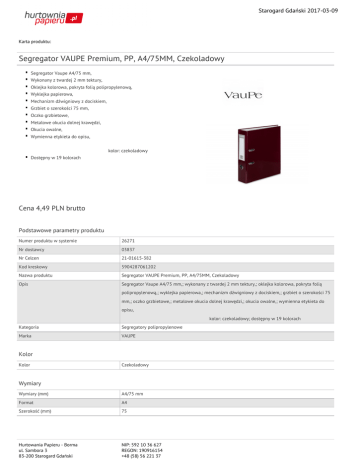 Starogard Gdański 2017-03-09 Karta produktu: Segregator VAUPE Premium, PP, A4/75MM, Czekoladowy Segregator Vaupe A4/75 mm, Wykonany z twardej 2 mm tektury, Oklejka kolorowa, pokryta folią polipropylenową, Wyklejka papierowa, Mechanizm dźwigniowy z dociskiem, Grzbiet o szerokości 75 mm, Oczko grzbietowe, Metalowe okucia dolnej krawędzi, Okucia owalne, Wymienna etykieta do opisu, kolor: czekoladowy Dostępny w 19 kolorach Cena 4,49 PLN brutto Podstawowe parametry produktu Numer produktu w systemie 26271 Nr dostawcy 03837 Nr Celcen 21-01615-382 Kod kreskowy 5904287061202 Nazwa produktu Segregator VAUPE Premium, PP, A4/75MM, Czekoladowy Opis Segregator Vaupe A4/75 mm,; wykonany z twardej 2 mm tektury,; oklejka kolorowa, pokryta folią polipropylenową,; wyklejka papierowa,; mechanizm dźwigniowy z dociskiem,; grzbiet o szerokości 75 mm,; oczko grzbietowe,; metalowe okucia dolnej krawędzi,; okucia owalne,; wymienna etykieta do opisu, kolor: czekoladowy; dostępny w 19 kolorach Kategoria Segregatory polipropylenowe Marka VAUPE Kolor Kolor Czekoladowy Wymiary Wymiary (mm) A4/75 mm Format A4 Szerokość (mm) 75 Hurtowania Papieru - Borma ul. Sambora 3 83-200 Starogard Gdański NIP: 592 10 36 627 REGON: 190916154 +48 (58) 56 221 37 Starogard Gdański 2017-03-09 Karta katalogowa produktu cd. Segregator VAUPE Premium, PP, A4/75MM, Czekoladowy Cecha Okleina Kolorowa, pokryta folią polipropylenową Etykieta Wymienna do opisu Typ Sztuka Kieszenie Na grzbiecie Rodzaj Okleinowane Produkt Segregator Certyfikaty Nowy produkt w ofercie Standard Hit Standard Pozostałe zdjęcia produktu Serdecznie zapraszamy do współpracy Hurtowania Papieru - Borma zespół. Hurtowania Papieru - Borma ul. Sambora 3 83-200 Starogard Gdański NIP: 592 10 36 627 REGON: 190916154 +48 (58) 56 221 37