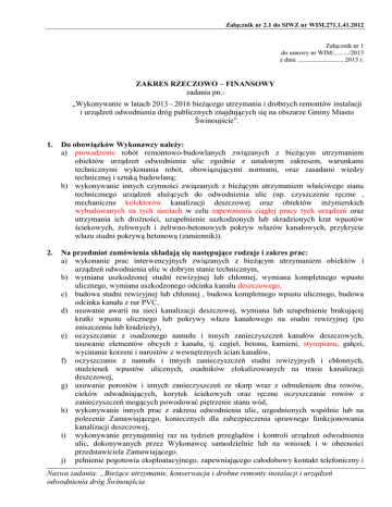 Załącznik nr 2.1 do SIWZ nr WIM.271.1.41.2012 Załącznik nr 1 do umowy nr WIM/........./2013 z dnia ............................ 2013 r. ZAKRES RZECZOWO – FINANSOWY zadania pn.: „Wykonywanie w latach 2013 - 2016 bieżącego utrzymania i drobnych remontów instalacji i urządzeń odwodnienia dróg publicznych znajdujących się na obszarze Gminy Miasto Świnoujście”. 1. Do obowiązków Wykonawcy należy: a) prowadzenie robót remontowo-budowlanych związanych z bieżącym utrzymaniem obiektów urządzeń odwodnienia ulic zgodnie z ustalonym zakresem, warunkami technicznymi wykonania robót, obowiązującymi normami, oraz zasadami wiedzy technicznej i sztuką budowlaną; b) wykonywanie innych czynności związanych z bieżącym utrzymaniem właściwego stanu technicznego urządzeń służących do odwodnienia ulic (np. czyszczenie ręczne , mechaniczne kolektorów kanalizacji deszczowej oraz obiektów inżynierskich wybudowanych na tych sieciach w celu zapewnienia ciągłej pracy tych urządzeń oraz utrzymania ich drożności, uzupełnienie uszkodzonych lub skradzionych krat wpustów ściekowych, żeliwnych i żeliwno-betonowych pokryw włazów kanałowych, przykrycie włazu studni pokrywą betonową (zamiennik)). 2. Na przedmiot zamówienia składają się następujące rodzaje i zakres prac: a) wykonanie prac interwencyjnych związanych z bieżącym utrzymaniem obiektów i urządzeń odwodnienia ulic w dobrym stanie technicznym, b) wymiana uszkodzonej studni rewizyjnej lub chłonnej, wymiana kompletnego wpustu ulicznego, wymiana uszkodzonego odcinka kanału deszczowego, c) budowa studni rewizyjnej lub chłonnej , budowa kompletnego wpustu ulicznego, budowa odcinka kanału z rur PVC, d) usuwanie awarii na sieci kanalizacji deszczowej, wymiana lub uzupełnienie brakującej kratki wpustu ulicznego lub pokrywy włazu kanałowego na studni rewizyjnej (po zniszczeniu lub kradzieży), e) oczyszczanie z osadzonego namułu i innych zanieczyszczeń kanałów deszczowych, usuwanie elementów obcych z kanału, tj. cegieł, betonu, kamieni, styropianu, gałęzi, wycinanie korzeni i narostów z wewnętrznych ścian kanałów, f) oczyszczanie z namułu i innych zanieczyszczeń studni rewizyjnych i chłonnych, studzienek wpustów ulicznych, osadników zlokalizowanych na trasie kanalizacji deszczowej, g) usuwanie porostów i innych zanieczyszczeń ze skarp wraz z odmuleniem dna rowów, cieków odwadniających, korytek ściekowych oraz ręczne oczyszczanie rowów z zanieczyszczeń mogących powodować piętrzenie stanu wód, h) wykonywanie innych prac z zakresu odwodnienia ulic, uzgodnionych wspólnie lub na polecenie Zamawiającego, koniecznych dla zabezpieczenia sprawnego funkcjonowania kanalizacji deszczowej, i) wykonywanie przynajmniej raz na tydzień przeglądów i kontroli urządzeń odwodnienia ulic, dokonywanych przez Wykonawcę samodzielnie lub na wniosek i w obecności przedstawiciela Zamawiającego. j) pełnienie pogotowia eksploatacyjnego, zapewniającego całodobowy kontakt telefoniczny i Nazwa zadania: „Bieżące utrzymanie, konserwacja i drobne remonty instalacji i urządzeń odwodnienia dróg Świnoujścia Załącznik nr 2.1 do SIWZ nr WIM.271.1.41.2012 za pośrednictwem faxu, w dni robocze i w dni wolne od pracy, 3. Ponadto w kalkulacjach należy przewidzieć koszty obejmujące wszystkie roboty przygotowawcze i towarzyszące, a także inne koszty związane z realizacją zamówienia, np. a) koszty prowadzenia dokumentacji i rozliczenia robót, b) koszty niezbędnej podczas robót organizacji ruchu drogowego, c) koszty zabezpieczenia i oznakowania robót, d) koszty związane z załadunkiem i dowozem materiałów z magazynu na miejsce budowy (dotyczy to również dowozu z magazynu Zamawiającego), e) koszty składowania i zabezpieczenia materiałów własnych, f) koszty związane z koniecznością częstych zmian miejsca wykonywania robót, g) koszty związane z opracowywaniem i uzgadnianiem dokumentacji organizacji ruchu na czas prowadzenia robót, h) koszty związane z pełnieniem całodniowego dyżuru i dyspozycyjności w dni robocze i w dni wolne od pracy. 4. Szczegółowy zakres czynności i prac objętych zamówieniem wyszczególnionych w „Tabeli wycenionych elementów robót.” 4.1. Wymiana uszkodzonej studni rewizyjnej lub chłonnej obejmuje: oznakowanie miejsca robót, miejscowe rozebranie nawierzchni, wykonanie wykopu i demontaż uszkodzonych elementów studni, montaż nowych elementów studni i podłączenie (kanałów) przykanalików, regulacja wysokościowa włazu studni, zasypanie i zagęszczenie wykopu, odtworzenie nawierzchni (bez odtworzenia nawierzchni bitumicznej), wywóz powstałego gruzu do Stacji Przeładunkowej Odpadów. 4.2. Budowa nowej studni rewizyjnej lub chłonnej obejmuje: oznakowanie miejsca robót, miejscowe rozebranie nawierzchni, wykonanie wykopu (bez kosztów odwodnienia wykopu), montaż nowych elementów studni i podłączenie (kanałów) przykanalików, regulacja wysokościowa włazu studni, zasypanie i zagęszczenie wykopu, odtworzenie nawierzchni (bez odtworzenia nawierzchni bitumicznej), wywóz powstałego gruzu do Stacji Przeładunkowej Odpadów. 4.3. Wymiana uszkodzonego wpustu ulicznego: oznakowanie miejsca robót, miejscowe rozebranie nawierzchni, wykonanie wykopu i demontaż uszkodzonych elementów wpustu (w tym studzienki), montaż nowych elementów wpustu (w tym studzienki) i podłączenie przykanalików, regulacja wysokościowa wpustu ulicznego, zasypanie i zagęszczenie wykopu, odtworzenie nawierzchni (bez odtworzenia nawierzchni bitumicznej), wywóz powstałego gruzu do Stacji Przeładunkowej Odpadów. 4.4. Budowa nowego wpustu ulicznego obejmuje : oznakowanie miejsca robót, miejscowe rozebranie nawierzchni, Nazwa zadania: „Bieżące utrzymanie, konserwacja i drobne remonty instalacji i urządzeń odwodnienia dróg Świnoujścia Załącznik nr 2.1 do SIWZ nr WIM.271.1.41.2012 wykonanie wykopu (bez kosztów odwodnienia wykop