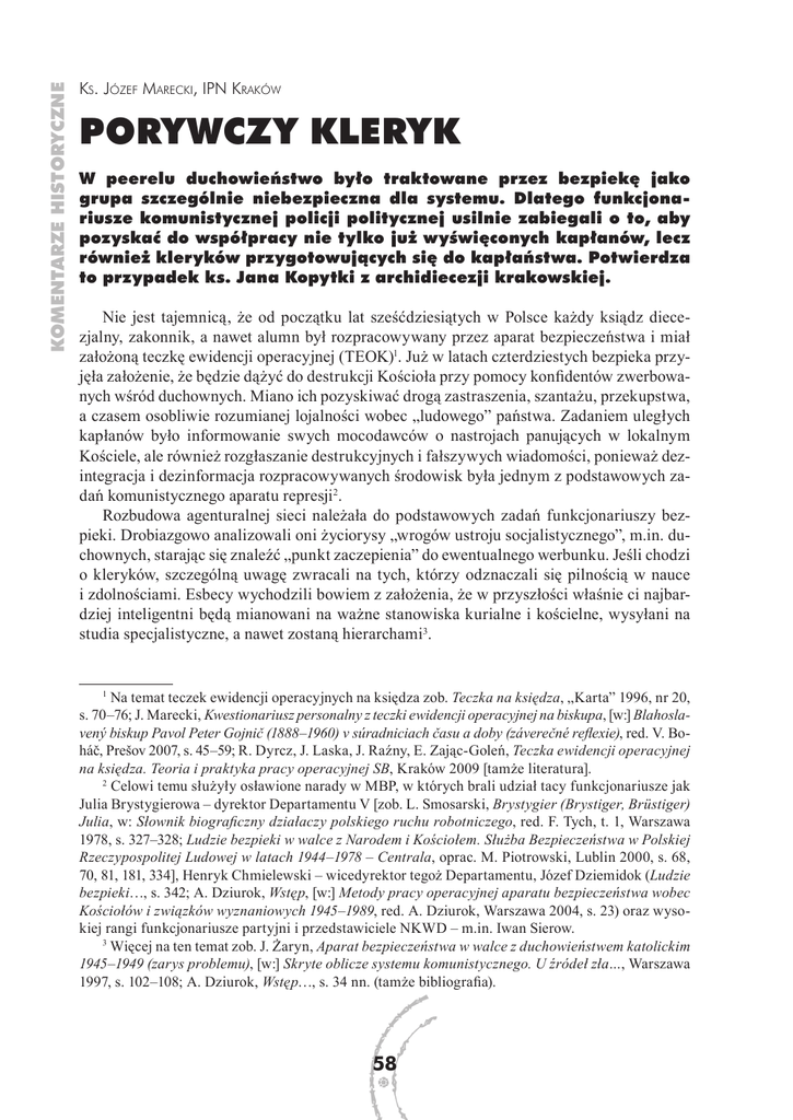 komentarze historyczne Ks. Józef Marecki, IPN Kraków Porywczy kleryk W peerelu duchowieństwo było traktowane przez bezpiekę jako grupa szczególnie niebezpieczna dla systemu. Dlatego funkcjonariusze komunistycznej policji politycznej usilnie zabiegali o to, aby pozyskać do współpracy nie tylko już wyświęconych kapłanów, lecz również kleryków przygotowujących się do kapłaństwa. Potwierdza to przypadek ks. Jana Kopytki z archidiecezji krakowskiej. Nie jest tajemnicą, że od początku lat sześćdziesiątych w Polsce każdy ksiądz diecezjalny, zakonnik, a nawet alumn był rozpracowywany przez aparat bezpieczeństwa i miał założoną teczkę ewidencji operacyjnej (TEOK). Już w latach czterdziestych bezpieka przyjęła założenie, że będzie dążyć do destrukcji Kościoła przy pomocy konfidentów zwerbowanych wśród duchownych. Miano ich pozyskiwać drogą zastraszenia, szantażu, przekupstwa, a czasem osobliwie rozumianej lojalności wobec „ludowego” państwa. Zadaniem uległych kapłanów było informowanie swych mocodawców o nastrojach panujących w lokalnym Kościele, ale również rozgłaszanie destrukcyjnych i fałszywych wiadomości, ponieważ dezintegracja i dezinformacja rozpracowywanych środowisk była jednym z podstawowych zadań komunistycznego aparatu represji. Rozbudowa agenturalnej sieci należała do podstawowych zadań funkcjonariuszy bezpieki. Drobiazgowo analizowali oni życiorysy „wrogów ustroju socjalistycznego”, m.in. duchownych, starając się znaleźć „punkt zaczepienia” do ewentualnego werbunku. Jeśli chodzi o kleryków, szczególną uwagę zwracali na tych, którzy odznaczali się pilnością w nauce i zdolnościami. Esbecy wychodzili bowiem z założenia, że w przyszłości właśnie ci najbardziej inteligentni będą mianowani na ważne stanowiska kurialne i kościelne, wysyłani na studia specjalistyczne, a nawet zostaną hierarchami. Na temat teczek ewidencji operacyjnych na księdza zob. Teczka na księdza, „Karta” 1996, nr 20, s. 70–76; J. Marecki, Kwestionariusz personalny z teczki ewidencji operacyjnej na biskupa, [w:] Blahoslavený biskup Pavol Peter Gojnič (1888–1960) v súradniciach času a doby (záverečné reflexie), red. V. Boháč, Prešov 2007, s. 45–59; R. Dyrcz, J. Laska, J. Raźny, E. Zając-Goleń, Teczka ewidencji operacyjnej na księdza. Teoria i praktyka pracy operacyjnej SB, Kraków 2009 [tamże literatura]. Celowi temu służyły osławione narady w MBP, w których brali udział tacy funkcjonariusze jak Julia Brystygierowa – dyrektor Departamentu V [zob. L. Smosarski, Brystygier (Brystiger, Brüstiger) Julia, w: Słownik biograficzny działaczy polskiego ruchu robotniczego, red. F. Tych, t. 1, Warszawa 1978, s. 327–328; Ludzie bezpieki w walce z Narodem i Kościołem. Służba Bezpieczeństwa w Polskiej Rzeczypospolitej Ludowej w latach 1944–1978 – Centrala, oprac. M. Piotrowski, Lublin 2000, s. 68, 70, 81, 181, 334], Henryk Chmielewski – wicedyrektor tegoż Departamentu, Józef Dziemidok (Ludzie bezpieki…, s. 342; A. Dziurok, Wstęp, [w:] Metody pracy operacyjnej aparatu bezpieczeństwa wobec Kościołów i związków wyznaniowych 1945–1989, red. A. Dziurok, Warszawa 2004, s. 23) oraz wysokiej rangi funkcjonariusze partyjni i przedstawiciele NKWD – m.in. Iwan Sierow. Więcej na ten temat zob. J. Żaryn, Aparat bezpieczeństwa w walce z duchowieństwem katolickim 1945–1949 (zarys problemu), [w:] Skryte oblicze systemu komunistycznego. U źródeł zła…, Warszawa 1997, s. 102–108; A. Dziurok, Wstęp…, s. 34 nn. (tamże bibliografia). 58 Adam Turotszy (ur. 21 VIII 1940), mgr prawa UJ; przyjęty do MO/SB 15 II 1964 r.; w 1983 r. otrzymał stopień ppłk. Z dniem 31 VII 1990 zwolniony ze służby. Zob. IPN Kr 39/64341. Ks. Jan Kopytko (ur. 25 III 1949 r. w Kluszkowcach), kapłan archidiecezji krakowskiej, święcenia kapłańskie otrzymał w 1974 r. w Nowym Targu z rąk kard. Karola Wojtyły. Kształcił się w rodzinnej miejscowości (1956–1963), później w Liceum Pedagogicznym w Zakopanem (1963–1968) oraz w WSD w Krakowie (1968–1974). Kolejno pracował jako wikariusz parafii w Mucharzu (1974–1976), Poroninie (1976–1979), Cięcinie (1979–1984) i Babicach (1984–1988), a następnie jako proboszcz parafii w Długoszynie (1988) i w Paczółtowicach (od 1988). Dziekan dekanatu krzeszowickiego (od 1997). Na temat planów pozyskania kleryka J. Kopytki zob. T. Isakowicz-Zaleski, Księża wobec bezpieki na przykładzie archidiecezji krakowskiej, Kraków 207, s. 210–211. IPN Kr 009/8510, k. 6, Wniosek o opracowanie, Nowy Targ, 14 XI 1970 r. We wszystkich cytatach pochodzących z dokumentów zachowuję oryginalną pisownię. 59 komentarze historyczne Kandydat na TW ps. „Pedagog” Starszy inspektor RSB w Nowym Targu, por. Adam Turotszy, 14 listopada 1970 r. przygotował wniosek o opracowanie kandydata na tajnego współpracownika. Miał nim zostać kleryk trzeciego roku Wyższego Metropolitarnego Seminarium Duchownego Jan Kopytko. Swój wniosek Turotszy uzasadnił, stwierdzając m.in., że Kopytko „[...] tkwi w rozpracowywanym przez nas środowisku seminaryjnym, posiada bezpośrednie dotarcie do osób pozostającym w naszym zainteresowaniu i ma możliwości realizowania zadań w stosunku do nas”. Następnie Turotszy przedstawił szczegółowy harmonogram realizacji swoich planów. Pisał: „Dokonać wszechstronnego rozpoznania osobowości, cech charakteru kandydata, usposobienie, nałogi, skłonności do prowadzenia życia świeckiego. Zebra[ć] dane dotyczące pobytu kandydata w seminarium przede wszystkim: stosunek do przełożonych, regulaminu, trudności, prezentowane poglądy, postawy. Powyższe przedsięwzięcia zrealizowane zostaną poprzez: od obywateli, możliwości operacyjne pozostających do dyspozycji SB, kontaktów operacyjnych posiadających dotarcie do kandydata w m[iejscu] zamieszkania: – wykorzystanie do uzyskania danych rozmów 