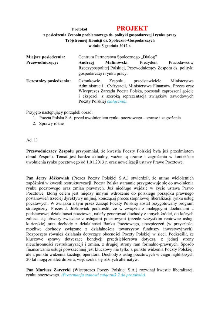 PROJEKT Protokoł z posiedzenia Zespołu problemowego ds. polityki gospodarczej i rynku pracy Trójstronnej Komisji ds. Społeczno-Gospodarczych w dniu 5 grudnia 2012 r. Miejsce posiedzenia: Przewodniczący: Centrum Partnerstwa Społecznego „Dialog” Andrzej Malinowski, Prezydent Pracodawców Rzeczypospolitej Polskiej, Przewodniczący Zespołu ds. polityki gospodarczej i rynku pracy. Uczestnicy posiedzenia: Członkowie Zespołu, przedstawiciele Ministerstwa Administracji i Cyfryzacji, Ministerstwa Finansów, Prezes oraz Wiceprezes Zarządu Poczta Polska, pozostali zaproszeni goście i eksperci, z szeroką reprezentacją związków zawodowych Poczty Polskiej (załącznik). Przyjęto następujący porządek obrad: 1. Poczta Polska S.A. przed uwolnieniem rynku pocztowego – szanse i zagrożenia. 2. Sprawy różne Ad. 1) Przewodniczący Zespołu przypomniał, że kwestia Poczty Polskiej była już przedmiotem obrad Zespołu. Temat jest bardzo aktualny, ważne są szanse i zagrożenia w kontekście uwolnienia rynku pocztowego od 1.01.2013 r. oraz nowelizacji ustawy Prawo Pocztowe. Pan Jerzy Jóźkowiak (Prezes Poczty Polskiej S.A.) stwierdził, że mimo wieloletnich zapóźnień w kwestii restrukturyzacji, Poczta Polska starannie przygotowuje się do uwolnienia rynku pocztowego oraz zmian prawnych. Już niedługo wejdzie w życie ustawa Prawo Pocztowe, której celem jest między innymi wdrożenie do polskiego porządku prawnego postanowień trzeciej dyrektywy unijnej, kończącej proces stopniowej liberalizacji rynku usług pocztowych. W związku z tym przez Zarząd Poczty Polskiej został przygotowany program strategiczny. Prezes J. Jóźkowiak podkreślił, że w związku z malejącymi dochodami z podstawowej działalności pocztowej, należy generować dochody z innych źródeł, do których zalicza się obszary związane z usługami pocztowymi (przede wszystkim rentowne usługi kurierskie) oraz dochody z działalności Banku Pocztowego, ubezpieczeń (w przyszłości możliwe dochody związane z działalnością towarzystw funduszy inwestycyjnych). Rozpoczęto również działania dotyczące obecności Poczty Polskiej w sieci. Podkreślił, że kluczowe sprawy dotyczące kondycji przedsiębiorstwa dotyczą, z jednej strony nieuchronności restrukturyzacji i zmian, z drugiej strony ram formalno-prawnych. Sposób finansowania usługi powszechnej jest kluczowy nie tylko z punktu widzenia Poczty Polskiej, ale z punktu widzenia każdego operatora. Dochody z usług pocztowych w ciągu najbliższych 20 lat mogą zmaleć do zera, więc szuka się różnych alternatyw. Pan Mariusz Zarzycki (Wiceprezes Poczty Polskiej S.A.) rozwinął kwestie liberalizacji rynku pocztowego. (Prezentacja stanowi załącznik 2 do protokołu). Pan J. Jóźkowiak stwierdził, że dla każdej firmy działającej na wolnym rynku szansą jest konkurencja wymuszająca odpowiednie zmiany, czy też korzystanie z rozwiązań rynkowych. Potencjał Poczty Polskiej jest ogromny i po restrukturyzacji może być dużym źródłem dochodów. Zagrożeniem natomiast może stać się konstrukcja otoczenia funkcjonowania Poczty Polskiej i brak zgodności ze standardami europejskimi. Problemem również może być kwestia sfinansowania kosztu netto oraz kształt Grupy Kapitałowej Poczty Polskiej. Przygotowany program daje szansę na przeprowadzenie restrukturyzacji i zachowania źródła dochodu, własnymi siłami. Dodał, że Poczta spełnia obecnie wszystkie parametry terminowości, choć nadal podlega schematycznej opinii. Nowe prawo pocztowe i szereg aktów wykonawczych, da nowy sposób wyliczania obciążeń dla Poczty Polskiej, bazujący na koszcie netto, lecz w Unii Europejskiej nie ma jednolitej koncepcji sposobu jego wyliczania. Każdy kraj członkowski robi to samodzielnie i w zależności od tego, jakie zostaną przyjęte na poziomie regulatora parametry, tyle operator wyznaczony otrzyma dofinansowania do usługi powszechnej. W toku dalszej dyskusji pytania strony związkowej Zespołu w dużej mierze dotyczyły pracowniczych skutków restrukturyzacji Poczty Polskiej (Pan Jarosław Lange – NSZZ „Solidarność”) oraz perspektywy właścicielskiej i koncepcji Poczty Polskiej (Pan Norbert Kusiak – OPZZ). Przedstawiciel OPZZ wniósł o ujawnienie szczegółów na temat programu rządowego "Inwestycje Polskie", jeszcze przed rejestracją spółki celowej. Pani Grażyna Magdziak (BCC) podkreśliła, że przedstawiona strategia bazuje na rentowności spółki, ale głównym atutem firmy jest jej potencjał i duża liczba regionalnych placówek, które mogą być wykorzystane w wielu działalnościach przez samą pocztę, jak i inne instytucje. Giełda nie jest docelowym elementem strategii, ale narzędziem w rozwoju firmy. Prezesi Poczty Polskiej przekazali założenia polityki personalnej (Prezentacja stanowi załącznik 3 do protokołu): – Podkreślono, że aby zminimalizować koszty społeczne, kluczowe dla firmy będzie osiągnięcie stabilizacji finansowej i rentowności. – Zakłada się zmiany w obszarze jakości i efektywności pracy – inwestycję w pracowników związaną z podnoszeniem kwalifikacji (restrukturyzacja kompetencji) i systemem motywacyjnym. – Część pracowników z Poczty Polskiej będzie musiała odejść – preferowana jest metoda dobrowolnych odejść (w tym roku program dobrowolnych odejść objął już 2 tys. pracowników, w przyszłym roku programem zostanie objętych 4,7 tys.). Program strategiczny restrukturyzacji, z budżetem na wszelkiego rodzaju wynagrodzenia 760 mln zł., zakłada co roku, w zależności od osiąganych dochodów, zwolnienia pracowników – docelowo do końca 2015 r. – 12 tys. osób. – Dla osiąganych dochodów ważną sprawą będzie również zmiana sposobu wynagradzania. Pomiędzy pracodawcą a interesariuszami społecznymi dyskutowany jest brak możliwości prowizyjnego wynagradzania oraz ograniczenia wynikające z tabeli płac. Trwają prace dotyczące