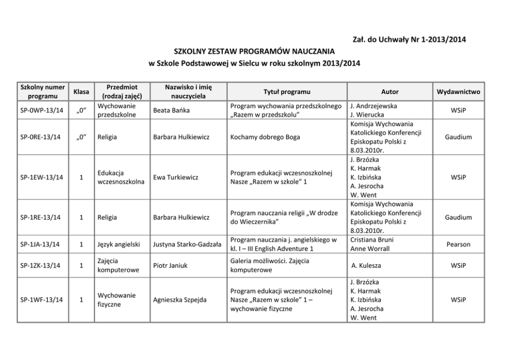Zał. do Uchwały Nr 1-2013/2014 SZKOLNY ZESTAW PROGRAMÓW NAUCZANIA w Szkole Podstawowej w Sielcu w roku szkolnym 2013/2014 Szkolny numer programu Klasa SP-0WP-13/14 „0” SP-0RE-13/14 „0” SP-1EW-13/14 Przedmiot (rodzaj zajęć) Wychowanie przedszkolne Nazwisko i imię nauczyciela Tytuł programu Autor Beata Bańka Program wychowania przedszkolnego „Razem w przedszkolu” Religia Barbara Hulkiewicz Kochamy dobrego Boga 1 Edukacja wczesnoszkolna Ewa Turkiewicz Program edukacji wczesnoszkolnej Nasze „Razem w szkole” 1 SP-1RE-13/14 1 Religia Barbara Hulkiewicz Program nauczania religii „W drodze do Wieczernika” SP-1JA-13/14 1 Język angielski Justyna Starko-Gadzała Program nauczania j. angielskiego w kl. I – III English Adventure 1 SP-1ZK-13/14 1 Zajęcia komputerowe Piotr Janiuk Galeria możliwości. Zajęcia komputerowe A. Kulesza WSiP Program edukacji wczesnoszkolnej Nasze „Razem w szkole” 1 – wychowanie fizyczne J. Brzózka K. Harmak K. Izbińska A. Jesrocha W. Went WSiP SP-1WF-13/14 1 Wychowanie fizyczne Agnieszka Szpejda J. Andrzejewska J. Wierucka Komisja Wychowania Katolickiego Konferencji Episkopatu Polski z 8.03.2010r. J. Brzózka K. Harmak K. Izbińska A. Jesrocha W. Went Komisja Wychowania Katolickiego Konferencji Episkopatu Polski z 8.03.2010r. Cristiana Bruni Anne Worrall Wydawnictwo WSiP Gaudium WSiP Gaudium Pearson Szkolny numer programu Klasa Przedmiot (rodzaj zajęć) Nazwisko i imię nauczyciela Tytuł programu SP-2EW-13/14 2 Edukacja wczesnoszkolna Alicja Sędłak Program edukacji wczesnoszkolnej Nasze „Razem w szkole” 2 SP-2RE-13/14 2 Religia Barbara Hulkiewicz Program nauczania religii „W drodze do Wieczernika” SP-2JA-13/14 2 Język angielski Justyna Starko-Gadzała Program nauczania j. angielskiego w kl. I – III New Sparks PLUS 2 SP-2ZK-13/14 2 Zajęcia komputerowe Piotr Janiuk Galeria możliwości. Zajęcia komputerowe SP-2WF-13/14 2 Wychowanie fizyczne Agnieszka Szpejda Program edukacji wczesnoszkolnej Nasze „Razem w szkole” 2 – wychowanie fizyczne SP-3EW-13/14 3 Edukacja wczesnoszkolna Justyna Starko-Gadzała Program edukacji wczesnoszkolnej Razem w szkole. Klasa III SP-3RE-13/14 3 Religia Barbara Hulkiewicz Program nauczania religii „Jesteśmy dziećmi Bożymi” Autor J. Brzózka K. Glinka K. Harmak K. Izbińska A. Jasiocha W. Went Komisja Wychowania Katolickiego Konferencji Episkopatu Polski z 8.03.2010r. M. Szpotowicz M. Szulc-Kurpaska P. A. Davies C. Graham A. Kulesza J. Brzózka K. Glinka K. Harmak K. Izbińska A. Jasiocha W. Went A. Katlińska, J. Brzózka K. Glinka, K. Harmak Komisja Wychowania Katolickiego Konferencji Episkopatu Polski z 20.09.2001r. Wydawnictwo WSiP Gaudium Oxford WSiP WSiP WSiP Gaudium Szkolny numer programu SP-3JA-13/14 Klasa 3 Przedmiot (rodzaj zajęć) Język angielski Nazwisko i imię nauczyciela Justyna Starko-Gadzała SP-3ZK-13/14 3 Zajęcia komputerowe Piotr Janiuk SP-3WF-13/14 3 Wychowanie fizyczne Agnieszka Szpejda Tytuł programu Program nauczania j. angielskiego w kl. I – III New Sparks PLUS 3 Razem w szkole. Zajęcia komputerowe Program edukacji wczesnoszkolnej Nasze „Razem w szkole” 3 – wychowanie fizyczne Autor Wydawnictwo M. Szpotowicz M. Szulc-Kurpaska Oxford P. A. Davies, C. Graham D. Kręcisz B. Lewandowska A. Katlińska, J. Brzózka K. Glinka, K. Harmak Komisja Wychowania Katolickiego Konferencji Episkopatu Polski z 8.03.2010r. SP-4RE-13/14 4 Religia Barbara Hulkiewicz Program nauczania religii „Poznaję Boga i w Niego wierzę” SP-4JP-13/14 4 Język polski Ewa Stańkowska Program nauczania j. polskiego klasie IV - VI „Między nami” A. Łuczak A. Murdzek SP-4MA-13/14 4 Matematyka Kornel Matczuk SP-4JA-13/14 4 Język angielski Justyna Starko-Gadzała H. Lewicka M. Kowalczyk Rob Nolasco David Newbold SP-4HS-13/14 4 Historia Edyta Tarajko SP-4PR-13/14 4 Przyroda Piotr Janiuk Program nauczania matematyki w kl. IV „Matematyka wokół nas” Program nauczania j. angielskiego w kl. IV – VI „New English” Zone 1 Program nauczania przedmiotów historia i społeczeństwo „Wczoraj i dziś” Program nauczania przyrody w klasie IV - VI „Tajemnice przyrody” SP-4ZK-13/14 4 Zajęcia komputerowe Piotr Janiuk Program nauczania zajęć komputerowych „Informatyka Europejczyka” D. Kiałka K. Kiałka WSiP WSiP Gaudium Gdańskie Wydawnictwo Oświatowe WSiP Oxford G. Wojciechowski Nowa Era M. Marko-Worłowska F. Szlajfer, J. Stawarz Nowa Era Helion Szkolny numer programu Klasa Przedmiot (rodzaj zajęć) Nazwisko i imię nauczyciela SP-4PL-13/14 4 Plastyka Ewa Turkiewicz SP-4MU-13/14 4 Muzyka Ewa Turkiewicz SP-4WF-13/14 4 SP-4ZT-13/14 4 SP-5RE-13/14 5 Wychowanie fizyczne Zajęcia techniczne Religia Paweł Szlagowski Daniel Raczyński A. Łuczak A. Murdzek Program nauczania matematyki w kl. V „Matematyka wokół nas” Program nauczania j. angielskiego w kl. IV – VI „New English” Zone 2 Program nauczania przedmiotów historia i społeczeństwo „Wczoraj i dziś” H. Lewicka M. Kowalczyk Rob Nolasco David Newbold SP-5MA-13/14 5 Matematyka Kornel Matczuk SP-5JA-13/14 5 Język angielski Justyna Starko-Gadzała SP-5HS-13/14 5 Historia Edyta Tarajko SP-5ZK-13/14 5 Zajęcia komputerowe U. Białka Program nauczania j. polskiego „Między nami” Ewa Stańkowska Piotr Janiuk Piotr Janiuk Program nauczania przyrody „Tajemnice przyrody” Program nauczania zajęć komputerowych „Informatyka Europejczyka” Wydawnictwo Nowa Era Nowa Era S. Żołyński Program nauczania religii „Poznaję Boga i w Niego wierzę” Język polski Przyroda J. Lukas K. Onak M. Gromek G. Kilbach Barbara Hulkiewicz 5 5 Program nauczania plastyki „Do dzieła” Program nauczania muzyki „I gra muzyka” Program nauczania wf w klasie IV „Ruch – zdrowie dla każdego” Program zajęć technicznych „Odkrywamy na nowo” Autor Komisja Wychowania Katolickiego Konferencji Episkopatu Polski z 8.03.2010r SP-5JP-13/14 SP-5PR-13/14 Tytuł programu Operon Gaudium Gdańskie Wydawnictwo Oświ