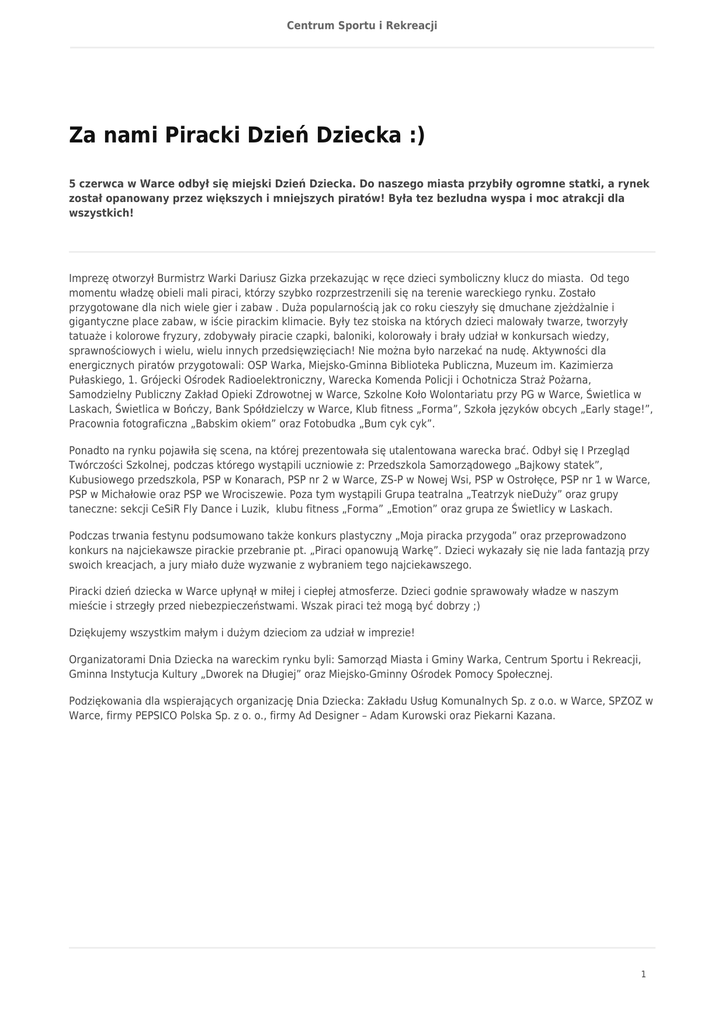 Centrum Sportu i Rekreacji Za nami Piracki Dzień Dziecka :) 5 czerwca w Warce odbył się miejski Dzień Dziecka. Do naszego miasta przybiły ogromne statki, a rynek został opanowany przez większych i mniejszych piratów! Była tez bezludna wyspa i moc atrakcji dla wszystkich! Imprezę otworzył Burmistrz Warki Dariusz Gizka przekazując w ręce dzieci symboliczny klucz do miasta. Od tego momentu władzę obieli mali piraci, którzy szybko rozprzestrzenili się na terenie wareckiego rynku. Zostało przygotowane dla nich wiele gier i zabaw . Duża popularnością jak co roku cieszyły się dmuchane zjeżdżalnie i gigantyczne place zabaw, w iście pirackim klimacie. Były tez stoiska na których dzieci malowały twarze, tworzyły tatuaże i kolorowe fryzury, zdobywały piracie czapki, baloniki, kolorowały i brały udział w konkursach wiedzy, sprawnościowych i wielu, wielu innych przedsięwzięciach! Nie można było narzekać na nudę. Aktywności dla energicznych piratów przygotowali: OSP Warka, Miejsko-Gminna Biblioteka Publiczna, Muzeum im. Kazimierza Pułaskiego, 1. Grójecki Ośrodek Radioelektroniczny, Warecka Komenda Policji i Ochotnicza Straż Pożarna, Samodzielny Publiczny Zakład Opieki Zdrowotnej w Warce, Szkolne Koło Wolontariatu przy PG w Warce, Świetlica w Laskach, Świetlica w Bończy, Bank Spółdzielczy w Warce, Klub fitness „Forma”, Szkoła języków obcych „Early stage!”, Pracownia fotograficzna „Babskim okiem” oraz Fotobudka „Bum cyk cyk”. Ponadto na rynku pojawiła się scena, na której prezentowała się utalentowana warecka brać. Odbył się I Przegląd Twórczości Szkolnej, podczas którego wystąpili uczniowie z: Przedszkola Samorządowego „Bajkowy statek”, Kubusiowego przedszkola, PSP w Konarach, PSP nr 2 w Warce, ZS-P w Nowej Wsi, PSP w Ostrołęce, PSP nr 1 w Warce, PSP w Michałowie oraz PSP we Wrociszewie. Poza tym wystąpili Grupa teatralna „Teatrzyk nieDuży” oraz grupy taneczne: sekcji CeSiR Fly Dance i Luzik, klubu fitness „Forma” „Emotion” oraz grupa ze Świetlicy w Laskach. Podczas trwania festynu podsumowano także konkurs plastyczny „Moja piracka przygoda” oraz przeprowadzono konkurs na najciekawsze pirackie przebranie pt. „Piraci opanowują Warkę”. Dzieci wykazały się nie lada fantazją przy swoich kreacjach, a jury miało duże wyzwanie z wybraniem tego najciekawszego. Piracki dzień dziecka w Warce upłynął w miłej i ciepłej atmosferze. Dzieci godnie sprawowały władze w naszym mieście i strzegły przed niebezpieczeństwami. Wszak piraci też mogą być dobrzy ;) Dziękujemy wszystkim małym i dużym dzieciom za udział w imprezie! Organizatorami Dnia Dziecka na wareckim rynku byli: Samorząd Miasta i Gminy Warka, Centrum Sportu i Rekreacji, Gminna Instytucja Kultury „Dworek na Długiej” oraz Miejsko-Gminny Ośrodek Pomocy Społecznej. Podziękowania dla wspierających organizację Dnia Dziecka: Zakładu Usług Komunalnych Sp. z o.o. w Warce, SPZOZ w Warce, firmy PEPSICO Polska Sp. z o. o., firmy Ad Designer – Adam Kurowski oraz Piekarni Kazana. 1