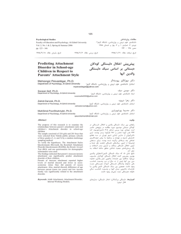 125 Psychological Studies Faculty of Education and Psychology, Al-ZahrƗ University Vol. 2, No. 1 & 2, Spring & Summer 2006 pp. 125 - 146 æèíê/é/æí :ƶƫŚƤƯ ƁźƿŸě ŲƿŹŚţ Ž İŤųŚƴƃƱřƹŹ šŚƘƫŚƐƯ řźƷżƫř ƵŚĮƄƳřŵ İſŚƴƃƱřƹŹ ƹ İŤǀŝźţ ƭƺƬƗ įƵŶĪƄƳřŵ æèíê ƱŚŤƀŝŚţ ƹ ŹŚƸŝ ç ƹ æ įƵŹŚưƃ ç įƵŹƹŵ 146 - æçê .ƆƇ æèíê/ç/è :ƶƫŚƤƯ İſŹźŝ ŲƿŹŚţ Predicting Attachment Disorder in School-age Children in Respect to Parents’ Attachment Style æèíê/æ/çæ :ƶƫŚƤƯ ŢƟŚƿŹŵ ŲƿŹŚţ ƱŚĩŵƺĩ İĮŤƀŞƫŵ ƩLjŤųř İƴǀŝƂǀě İĮŤƀŞƫŵ ĨŞſ ŽŚſř źŝ İƳŚŤƀŝŵ ŚƸƳō ƲƿŶƫřƹ źĭƶŤſƺǀě żǀĮƳřźƸƯ źŤĩŵ Mehrangiz Peivastégar, Ph.D. Department of Psychology, Al-ZahrŅ University řźƷżƫř ƵŚĮƄƳřŵ İſŚƴƃƱřƹŹ ƹ İŤǀŝźţ ƭƺƬƗ įƵŶĪƄƳřŵ ŹŚƿŵŚŤſř [email protected] ƞǀſ Ʋſƺſ źŤĩŵ Soosan Seif, Ph.D. Department of Psychology, Al-ZahrŅ University řźƷżƫř ƵŚĮƄƳřŵ İſŚƴƃƱřƹŹ ƹ İŤǀŝźţ ƭƺƬƗ įƵŶĪƄƳřŵ ŵŚŤſř [email protected] ƵżƿƹŹŵ řźƷŻ źŤĩŵ ZahrƗ Darvizé, Ph.D. řźƷżƫř ƵŚĮƄƳřŵ Department of Psychology, Al-ZahrŅ University [email protected] įŹŚƿźƸƃŹƺě ŚưǀſƶƯ źŤĩŵ MahSimƗ PoorShahriyƗri, Ph.D. řźƷżƫř ƵŚĮƄƳřŵ Department of Psychology, Al-ZahrŅ University [email protected] Abstract İſŚƴƃƱřƹŹ ƹ İŤǀŝźţ ƭƺƬƗ įƵŶĪƄƳřŵ ŹŚƿŵŚŤſř İſŚƴƃƱřƹŹ ƹ İŤǀŝźţ ƭƺƬƗ įƵŶĪƄƳřŵ ŹŚƿŵŚŤſř ƵŶǀĪģ The purpose of this research is to examine the relationships between parent’s attachment style and children’s Attachment disorder in school-age children. The sample consisted of 324 girls and 281 boys that were selected from TehrƗn public primary schools of three grades (3, 4, and 5) by a random multistage sampling method. To verify the hypotheses, The Attachment Styles Questionnaire (Revised), the Randolph Attachment Disorder Questionnaire (RADQ), the Bender Gestalt Test (BG), and one questionnaire for demographic information were used. The findings indicated that parent’s insecure/anxiety attachment can significantly predict attachment disorder of their children. Parents of insecure attachment reported higher levels of marital discord and lower in socioeconomic status than did parents of secure attachment. Also, marital discord, difference of age between parent (more ten years) and low income family was significantly related to the attachment disorder. Źŵ İĮŤƀºŞƫŵ ƩLjŤųř ƹ ƲƿŶƫřƹ İĮŤƀŞƫŵ ĨŞſ Ʋǀŝ įƶƐŝřŹ źºƋŚů ƂƷƹĦºě Źŵ ƶºƘƫŚƐƯ ŵŹƺºƯ ƕƺºƋƺƯ İƳŚŤƀŝŵ ƱŚĩŵƺĩ ƶºĩ ŵƺºŝŻƺƯōƂºƳřŵ ëåê ƪƯŚºƃ İſŹźŝ ŵŹƺƯ įƶƳƺưƳ .Ţſř Ʋººƿř .ŶººƳŵƺŝ źƀººě ŚººƸƳōźƠƳ çíæ ƹ źººŤųŵ ŚººƸƳō źººƠƳ èçé ƖºƐƤƯ ƶºſ Źŵ ƱřźºƸţ źƸºƃ İƿřŶŤŝř ŽŹřŶƯ Żř ƱřŻƺƯōƂƳřŵ įźººǀĭƶººƳƺưƳ ƁƹŹ Śººŝ (ƮŬƴººě ƹ ƭŹŚººƸģ ƹ ƭƺººſ) İƬǀƈºŰţ ƂŬƴºſ įřźºŝ .ŶºƳŵƺŝ ƵŶºƃ ƵŶƿżĭźŝ įřƶƬůźƯ Ŷƴģ İƟŵŚƈţ ƹ (ƵŶƃ źƔƳ ŶƿŶŬţ) İĮŤƀŞƫŵ įŚƷ ĨŞſ ƱƺƯŻō Żř ŚƷ ƶǀƋźƟ ƹ ŢƫŚŤƄºĭ ŹŶºƴŝ ƱƺºƯŻō ƹ ƞƫřŶºƳŹ İĮŤƀŞƫŵ ƩLjŤųř ƱƺƯŻō ƶºŝ ƵŵŚƠŤſř ƶŤųŚſ ƢƤŰƯ İŤųŚƴƃ ŢǀƘưū įƶƯŚƳƂſźě Ĩƿ .ŶƯō ƪưƗ ƲƿŶºƫřƹ İŝřźƐƋř/ƲưƿřŚƳ İĮŤƀŞƫŵ ĨŞſ ƶĩ ŵřŵ ƱŚƄƳ ŪƿŚŤƳ śƺƀºŰƯ ƱŚºĩŵƺĩ İĮŤƀŞƫŵ ƩLjŤųř ƵŶƴƴĩ İƴǀŝ Ƃǀě ƲƿźŤƸŝ šƹŚºƠţ ƲƿŶƫřƹ ƱŚǀƯ İƿƺƃŚƳŻ šŚƋŹŚƘţ Ʋǀŝ ƵƹLjƗƶŝ .ŵƺƃİƯ ŜºſŚƴƯŚƳ ŢǀƘºƋƹ żºǀƳ ƹ (ƩŚſ Ƶŵ Żř Ƃǀŝ) ŚƸƳō Ʋǀŝ İƴſ ŢºŞŨƯ İĮŤƀºŞưƷ ħŵƺºĩ İĮŤƀºŞƫŵ ƩLjŤºųřƹ ƵŵřƺƳŚºų İƫŚƯ Śºŝ ƲƿŶƫřƹ ƲưƿřŚƳ İĮŤƀŞƫŵ ĨŞſ Ʋǀŝ ƲǀƴĤưƷ .Ţƃřŵ ŵƺūƹ İƫŚººƯ ŜººſŚƴƯŚƳ ŢǀƘººƋƹ ƹ ŚººƸƳō ƱŚººǀƯ İƿƺººƃŚƳŻ šŚººƋŹŚƘţ .Ţƃřŵ ŵƺūƹ ŹřŵİƴƘƯ ŢŞŨƯ İĮŤƀŞưƷ ƵŵřƺƳŚų Keywords: Adult Attachment; Attachment Disorder; Internal Working Models; įŚºƷƩŶºƯ İĮŤƀŞƫŵ ƩLjŤųř ƱLJŚƀĭŹżŝ İĮŤƀŞƫŵ :ŚƷƵĥřƹŶǀƬĩ İƳƹŹŵ ƩŚƘƟ 126 ç ƹ æ įƵŹŚưƃ ç įƵŹƹŵ æèíê ƱŚŤƀŝŚţ ƹ ŹŚƸŝ İŤųŚƴƃƱřƹŹ šŚƘƫŚƐƯ æçë ƶƯŶƤƯ Ţºſř ƂƿřżºƟř ƩŚºů Źŵ ƞºƬŤŴƯ ƖƯřƺū Źŵ šƹŚƠŤƯ įŚƷšŶƃ Śŝ ÎİĮŤƀŞƫŵ šLJLjŤųř ƶºŝ ŹŵŚºƣ İƗŚºưŤūř įŚƷ ŢǀƘƣƺƯ Źŵ İĮŤƀŞƫŵ šLJLjŤųř įřŹřŵ ƱŚĩŵƺĩ .(æîîå ÏŹŚºĩ ƹ ĬƴǀƫźĜſř Żř ŶºƳŹřŶƳ ŵŚưŤƗř ƱřźĮƿŵ ƶŝ (çååè ÐƱƹŹƹŶºƳżŬƿř Ʊƹ) ŶƴŤƀǀƳ ƱřźĮƿŵ Śŝ ŜſŚƴƯ įƶƐŝřŹ ƹ ƪƯŚƘţ ŹřŻō įŻƹźºƟřƂºţō źºǀƔƳ İƿŚºƷŹŚŤƟŹ .ŶƴŤƀºƷ źĮƃŚųźě ŹŚǀƀŝ Śƿ ƹ ŶƴƴĩİƯ įźǀĭƵŹŚƴĩ ƱřźĮƿŵ .(æîîå ŹŚĩ ƹ ĬƴǀƫźĜſř źƬƄǀƟ) ŵƺƃİƯ ƵŶƿŵ ŚƸƳō Źŵ İƿƺĭƙƹŹŵ ƹ šŚƳřƺǀů ħŵƺºĩ įƶºƐŝřŹ Źŵ ƶƄƿŹ ƹ ŵƺƃİƯ ƕƹźƃ İĮƫŚſ ê Ʋſ Żř ƪŞƣ LJ ľ ƺưƘƯ ƩLjŤųř Ʋƿř ƹ ƂºƯřŹō ŢŞŰƯ ƶŝ ƹř İſŚſř įŚƷŻŚǀƳ ƶĩ ƵŵƺưƳ ŶƃŹ İƐƿřźƃ Źŵ ħŵƺĩ .ŵŹřŵ ƂŞƣřźƯ Śŝ ƱƹŹƹŶºƳżŬƿř Ʊƹ) Ţºſř ƶºŤƟźĭ Źřźƣ İƸūƺţİŝ ŵŹƺƯ ƹř İƳŚưƀū įŚƷŻŚǀƳ żǀƳ ƹ ŜſŚƴƯ šŚĩźŰƯ (... ƹ ÒİĩƺƬºſ šLJLjŤºųř ÑƮƀºǀţƹř) įŶºƃŹ šLJLjŤųř źƿŚſ Żř İŤƀƿŚŝ šLJLjŤųř Ʋƿř .(çååè ƶŝ İƗŚư