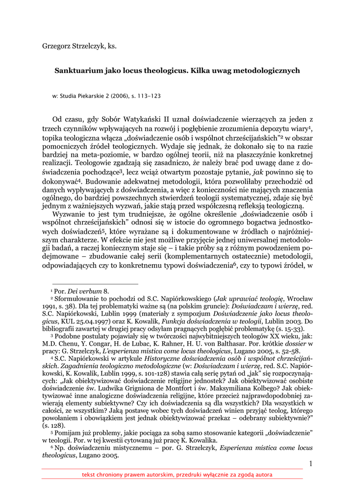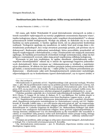 Grzegorz Strzelczyk, ks. Sanktuarium jako locus theologicus. Kilka uwag metodologicznych w: Studia Piekarskie 2 (2006), s. 113-123 Od czasu, gdy Sobór Watykański II uznał doświadczenie wierzących za jeden z trzech czynników wpływających na rozwój i pogłębienie zrozumienia depozytu wiary1, topika teologiczna włącza „doświadczenie osób i wspólnot chrześcijańskich”2 w obszar pomocniczych źródeł teologicznych. Wydaje się jednak, że dokonało się to na razie bardziej na meta-poziomie, w bardzo ogólnej teorii, niż na płaszczyźnie konkretnej realizacji. Teologowie zgadzają się zasadniczo, że należy brać pod uwagę dane z doświadczenia pochodzące3, lecz wciąż otwartym pozostaje pytanie, jak powinno się to dokonywać4. Budowanie adekwatnej metodologii, która pozwoliłaby przechodzić od danych wypływających z doświadczenia, a więc z konieczności nie mających znaczenia ogólnego, do bardziej powszechnych stwierdzeń teologii systematycznej, zdaje się być jednym z ważniejszych wyzwań, jakie stają przed współczesną refleksją teologiczną. Wyzwanie to jest tym trudniejsze, że ogólne określenie „doświadczenie osób i wspólnot chrześcijańskich” odnosi się w istocie do ogromnego bogactwa jednostkowych doświadczeń5, które wyrażane są i dokumentowane w źródłach o najróżniejszym charakterze. W efekcie nie jest możliwe przyjęcie jednej uniwersalnej metodologii badań, a raczej koniecznym staje się – i takie próby są z różnym powodzeniem podejmowane – zbudowanie całej serii (komplementarnych ostatecznie) metodologii, odpowiadających czy to konkretnemu typowi doświadczenia6, czy to typowi źródeł, w Por. Dei verbum 8. Sformułowanie to pochodzi od S.C. Napiórkowskiego (Jak uprawiać teologię, Wrocław 1991, s. 38). Dla tej problematyki ważne są (na polskim gruncie): Doświadczam i wierzę, red. S.C. Napiórkowski, Lublin 1999 (materiały z sympozjum Doświadczenie jako locus theologicus, KUL 25.04.1997) oraz K. Kowalik, Funkcja doświadczenia w teologii, Lublin 2003. Do bibliografii zawartej w drugiej pracy odsyłam pragnących pogłębić problematykę (s. 15-33). 3 Podobne postulaty pojawiały się w twórczości najwybitniejszych teologów XX wieku, jak: M.D. Chenu, Y. Congar, H. de Lubac, K. Rahner, H. U. von Balthasar. Por. krótkie dossier w pracy: G. Strzelczyk, L’esperienza mistica come locus theologicus, Lugano 2005, s. 52-58. 4 S.C. Napiórkowski w artykule Historyczne doświadczenia osób i wspólnot chrześcijańskich. Zagadnienia teologiczno metodologiczne (w: Doświadczam i wierzę, red. S.C. Napiórkowski, K. Kowalik, Lublin 1999, s. 101-128) stawia całą serię pytań od „jak” się rozpoczynających: „Jak obiektywizować doświadczenie religijne jednostek? Jak obiektywizować osobiste doświadczenie św. Ludwika Grigniona de Montfort i św. Maksymiliana Kolbego? Jak obiektywizować inne analogiczne doświadczenia religijne, które przecież najprawdopodobniej zawierają elementy subiektywne? Czy ich doświadczenia są dla wszystkich? Dla wszystkich w całości, ze wszystkim? Jaką postawę wobec tych doświadczeń winien przyjąć teolog, którego powołaniem i obowiązkiem jest jednak obiektywizować przekaz – odebrany subiektywnie?” (s. 128). 5 Pomijam już problemy, jakie pociąga za sobą samo stosowanie kategorii „doświadczenie” w teologii. Por. w tej kwestii cytowaną już pracę K. Kowalika. 6 Np. doświadczeniu mistycznemu – por. G. Strzelczyk, Esperienza mistica come locus theologicus, Lugano 2005. 1 2 1 tekst chroniony prawem autorskim, przedruki wyłącznie za zgodą autora których doświadczenie jest wyrażane7. Dotychczasowe prace koncentrują się zdecydowanie na badaniu doświadczenia pojedynczych osób, pozostawiając w cieniu doświadczenie wspólnot. Sytuacja to zrozumiała, ponieważ samo pojęcie „doświadczenie wspólnoty” jest dość niejasne8 i tak czy inaczej zakłada pewną wstępną analizę doświadczeń osób tworzących daną wspólnotę. W ten kontekst wpisują się niniejsze rozważania nad sanktuarium jako miejscem teologicznym. Nie jest moją intencją przedstawienie gotowej, „domkniętej” metodologii – co na obecnym etapie badań nie wydaje się zresztą możliwe, lecz próba sformułowania bądź doprecyzowania niektórych elementów, które mogłyby się na taką metodologię w przyszłości złożyć. Nim jednak przejdziemy do dwóch kluczowych pytań – o fundamenty źródłowego charakteru sanktuariów oraz o same materiały źródłowe możliwe do wykorzystania przez teologa, trzeba doprecyzować, w jaki sposób ujmowany będzie fenomen „sanktuarium”. Chodzi przede wszystkim o sanktuarium jako „przestrzeń”9, w której ma miejsce pewne wspólnotowe doświadczenie wiary i w której pozostają najróżniejsze ślady tego doświadczenia, które mogą być następnie przedmiotem badań. 1. „Teologiczna” funkcja sanktuarium? Dla porządku metodologicznego należy dokonać uściślenia dotyczącego zasadniczego aspektu refleksji, której przedmiotem staje się sanktuarium. Nietrudno się zorientować, że lwia część studiów mu poświęconych porusza różne zagadnienia pastoralne, praktyczne. Będą one dla nas interesujące raczej jako materiał pomocniczy. W takich kontekstach pojawiają się nierzadko pytania o rolę i znaczenie sanktuariów w Kościele10, prowadzące oczywiście do namysłu nad teologicznym wymiarem sanktuarium jako takiego11; za jego syntezę uznać można dokument Papieskiej Rady ds. Duszpasterstwa Migrantów i Podróżnych: Sanktuarium. Pamięć, obecność i proroctwo Boga żywego12 z 1999 roku, w którym wskazane są trzy zasadnicze motywy teologiczne, a zarazem funkcje sanktuarium. Jest ono najpierw „miejscem pamięci o potężnym działaniu Boga w historii” (nr 4), dalej „znakiem Bożej obecności” (nr 9) i wreszcie „stanowi zapowiedź naszej ostatecznej i definitywnej ojczyzny