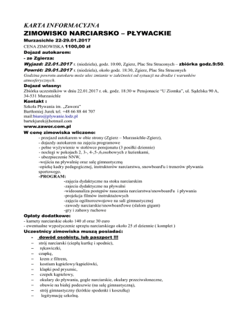 KARTA INFORMACYJNA ZIMOWISK0 NARCIARSKO – PŁYWACKIE Murzasichle 22-29.01.2017 CENA ZIMOWISKA 1100,00 zł Dojazd autokarem: - ze Zgierza: Wyjazd: 22.01.2017 r. (niedziela), godz. 10:00, Zgierz, Plac Stu Straconych – zbiórka godz.9:50. Powrót: 29.01.2017 r. (niedziela), około godz. 18:30, Zgierz, Plac Stu Straconych Godzina powrotu autokaru może ulec zmianie w zależności od sytuacji na drodze i warunków atmosferycznych. Dojazd własny: Zbiórka uczestników w dniu 22.01.2017 r. ok. godz. 18:30 w Pensjonacie “U Ziomka”, ul. Sądelska 90 A, 34-531 Murzasichle Kontakt : Szkoła Pływania im. „Zawora” Bartłomiej Jurek tel. +48 66 88 44 707 mail:[email protected] [email protected] www.zawor.com.pl W cenę zimowiska wliczono: - przejazd autokarem w obie strony (Zgierz – Murzasichle-Zgierz), - dojazdy autokarem na zajęcia programowe - pełne wyżywienie w stołówce pensjonatu (3 posiłki dziennie) - noclegi w pokojach 2, 3-, 4-,5-,6,osobowych z łazienkami, - ubezpieczenie NNW, -wejścia na pływalnię oraz salę gimnastyczną -opiekę kadry pedagogicznej, instruktorów narciarstwa, snowboard'u i trenerów pływania sportowego. -PROGRAM: -zajęcia dydaktyczne na stoku narciarskim -zajecia dydaktyczne na pływalni -wideoanaliza postępów nauczania narciarstwa/snowboard'u i pływania -projekcja filmów instruktażowych -zajęcia ogólnorozwojowe na sali gimnastycznej -zawody narciarskie/snowboard'owe (slalom gigant) -gry i zabawy ruchowe Opłaty dodatkowe: - karnety narciarskie około 140 zł oraz 30 euro - ewentualne wypożyczenie sprzętu narciarskiego około 25 zł dziennie ( komplet ) Uczestnicy zimowiska muszą posiadać: - dowód osobisty, lub paszport !!! – strój narciarski (ciepłą kurtkę i spodnie), – rękawiczki, – czapkę, – krem z filtrem, – kostium kąpielowy/kąpielówki, – klapki pod prysznic, – czepek kąpielowy, – okulary do pływania, gogle narciarskie, okulary przeciwsłoneczne, – obuwie na białej podeszwie (na salę gimnastyczną), – strój gimnastyczny (krótkie spodenki i koszulkę) – legitymację szkolną.