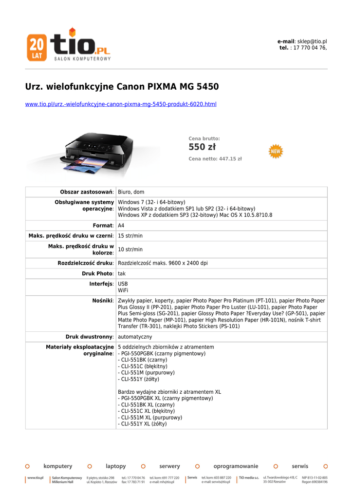 e-mail: [email protected] tel. : 17 770 04 76, Urz. wielofunkcyjne Canon PIXMA MG 5450 www.tio.pl/urz.-wielofunkcyjne-canon-pixma-mg-5450-produkt-6020.html Cena brutto: 550 zł Cena netto: 447.15 zł Obszar zastosowań: Biuro, dom Obsługiwane systemy Windows 7 (32- i 64-bitowy) operacyjne: Windows Vista z dodatkiem SP1 lub SP2 (32- i 64-bitowy) Windows XP z dodatkiem SP3 (32-bitowy) Mac OS X 10.5.8?10.8 Format: A4 Maks. prędkość druku w czerni: 15 str/min Maks. prędkość druku w 10 str/min kolorze: Rozdzielczość druku: Rozdzielczość maks. 9600 x 2400 dpi Druk Photo: tak Interfejs: USB WiFi Nośniki: Zwykły papier, koperty, papier Photo Paper Pro Platinum (PT-101), papier Photo Paper Plus Glossy II (PP-201), papier Photo Paper Pro Luster (LU-101), papier Photo Paper Plus Semi-gloss (SG-201), papier Glossy Photo Paper ?Everyday Use? (GP-501), papier Matte Photo Paper (MP-101), papier High Resolution Paper (HR-101N), nośnik T-shirt Transfer (TR-301), naklejki Photo Stickers (PS-101) Druk dwustronny: automatyczny Materiały eksploatacyjne 5 oddzielnych zbiorników z atramentem oryginalne: - PGI-550PGBK (czarny pigmentowy) - CLI-551BK (czarny) - CLI-551C (błękitny) - CLI-551M (purpurowy) - CLI-551Y (żółty) Bardzo wydajne zbiorniki z atramentem XL - PGI-550PGBK XL (czarny pigmentowy) - CLI-551BK XL (czarny) - CLI-551C XL (błękitny) - CLI-551M XL (purpurowy) - CLI-551Y XL (żółty) Funkcje urządzenia: drukarka kopiarka skaner *Ceny obowiązują wyłącznie przy składaniu zamówień przez sklep internetowy. Ceny w salonie TiO media mogą nieznacznie różnić się od cen prezentowanych na stronach sklepu internetowego. Przedstawiona oferta w sklepie internetowym nie stanowi oferty w rozumieniu Kodeksu Cywilnego, i jest jedynie zaproszeniem do rozpoczęcia rokowań (zgodnie z art. 71 k.c.). Zastrzegamy sobie prawo do niezrealizowania zamówień z ważnych przyczyn ekonomicznych.