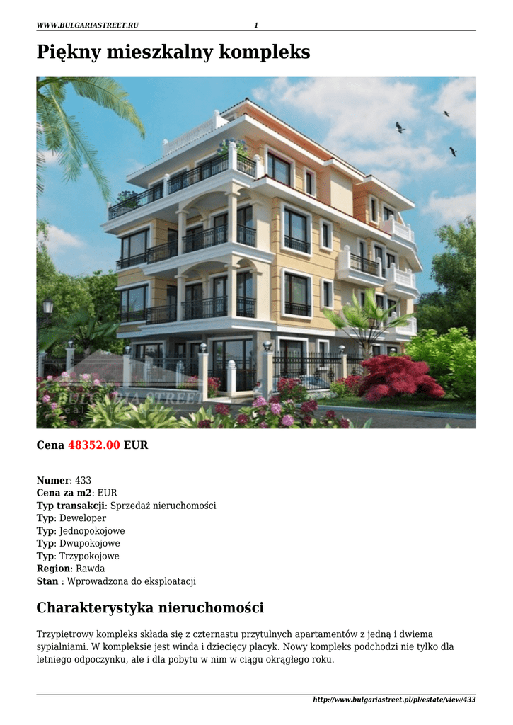 WWW.BULGARIASTREET.RU 1 Piękny mieszkalny kompleks Cena 48352.00 EUR Numer: 433 Cena za m2: EUR Typ transakcji: Sprzedaż nieruchomości Typ: Deweloper Typ: Jednopokojowe Typ: Dwupokojowe Typ: Trzypokojowe Region: Rawda Stan : Wprowadzona do eksploatacji Charakterystyka nieruchomości Trzypiętrowy kompleks składa się z czternastu przytulnych apartamentów z jedną i dwiema sypialniami. W kompleksie jest winda i dziecięcy placyk. Nowy kompleks podchodzi nie tylko dla letniego odpoczynku, ale i dla pobytu w nim w ciągu okrągłego roku. http://www.bulgariastreet.pl/pl/estate/view/433 WWW.BULGARIASTREET.RU 2 Sprzedają się mieszkania w kompleksie, który znajduje się na pierwszej linii od morza w popularnym kurorcie Bułgarii turystycznym osiedlu Rawda. Po placu apartamenty zajmują 46.05 - 140.45 кв.м. Z wszystkich apartamentów otwierać się niewiarogodny panoramiczny rodzaj na morzu. Terytorium kompleksu zadrzewia i przypilnowana. Mieszkania sprzedają się z obróbką "pod klucz". Taks obsługi 5 euro/mkw. bez VAT. Reszta do eksploatacji - maj 2013г. Infrastruktura ● ● ● ● ● ● Kamery ochrony Telewizja kablowa Elektrczność Woda Okna PVC Przypilnowane terytorium Informacje o regionie Przedtem Rawda była międzynarodowym centrum dziecięcego turyzmu i odpoczynku. Przez ostatnie lata Rawda przekształcił się na współczesny wielofunkcyjny morski kurort, który stał się niezwykle popularnym u cudzoziemskich turystów, w tej liczbie u Rosjan. Wiele osób wybierają Rawda dla spokojnego rodzinnego odpoczynku, w tej liczbie z dziećmi. Malownicze bułgarskie osiedle Rawda jest rozmieszczone na południowym czarnomorskim nadbrzeżu Bułgarii w półtora kilometrach od prastarego miasta Nesebar. Popularny bułgarski kurort Słoneczny brzeg znajduje się zaledwie 5 km, a międzynarodowy port lotniczy m. Burgas - do 30 km Klimat Miękki śródziemnomorski klimat z dużą ilością słonecznych godzin(2 200 - 2 300) korzystnie wyróżniają Rawdе od innych kurortów. Temperatura latem waha się od 20 do 30 stopni Celsjusza, a wody - 20-26 stopni Celsjusza. Plaże Świeże powietrze i przezroczysta czysta morska woda - wizytówka Rawdy. Plaże Rawda - wygodne i bezpieczne z drobnym złocistym piaskiem. Są najbardziej znane dwie plaże - Południowa i druga, która jest rozmieszczona między przylądkiem Rawdy i przylądkiem Akrotiria. Tu są wszystkie atrybuty dla komfortowego plażowego odpoczynku - szezlongi, parasole, kawiarnie, fachowa ochrona i animatorzy. Infrastruktura Mimo to, że Rawda jest osiedlem, infrastruktura jest opracowana i jest całe potrzebne nie tylko dla odpoczynku, ale i dla całorocznego pobytu. W Rawdzie stale mieszka miejscowa ludność. W osiedlu funkcjonują następne obiekty: municypalne i prywatne dziecięce sadki, szkoła, poczta, filie banków, supermarket, sklepy, warzywne sklepy, medyczne centrum, apteki i sportowy kompleks z trenażerem salą. Dla amatorów śródziemnomorskiej i internacjonalnej kuchni w Rawdzie są 10 wytwornych restauracji, a smakoszy, co oddaje przewagę bułgarskiej kuchni, ucieszy całe dziesięć knajp. Liczne kawiarnie i bistro, rozmieszczone po całym osiedlu, zaproponują dostatek zakąsek i deserów. http://www.bulgariastreet.pl/pl/estate/view/433 WWW.BULGARIASTREET.RU 3 http://www.bulgariastreet.pl/pl/estate/view/433 WWW.BULGARIASTREET.RU 4 http://www.bulgariastreet.pl/pl/estate/view/433 WWW.BULGARIASTREET.RU 5 Kontakty Agencja "Ulica Bułgarska" (Bulgaria Street Ltd) Bułgaria m. Burgas, 8000 ul. Mitropolit Simeon 3 Strona: www.bulgariastreet.ru Tel: + 359 894 51 50 51 Tel: + 48 223 906 334 Mail: [email protected] Mail: [email protected] Skype: bulstreet http://www.bulgariastreet.pl/pl/estate/view/433