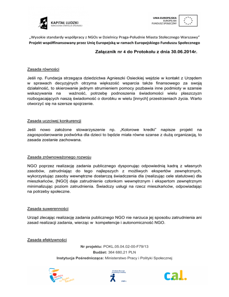 „Wysokie standardy współpracy z NGOs w Dzielnicy Praga-Południe Miasta Stołecznego Warszawy” Projekt współfinansowany przez Unię Europejską w ramach Europejskiego Funduszu Społecznego Załącznik nr 4 do Protokołu z dnia 30.06.2014r. Zasada równości Jeśli np. Fundacja strzegąca dziedzictwa Agnieszki Osieckiej wejdzie w kontakt z Urzędem w sprawach decyzyjnych otrzyma większość wsparcia także finansowego za swoją działalność, to skierowanie jednym strumieniem pomocy pozbawia inne podmioty w szansie wskazywania na ważność, potrzebę podnoszenia świadomości wielu płaszczyzn rozbogacających naszą świadomość o dorobku w wielu [innych] przestrzeniach życia. Warto otworzyć się na szersze spojrzenie. Zasada uczciwej konkurencji Jeśli nowo założone stowarzyszenie np. „Kolorowe kredki” napisze projekt na zagospodarowanie podwórka dla dzieci to będzie miała równe szanse z dużą organizacją, to zasada zostanie zachowana. Zasada zrównoważonego rozwoju NGO poprzez realizację zadania publicznego dysponując odpowiednią kadrą z własnych zasobów, zatrudniając do tego najlepszych z możliwych ekspertów zewnętrznych, wykorzystując zasoby wewnętrzne dostarczą świadczenia dla (realizując cele statutowe) dla mieszkańców, [NGO] daje zatrudnienie członkom wewnętrznym i ekspertom zewnętrznym minimalizując poziom zatrudnienia. Świadczy usługi na rzecz mieszkańców, odpowiadając na potrzeby społeczne. Zasada suwerenności Urząd zlecając realizację zadania publicznego NGO nie narzuca jej sposobu zatrudnienia ani zasad realizacji zadania, wierząc w kompetencje i autonomiczność NGO. Zasada efektywności Nr projektu: POKL.05.04.02-00-F79/13 Budżet: 364 680,21 PLN Instytucja Pośrednicząca: Ministerstwo Pracy i Polityki Społecznej „Wysokie standardy współpracy z NGOs w Dzielnicy Praga-Południe Miasta Stołecznego Warszawy” Projekt współfinansowany przez Unię Europejską w ramach Europejskiego Funduszu Społecznego Jeśli Wydział/Urząd zleci/ogłosi konkurs dla NGO przy ogłoszonym konkursie dla NGO wybierze spośród wielu projektów najlepszy pod względem realizacji, atrakcyjny cenowo (nie zawsze najtańszy), najlepszy merytorycznie [projekt], to jest to zadanie zrealizowane przez wysokiej klasy specjalistów w dobrej i konkurencyjnej cenie. Zasada partnerstwa Jeśli NGO wymyśli projekt razem z drugim NGO w sposób transparentny dla obu, to zasada zostanie zachowana. Zasada jawności Jeśli Urząd w kwestii uczestnictwa w projekcie, inicjatywie itp. dystrybuuje informacje nie do wszystkich potencjalnie zainteresowanych (czyli nie określa lub nie chce określić grupy docelowej) lub robi to wybiórczo, z opóźnieniem jednocześnie nie będąc w stanie przepracować danych środowiskowych – wtedy następuje pogwałcenie zasady jawności. Zasada pomocniczości (subsydiarności) Organizacja wyprofilowana na dane potrzeby realizując w zastępstwie JST zadania na rzecz mieszkańców, które mają służyć bezpośrednio rozwojowi społeczności lokalnej, słabszych grup „dyspanseryjnych”. Zlecanie NGO prowadzenia zadań nie wynikających z braku, ale kierując się potrzebą rozwijania/pogłębiania kompetencji. Nr projektu: POKL.05.04.02-00-F79/13 Budżet: 364 680,21 PLN Instytucja Pośrednicząca: Ministerstwo Pracy i Polityki Społecznej