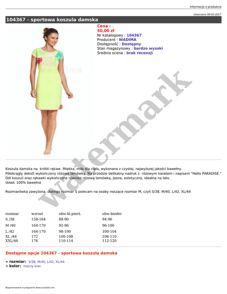 Informacje o produkcie Utworzono 09-03-2017 104367 - sportowa koszula damska Cena : 50,00 zł er m ar k Nr katalogowy : 104367 Producent : WADIMA Dostępność : Dostępny Stan magazynowy : bardzo wysoki Średnia ocena : brak recenzji at Koszula damska na krótki rękaw. Miękka, miła dla ciała, wykonana z czystej, najwyższej jakości bawełny. Półokrągły dekolt wykończony różową lamówką. Na przodzie delikatny nadruk z różowym kwiatem i napisem "Hello PARADISE." Dół koszuli oraz rękawki wykończone również różową lamówką. Jasna, estetyczna, idealna na lato. Skład: 100% bawełna w Rozmiarówka zawyżona, dlatego rozmiar S polecam na osoby noszące rozmiar M, czyli S/38, M/40, L/42, XL/44 rozmiar wzrost obw.kl.pierś. obw.bioder S /38 158-164 88-90 94-96 M /40 164-170 92-96 96-100 L /42 XL /44 XXL/46 164-170 172 176 98-100 100-108 110-114 100-104 106-110 112-120 Dostępne opcje 104367 - sportowa koszula damska » rozmiar: S/38, M/40, L/42, XL/44. » kolor: mocny kiwi. Wygenerowano w programie www.oscGold.com