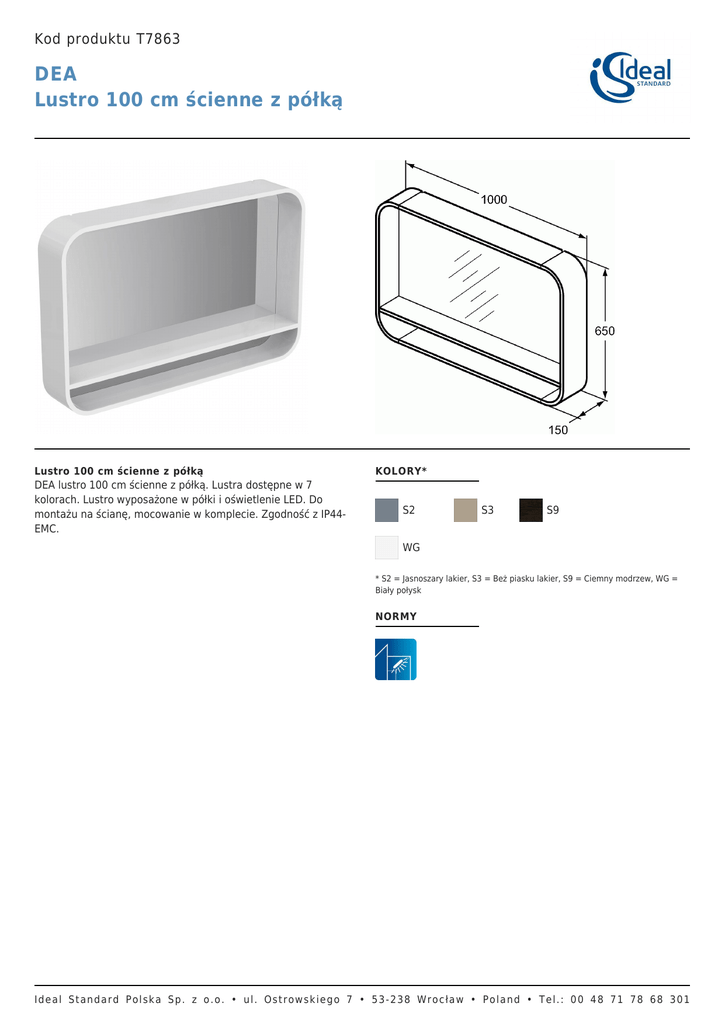 Kod produktu T7863 DEA Lustro 100 cm ścienne z półką Lustro 100 cm ścienne z półką DEA lustro 100 cm ścienne z półką. Lustra dostępne w 7 kolorach. Lustro wyposażone w półki i oświetlenie LED. Do montażu na ścianę, mocowanie w komplecie. Zgodność z IP44EMC. KOLORY* S2 S3 S9 WG * S2 = Jasnoszary lakier, S3 = Beż piasku lakier, S9 = Ciemny modrzew, WG = Biały połysk NORMY Ideal Standard Polska Sp. z o.o. • ul. Ostrowskiego 7 • 53-238 Wrocław • Poland • Tel.: 00 48 71 78 68 301