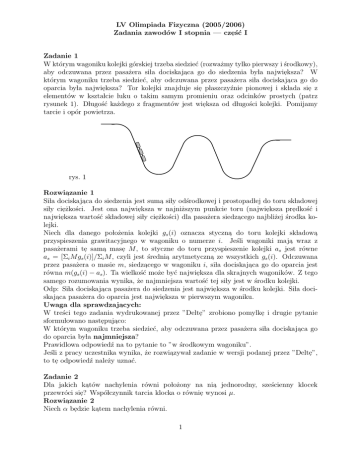 LV Olimpiada Fizyczna (2005/2006) Zadania zawodów I stopnia — cześć I , Zadanie 1 W którym wagoniku kolejki górskiej trzeba siedzieć (rozważmy tylko pierwszy i środkowy), aby odczuwana przez pasażera sila dociskajaca go do siedzenia byla najwieksza? W , , którym wagoniku trzeba siedzieć, aby odczuwana przez pasażera sila dociskajaca go do , oparcia byla najwieksza? Tor kolejki znajduje si e p laszczyźnie pionowej i sk lada sie, z , , elementów w ksztalcie luku o takim samym promieniu oraz odcinków prostych (patrz rysunek 1). Dlugość każdego z fragmentów jest wieksza od dlugości kolejki. Pomijamy , tarcie i opór powietrza. rys. 1 Rozwiazanie 1 , Sila dociskajaca do siedzenia jest suma, sily odśrodkowej i prostopadlej do toru skladowej , sily cieżkości. Jest ona najwieksza w najniższym punkcie toru (najwieksza predkość i , , , , najwieksza wartość sk ladowej si ly ci eżkości) dla pasażera siedz acego najbliżej środka ko, , , lejki. Niech dla danego polożenia kolejki gs (i) oznacza styczna, do toru kolejki skladowa, przyspieszenia grawitacyjnego w wagoniku o numerze i. Jeśli wagoniki maja, wraz z pasażerami te, sama, mase, M , to styczne do toru przyspieszenie kolejki as jest równe as = [Σi M gs (i)]/Σi M , czyli jest średnia, arytmetyczna, ze wszystkich gs (i). Odczuwana przez pasażera o masie m, siedzacego w wagoniku i, sila dociskajaca go do oparcia jest , , równa m(gs (i) − as ). Ta wielkość może być najwieksza dla skrajnych wagoników. Z tego , samego rozumowania wynika, że najmniejsza wartość tej sily jest w środku kolejki. Odp: Sila dociskajaca pasażera do siedzenia jest najwieksza w środku kolejki. Sila doci, , skajaca pasażera do oparcia jest najwieksza w pierwszym wagoniku. , , Uwaga dla sprawdzajacych: , W treści tego zadania wydrukowanej przez ”Delte” zrobiono pomylke, i drugie pytanie , sformulowano nastepuj aco: , , W którym wagoniku trzeba siedzieć, aby odczuwana przez pasażera sila dociskajaca go , do oparcia byla najmniejsza? Prawidlowa odpowiedź na to pytanie to ”w środkowym wagoniku”. Jeśli z pracy uczestnika wynika, że rozwiazywa l zadanie w wersji podanej przez ”Delte”, , , to te, odpowiedź należy uznać. Zadanie 2 Dla jakich katów nachylenia równi polożony na nia, jednorodny, sześcienny klocek , przewróci sie? Wspólczynnik tarcia klocka o równie, wynosi µ. , Rozwiazanie 2 , Niech α bedzie katem nachylenia równi. , , 1 Rozważmy najpierw przypadek, gdy klocek sie, zsuwa. Zachodzi to, jeśli równolegla do równi skladowa sily cieżkości jest wieksza od sily tarcia, czyli gdy mg sin α > µmg cos α. , Aby klocek sie, przewrócil, moment sily tarcia wzgledem środka masy klocka musi być , wiekszy od maksymalnego momentu sily reakcji podloża wzgledem tego środka, czyli , , a a µmg cos α > mg cos α. 2 2 Oznacza to, że w tym przypadku (tgα > µ) musi być µ > 1. Gdy klocek sie, nie zsuwa, czyli dla tgα ≤ µ, wygodnie jest rozważyć momenty sil wzgledem , ewentualnej osi obrotu klocka O. W chwili, gdy klocek zaczyna sie, przewracać, moment sily tarcia oraz moment sily reakcji równi wzgledem osi O sa, równe 0. Zatem klocek , sie, przewróci, jeśli moment (wzgledem O) równoleglej do równi skladowej sily cieżkości , , bedzie wi ekszy od momentu (wzgl edem O) prostopadlej do równi skladowej sily cieżkości, , , , czyli gdy a a mg sin α > mg cos α. 2 2 Odp: Klocek sie, przewróci gdy 1 < tgα, czyli 45◦ < α < 90◦ , ale tylko jeśli µ > 1. Dla µ ≤ 1 klocek nigdy sie, nie przewróci. Zadanie 3 Termometr Galileusza to kilka kulek zanurzonych w wodzie. W zależności od temperatury wody cześć z nich wynurza sie, opada na dno. Przyjmijmy, że kulka ma, niezależnie , a cześć , od temperatury, promień R = 1, 5 cm. Z jaka, dokladnościa, powinna być ustalona masa takiej kulki, aby pomiar temperatury odbywal sie, z dokladnościa, 1◦ C ? Potrzebne dane znajdź w tablicach. Rozwiazanie 3 , Oznaczmy przez β wspólczynnik rozszerzalności objetościowej wody. Przy wzroście , 3 temperatury o 1K masa wody zajmujacej obj etość (4/3)πR = 14, 1 cm3 zmaleje o , , β × 1 K × 14, 1 g i z taka, dokladnościa, powinna być określona masa kulki. Ponieważ wspólczynnik rozszerzalności objetościowej wody zależy od temperatury, ta dokladność , bedzie zależa la od zakresu temperatur, w którym ma dzialać nasz termometr. Przyjmijmy, , ◦ ◦ że tym zakresem jest np. 15 C – 30 C (termometry Galileusza to zwykle termometry pokojowe), co odpowiada wspólczynnikowi β zmieniajacemu sie, od 1, 5 × 10−4 K−1 do , 3, 0×10−4 K−1 . Biorac , najmniejsza, rozszerzalność z rozpatrywanego przedzialu (określona, przez najniższa, temperature), szukana dokladność wynosi 1, 5×10−4 ×14, 1 g ≈ 2×10−3 g. , Odp: Wymagana dokladność masy kulki zależy od zakresu temperatur, w których ma dzialać termometr. W termometrze mierzacym temperatury od 15 ◦ C, szukana dokladność , −3 powinna wynosić 2 × 10 g. Zadanie 4 Do sufitu przyczepiono nitke, na której zawieszono cialo o masie m. Pod tym cialem zawieszono na drugiej nitce cialo o takiej samej masie. Podaj przyspieszenie obu cial tuż po przecieciu górnej nitki oraz opisz jakościowo dalszy ruch tych cial. , Rozważ dwie możliwości: a) nitki sa, idealnie nierozciagliwe , b) nitki sa, w istocie gumkami o dużej stalej spreżystości. , Rozwiazanie 4 , a) Oba ciala bed , a, spadaly z przyspieszeniem g. b) Tuż po przecieciu górnej nitki napreżenie dolnej nitki sie, nie zmieni, zatem górne cialo , , bedzie sie, poruszalo z przyspieszeniem 2g, a dolne z zerowym przyspieszeniem. W miare, , 2 jak nitka bedzie sie, skracać przyspieszenie górnego ciala bedzie malalo, a dolnego roslo , , aż do momentu, gdy nitka osiagnie swoj a d lugość swobodn a. Od tej chwili oba ciala , , , bed mialo w każdym , a, poruszaly sie, z przyspieszeniem ziemskim, ale górne cialo bedzie , momencie wieksz a, predko