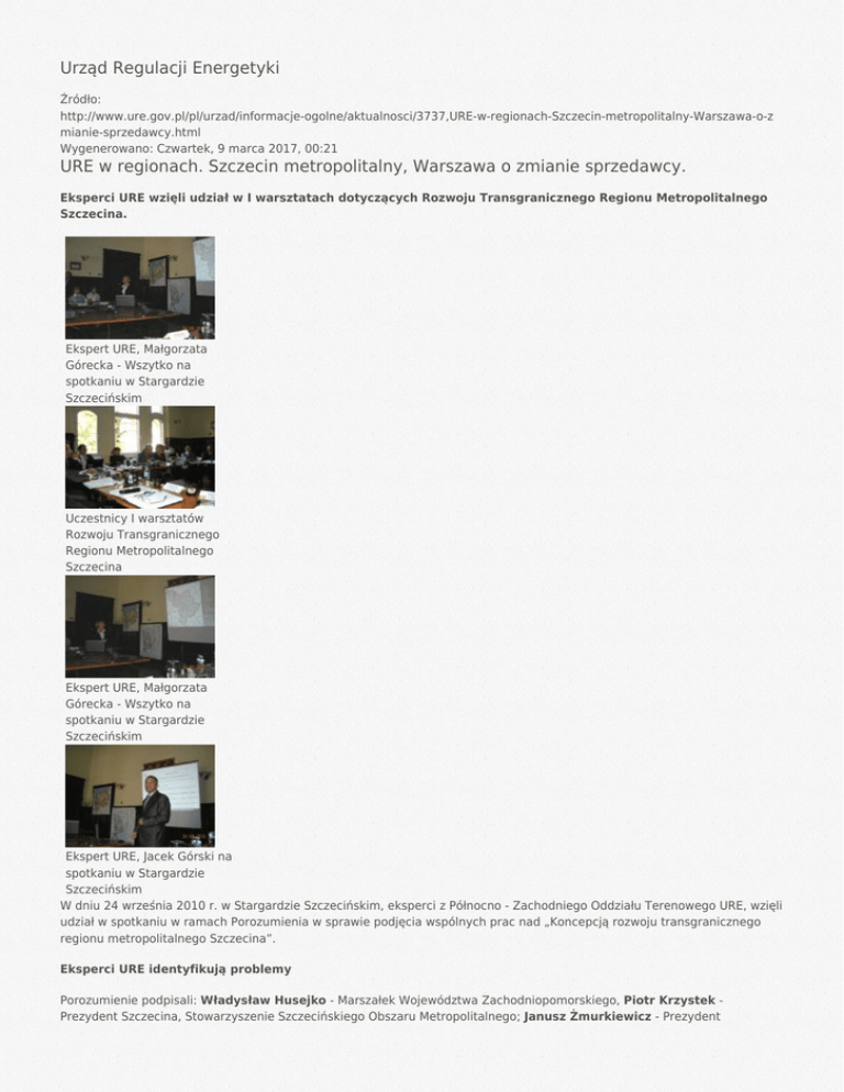 Urząd Regulacji Energetyki Źródło: http://www.ure.gov.pl/pl/urzad/informacje-ogolne/aktualnosci/3737,URE-w-regionach-Szczecin-metropolitalny-Warszawa-o-z mianie-sprzedawcy.html Wygenerowano: Czwartek, 9 marca 2017, 00:21 URE w regionach. Szczecin metropolitalny, Warszawa o zmianie sprzedawcy. Eksperci URE wzięli udział w I warsztatach dotyczących Rozwoju Transgranicznego Regionu Metropolitalnego Szczecina. Ekspert URE, Małgorzata Górecka - Wszytko na spotkaniu w Stargardzie Szczecińskim Uczestnicy I warsztatów Rozwoju Transgranicznego Regionu Metropolitalnego Szczecina Ekspert URE, Małgorzata Górecka - Wszytko na spotkaniu w Stargardzie Szczecińskim Ekspert URE, Jacek Górski na spotkaniu w Stargardzie Szczecińskim W dniu 24 września 2010 r. w Stargardzie Szczecińskim, eksperci z Północno - Zachodniego Oddziału Terenowego URE, wzięli udział w spotkaniu w ramach Porozumienia w sprawie podjęcia wspólnych prac nad „Koncepcją rozwoju transgranicznego regionu metropolitalnego Szczecina”. Eksperci URE identyfikują problemy Porozumienie podpisali: Władysław Husejko - Marszałek Województwa Zachodniopomorskiego, Piotr Krzystek Prezydent Szczecina, Stowarzyszenie Szczecińskiego Obszaru Metropolitalnego; Janusz Żmurkiewicz - Prezydent Świnoujścia, Gmina Miasto Świnoujście; Paweł Bartnik - Dyrektor Stowarzyszenia Gmin Polskich Pomerania. W trakcie I warsztatów dotyczących Rozwoju Transgranicznego Regionu Metropolitalnego Szczecina, Jacek Górski - ekspert URE - przedstawił prezentację dotyczącą „Sieci energetycznych - identyfikacji problemów”, natomiast Małgorzata Górecka - Wszytko, ekspert URE, przekazała informacje związane z opracowaniem projektów założeń do planu zaopatrzenia w ciepło, energię elektryczną i paliwa gazowe. Pogram rozwoju sektora energetycznego Kolejna informacja ze szczecińskiego oddziału URE dotyczy udziału ekspertów urzędu w konsultacjach społecznych. 22 września 2010 roku eksperci URE uczestniczyli w konsultacjach dotyczących „Programu rozwoju sektora energetycznego w woj. zachodniopomorskim do 2015 r. z częścią prognostyczną do 2030 r.” Program jest tworzony na zlecenie Marszałka Województwa Zachodniopomorskiego, dokument przygotowuje firma Case Doradcy Sp. z o.o. Podczas konsultacji społecznych Witold Kępa, dyrektor Północno - Zachodniego Oddziału Terenowego URE, przedstawił problemy związane z przyłączaniem farm wiatrowych do sieci oraz ciągłości dostaw energii elektrycznej do odbiorców. W konsultacjach uczestniczyli także przedstawiciele przedsiębiorstw energetycznych - ENEA Operator Sp. z o.o., ENERGA Operator SA i PSE Operator S.A. Odbiorco nie jesteś sam - w Warszawie Z kolei eksperci Oddziału Centralnego URE w Warszawie tylko we wrześniu 2010 roku zorganizowali dwa spotkania adresowane do odbiorców energii, związane z kampanią informacyjną „Masz wybór.” W dniach 21 i 28 września 2010 roku eksperci z Oddziału Centralnego URE w Warszawie przedstawiali konsumentom - odbiorcom energii procedury dotyczące wyboru najkorzystniejszej oferty na zakup energii elektrycznej oraz informowali o prawach i obowiązkach stron uczestniczących w procesie zmiany sprzedawcy. Rozmowy z ekspertami URE to okazja, by przekazać odbiorcom praktyczną wiedzę o tym jak skutecznie korzystać z istniejących procedur. Załączniki do strony Sieci energetyczne - identyfikacja problemów 334.41 KB Data dodania 06.10.2010 18:07 Sieci energetyczne identyfikacja problemów 1.8 MB Data dodania 06.10.2010 18:08 Data publikacji 06.10.2010 Tagi: