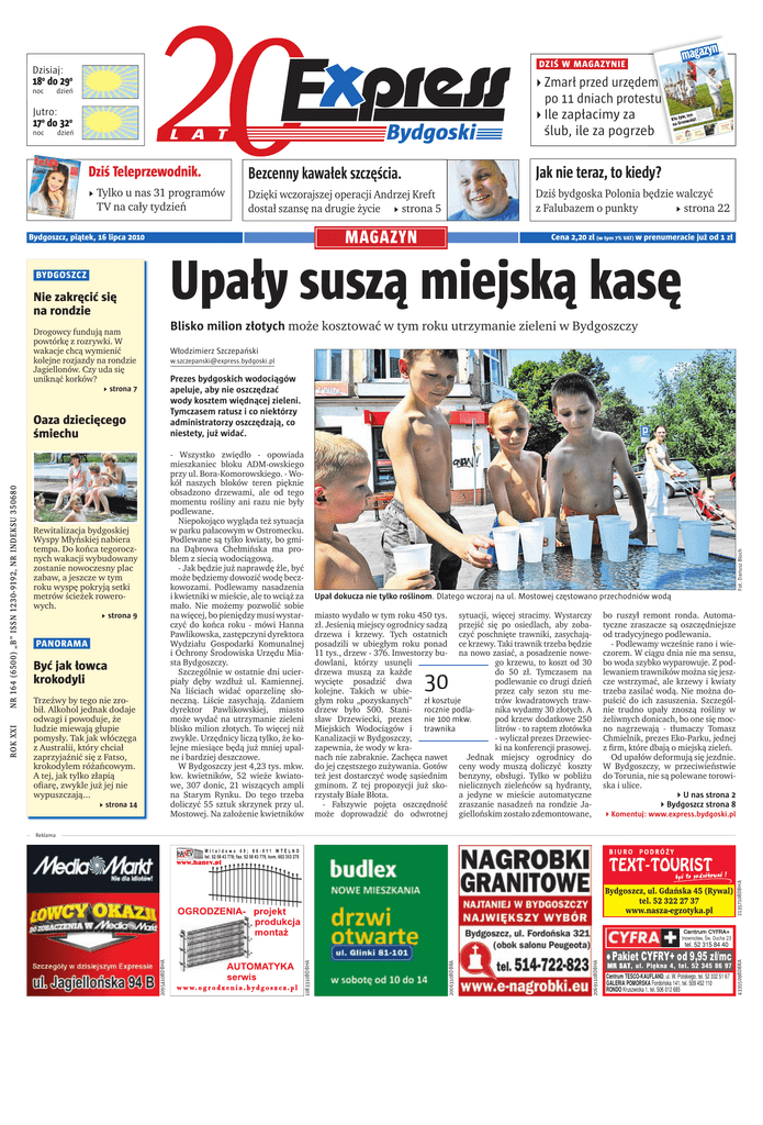 DZIŚ W MAGAZYNIE 18o do 29o Zmarł przed urzędem Jutro: po 11 dniach protestu Ile zapłacimy za ślub, ile za pogrzeb noc dzień 17o do 32o noc dzień ������� ����������� Dzisiaj: �� ������ �������� ������ pa a Euro widowisk To, co Takiego nie widziała. grunjeszcze arzy się na szansę ma jutro wyd polach, bnie rii, podo 600 waldzkich do histo się tam przejść zdarzyło M4-5 co strony jak to, . temu lat ������ ������� ������� � ������ ����� Dziś Teleprzewodnik. Tylko u nas 31 programów TV na cały tydzień ������ ��� ������ Dzięki wczorajszej operacji Andrzej Kreft dostał szansę na drugie życie strona 5 Dziś bydgoska Polonia będzie walczyć strona 22 z Falubazem o punkty MAGAZYN Cena 2,20 zł (w tym 7% VAT) w prenumeracie już od 1 zł Upały suszą miejską kasę Nie zakręcić się na rondzie Blisko milion złotych może kosztować w tym roku utrzymanie zieleni w Bydgoszczy Drogowcy fundują nam powtórkę z rozrywki. W wakacje chcą wymienić kolejne rozjazdy na rondzie Jagiellonów. Czy uda się uniknąć korków? Włodzimierz Szczepański [email protected] Prezes bydgoskich wodociągów apeluje, aby nie oszczędzać wody kosztem więdnącej zieleni. Tymczasem ratusz i co niektórzy administratorzy oszczędzają, co niestety, już widać. strona 7 Oaza dziecięcego śmiechu Rewitalizacja bydgoskiej Wyspy Młyńskiej nabiera tempa. Do końca tegorocznych wakacji wybudowany zostanie nowoczesny plac zabaw, a jeszcze w tym roku wyspę pokryją setki metrów ścieżek rowerowych. 9 PANORAMA Być jak łowca krokodyli Trzeźwy by tego nie zrobił. Alkohol jednak dodaje odwagi i powoduje, że ludzie miewają głupie pomysły. Tak jak włóczęga z Australii, który chciał zaprzyjaźnić się z Fatso, krokodylem różańcowym. A tej, jak tylko złapią ofiarę, zwykle już jej nie wypuszczają... strona 14 Fot. Dariusz Bloch - Wszystko zwiędło - opowiada mieszkaniec bloku ADM-owskiego przy ul. Bora-Komorowskiego. - Wokół naszych bloków teren pięknie obsadzono drzewami, ale od tego momentu rośliny ani razu nie były podlewane. Niepokojąco wygląda też sytuacja w parku pałacowym w Ostromecku. Podlewane są tylko kwiaty, bo gmina Dąbrowa Chełmińska ma problem z siecią wodociągową. - Jak będzie już naprawdę źle, być może będziemy dowozić wodę beczkowozami. Podlewamy nasadzenia i kwietniki w mieście, ale to wciąż za mało. Nie możemy pozwolić sobie na więcej, bo pieniędzy musi wystarczyć do końca roku - mówi Hanna Pawlikowska, zastępczyni dyrektora Wydziału Gospodarki Komunalnej i Ochrony Środowiska Urzędu Miasta Bydgoszczy. Szczególnie w ostatnie dni ucierpiały dęby wzdłuż ul. Kamiennej. Na liściach widać oparzelinę słoneczną. Liście zasychają. Zdaniem dyrektor Pawlikowskiej, miasto może wydać na utrzymanie zieleni blisko milion złotych. To więcej niż zwykle. Urzędnicy liczą tylko, że kolejne miesiące będą już mniej upalne i bardziej deszczowe. W Bydgoszczy jest 4,23 tys. mkw. kw. kwietników, 52 wieże kwiatowe, 307 donic, 21 wiszących ampli na Starym Rynku. Do tego trzeba doliczyć 55 sztuk skrzynek przy ul. Mostowej. Na założenie kwietników Upał dokucza nie tylko roślinom. Dlatego wczoraj na ul. Mostowej częstowano przechodniów wodą miasto wydało w tym roku 450 tys. sytuacji, więcej stracimy. Wystarczy zł. Jesienią miejscy ogrodnicy sadzą przejść się po osiedlach, aby zobadrzewa i krzewy. Tych ostatnich czyć poschnięte trawniki, zasychająposadzili w ubiegłym roku ponad ce krzewy. Taki trawnik trzeba będzie 11 tys., drzew - 376. Inwestorzy bu- na nowo zasiać, a posadzenie nowedowlani, którzy usunęli go krzewu, to koszt od 30 drzewa muszą za każde do 50 zł. Tymczasem na wycięte posadzić dwa podlewanie co drugi dzień kolejne. Takich w ubieprzez cały sezon stu megłym roku „pozyskanych” zł kosztuje trów kwadratowych trawdrzew było 500. Stani- rocznie podlanika wydamy 30 złotych. A sław Drzewiecki, prezes nie 100 mkw. pod krzew dodatkowe 250 Miejskich Wodociągów i trawnika litrów - to raptem złotówka Kanalizacji w Bydgoszczy, - wyliczał prezes Drzewieczapewnia, że wody w kraki na konferencji prasowej. Jednak miejscy ogrodnicy do nach nie zabraknie. Zachęca nawet do jej częstszego zużywania. Gotów ceny wody muszą doliczyć koszty też jest dostarczyć wodę sąsiednim benzyny, obsługi. Tylko w pobliżu gminom. Z tej propozycji już sko- nielicznych zieleńców są hydranty, a jedyne w mieście automatyczne rzystały Białe Błota. - Fałszywie pojęta oszczędność zraszanie nasadzeń na rondzie Jamoże doprowadzić do odwrotnej giellońskim zostało zdemontowane, bo ruszył remont ronda. Automatyczne zraszacze są oszczędniejsze od tradycyjnego podlewania. - Podlewamy wcześnie rano i wieczorem. W ciągu dnia nie ma sensu, bo woda szybko wyparowuje. Z podlewaniem trawników można się jeszcze wstrzymać, ale krzewy i kwiaty trzeba zasilać wodą. Nie można dopuścić do ich zasuszenia. Szczególnie trudno upały znoszą rośliny w żeliwnych donicach, bo one się mocno nagrzewają - tłumaczy Tomasz Chmielnik, prezes Eko-Parku, jednej z firm, które dbają o miejską zieleń. Od upałów deformują się jezdnie. W Bydgoszczy, w przeciwieństwie do Torunia, nie są polewane torowiska i ulice. U nas strona 2 Bydgoszcz strona 8 30 Komentuj: www.express.bydgoski.pl Bydgoszcz, ul. Gdańska 45 (Rywal) tel. 52 322 27 37 www.nasza-egzotyka.pl 2135710BDBHA Reklama Centrum CYFRA+ Inowrocław, Św. Ducha 23 � Pakiet CYFRY+ od 9,95 zł/mc MR SAT, ul. Piękna 4, tel. 52 345 86 97 Centrum TESCO-KAUFLAND, ul. W. Polskiego, tel. 52 332 51 67 GALERIA POMORSKA Fordońska 141, tel. 509 452 110 RONDO Kruszwicka 1, tel. 506 012 685 4335509BDBRA 2069110BDBHA 2006310BDBRA 1083310BDBHA tel. 52 315 84 40 2095410BDBHA 