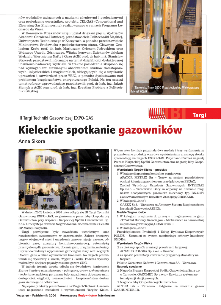 nów wydziałów związanych z naukami górniczymi i geologicznymi oraz posiedzenie uczestników projektu CELGAS (Conventional and Elearning Gas Engineering), realizowanego w ramach Programu Leonardo da Vinci. W Konwencie Dziekanów wzięli udział dziekani pięciu Wydziałów Akademii Górniczo-Hutniczej, przedstawiciele Politechniki Śląskiej, Uniwersytetu Technicznego w Koszycach, a ponadto przedstawiciele Ministerstwa Środowiska z podsekretarzem stanu, Głównym Geologiem Kraju prof. dr. hab. Mariuszem Orionem-Jędryskiem oraz Wyższego Urzędu Górniczego. Witając konwent Dziekanów dziekan Wydziału Wiertnictwa Nafty i Gazu AGH prof. dr hab. inż. Stanisław Stryczek przedstawił informacje na temat działalności dydaktycznej i naukowo-badawczej Wydziału. W trakcie posiedzenia skupiono się nad wymaganiami stawianymi absolwentom studiów dwustopniowych: inżynierskich i magisterskich, ubiegających się o uzyskanie uprawnień i zatwierdzeń przez WUG, a ponadto dyskutowano nad problemem bezpieczeństwa energetycznego Polski. Na ten ostatni temat referaty wprowadzające przedstawili: prof. dr hab. inż. Jakub Siemek z AGH oraz prof. dr hab. inż. Krystian Probierz z Politechniki Śląskiej. Stanowisko firmy GEOD Przedsiębiorstwo Wielobranżowe Michał Wójcik NB NBI N BI III Targi Techniki Gazowniczej EXPO-GAS Targi Kieleckie spotkanie gazowników Anna Sikora W dniach 26-28 kwietnia 2006 roku odbyły się III Targi Techniki Gazowniczej EXPO-GAS, zorganizowane przez Izbę Gospodarczą Gazownictwa przy wsparciu Karpackiej Spółki Gazownictwa Sp. z o.o. Uroczystego otwarcia targów dokonał wicemarszałek Senatu RP Maciej Płażyński. Targi poświęcone były nowościom technicznym oraz rozwiązaniom systemowym w gazownictwie. Zakres branżowy targów obejmował sieci i urządzenia gazowe, stacje gazowe, odbiorniki gazu, aparaturę kontrolno-pomiarową, automatykę przemysłową dla gazownictwa, tłocznie gazu, urządzenia, materiały i sprzęt do budowy i wyposażenia gazociągów, stacji redukcyjnych i tłoczni gazu, a także wydawnictwa branżowe. Na targach prezentowali się wystawcy z Czech, Węgier i Polski. Podczas wystawy można było obejrzeć pojazdy zasilane gazem CNG. W trakcie trwania targów odbyła się dwudniowa konferencja Szanse i bariery gazu ziemnego – polityczne, prawne, ekonomiczne i techniczne, na której poruszane były zagadnienia dotyczące m.in. dostępności, ciągłości, niezawodności i bezpieczeństwa dostaw gazu ziemnego do odbiorców. Najlepsze produkty prezentowane na Targach Techniki Gazowniczej nagrodzono medalami i wyróżnieniami Targów Kielce. Wrzesień – Październik 2006 W tym roku komisja przyznała dwa medale i trzy wyróżnienia za prezentowane produkty oraz dwa wyróżnienia za aranżację stoiska i prezentację na targach EXPO-GAS. Przyznano również nagrodę Prezesa Karpackiej Spółki Gazownictwa oraz nagrodę Izby Gospodarczej Gazownictwa. Wyróżnienia Targów Kielce – produkty 1. W kategorii aparatura kontrolno-pomiarowa: APATOR METRIX SA – Tczew za system przedpłatowej obsługi klienta z gazomierzem przedpłatowym PEGAZ; Zakład Wytwórczy Urządzeń Gazowniczych INTERGAZ Sp. z o.o. – Tarnowskie Góry za odporny na działanie magnesów neodymowych gazomierz miechowy typ BK-G4V2 z antywłamaniowym liczydłem Z6 z opcją CHEKKER. 2. W kategorii „inne”: GAZEX Sp.j. – Warszawa za Aktywny System Bezpieczeństwa Instalacji Gazowych (ASBIG). Medale Targów Kielce 1. W kategorii urządzenia do przesyłu i magazynowania gazu: JT Zakład Budowy Gazociągów – Michałowice za nawanialnię impulsowo-grawitacyjną GRAWITON 1. 2. W kategorii „inne”: Przedsiębiorstwo Produkcji i Usług Rynkowo-Eksportowych POLDE – Strumień za system monitoringu ochrony katodowej SMOK-4. Wyróżnienia Targów Kielce ❑ za ciekawy sposób aranżacji przestrzeni targowej: ACTARIS POLSKA Sp. z o.o. – Kraków; ❑ za sposób prezentacji i tworzenie przyjaznej atmosfery na targach: Polskie Górnictwo Naftowe i Gazownictwo SA – Warszawa. Nagrody specjalne ❑ Nagroda Prezesa Karpackiej Spółki Gazownictwa Sp. z o.o. w Tarnowie: GAZOMET Sp. z o.o. – Rawicz za system automatyzacji stacji gazowych. ❑ Nagroda Izby Gospodarczej Gazownictwa: ALTER SA – Tarnowo Podgórne za miernik gazów GASHUNTER IR. Nowoczesne Budownictwo Inżynieryjne 25