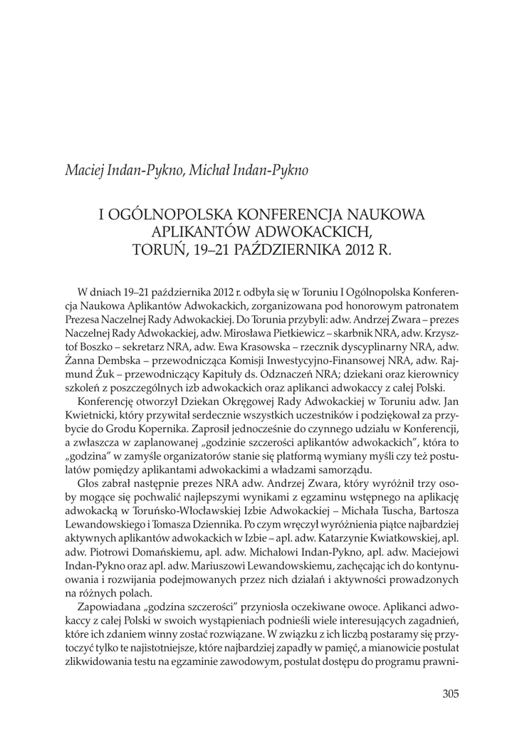 Maciej Indan-Pykno, Michał Indan-Pykno I Ogólnopolska Konferencja Naukowa Aplikantów Adwokackich, Toruń, 19–21 października 2012 r. W dniach 19–21 października 2012 r. odbyła się w Toruniu I Ogólnopolska Konferencja Naukowa Aplikantów Adwokackich, zorganizowana pod honorowym patronatem Prezesa Naczelnej Rady Adwokackiej. Do Torunia przybyli: adw. Andrzej Zwara – prezes Naczelnej Rady Adwokackiej, adw. Mirosława Pietkiewicz – skarbnik NRA, adw. Krzysztof Boszko – sekretarz NRA, adw. Ewa Krasowska – rzecznik dyscyplinarny NRA, adw. Żanna Dembska – przewodnicząca Komisji Inwestycyjno-Finansowej NRA, adw. Rajmund Żuk – przewodniczący Kapituły ds. Odznaczeń NRA; dziekani oraz kierownicy szkoleń z poszczególnych izb adwokackich oraz aplikanci adwokaccy z całej Polski. Konferencję otworzył Dziekan Okręgowej Rady Adwokackiej w Toruniu adw. Jan Kwietnicki, który przywitał serdecznie wszystkich uczestników i podziękował za przybycie do Grodu Kopernika. Zaprosił jednocześnie do czynnego udziału w Konferencji, a zwłaszcza w zaplanowanej „godzinie szczerości aplikantów adwokackich”, która to „godzina” w zamyśle organizatorów stanie się platformą wymiany myśli czy też postulatów pomiędzy aplikantami adwokackimi a władzami samorządu. Głos zabrał następnie prezes NRA adw. Andrzej Zwara, który wyróżnił trzy osoby mogące się pochwalić najlepszymi wynikami z egzaminu wstępnego na aplikację adwokacką w Toruńsko-Włocławskiej Izbie Adwokackiej – Michała Tuscha, Bartosza Lewandowskiego i Tomasza Dziennika. Po czym wręczył wyróżnienia piątce najbardziej aktywnych aplikantów adwokackich w Izbie – apl. adw. Katarzynie Kwiatkowskiej, apl. adw. Piotrowi Domańskiemu, apl. adw. Michałowi Indan-Pykno, apl. adw. Maciejowi Indan-Pykno oraz apl. adw. Mariuszowi Lewandowskiemu, zachęcając ich do kontynuowania i rozwijania podejmowanych przez nich działań i aktywności prowadzonych na różnych polach. Zapowiadana „godzina szczerości” przyniosła oczekiwane owoce. Aplikanci adwokaccy z całej Polski w swoich wystąpieniach podnieśli wiele interesujących zagadnień, które ich zdaniem winny zostać rozwiązane. W związku z ich liczbą postaramy się przytoczyć tylko te najistotniejsze, które najbardziej zapadły w pamięć, a mianowicie postulat zlikwidowania testu na egzaminie zawodowym, postulat dostępu do programu prawni- 305 Maciej Indan-Pykno, Michał Indan-Pykno PALESTRA czego dla każdego zdającego egzamin adwokacki, postulat wprowadzenia ubezpieczenia zdrowotnego aplikantów adwokackich, postulat organizowania wspólnych szkoleń międzyizbowych aplikantów adwokackich, postulat większej obecności Adwokatury w mediach, postulat podjęcia działań prawnych mających na celu zwiększenia opłat za prowadzenie spraw z urzędu. Wszystkie podniesione problemy zostały „na gorąco” skomentowane przez prezesa Naczelnej Rady Adwokackiej. Pierwszą część Konferencji zwieńczył koncert finalisty XIII Międzynarodowego Konkursu Chopinowskiego Pawła Wakarecego, który w pierwszej części zaproponował Gościom „międzynarodowy aperitif ” znakomitych autorów, natomiast w drugiej części przedstawił fragmenty najbardziej znanych dzieł Fryderyka Chopina. Dziekan Okręgowej Rady Adwokackiej, dziękując za udział w pierwszym dniu konferencji, zaprosił prezesa Naczelnej Rady Adwokackiej, członków Naczelnej Rady Adwokackiej, dziekanów, kierowników szkoleń na uroczystą kolację w Ratuszu Miasta Torunia. Aplikanci adwokaccy udali się z kolei do klubu „Jan Olbracht”, aby realizować podstawowy postulat samorządu aplikanckiego – integrację międzyizbową. Drugi dzień konferencji rozpoczął się wykładem prezesa Naczelnej Rady Adwokackiej adw. Andrzeja Zwary, który jeszcze raz odniósł się do podniesionych poprzedniego dnia postulatów, przedstawiając zgromadzonym na sali plenarnej aplikantom adwokackim realne możliwości ich realizacji. W drugiej części swojego wystąpienia Prezes zarysował wizję Adwokatury jako prężnego, dynamicznego i ambitnego samorządu zawodowego zmierzającego do odgrywania coraz to aktywniejszej roli w sferze nie tylko stricte zawodowej, ale także społecznej i politycznej. Kolejne wystąpienie zainaugurował prof. dr hab. Andrzej Zieliński (Uniwersytet Kardynała Stefana Wyszyńskiego), adwokat, wybitny procesualista. W pierwszej części swojego wykładu przedstawił zmiany wprowadzone do procedury cywilnej na podstawie nowelizacji, która weszła w życie z dniem 3 maja 2012 r., natomiast w drugiej części przekazał słuchaczom praktyczne uwagi odnoszące się do konstruowania apelacji cywilnej. Dokonując szerokiej analizy wprowadzonych zmian, systematyzując je w poszczególne bloki tematyczne, prof. Andrzej Zieliński ukazał słuchaczom istotę wprowadzonych zmian, nie uciekając od skomentowania zasadności ich wprowadzenia. Pojawiające się liczne pytania ze strony aplikantów adwokackich nadały wykładowi walor żywej dyskusji, która doprowadziła uczestników do wielu ciekawych spostrzeżeń, pomocnych w praktycznym stosowaniu Kodeksu postępowania cywilnego po zmianach. I Ogólnopolska Konferencja Naukowa Aplikantów Adwokackich w Toruniu pokazała, jak istotną rolę odgrywają ogólnopolskie międzyizbowe spotkania aplikantów adwokackich z całej Polski. Powstały w jej ramach ferment intelektualny na pewno przełoży się na lepsze funkcjonowanie samorządu adwokackiego, w tym coraz to liczniejszego samorządu aplikantów adwokackich. Z największą przyjemnością przychylamy się do słów wygłaszanych przez uczestników naszej Konferencji, że „pierwsza konferencja” stanowi dla nas zobowiązanie do organizacji w niedalekiej przyszłości kolejnych, być może cyklicznych, podobnych imprez, których gospodarzem będzie Kujawsko-Pomorska Izba Adwokacka w Toruniu. 306