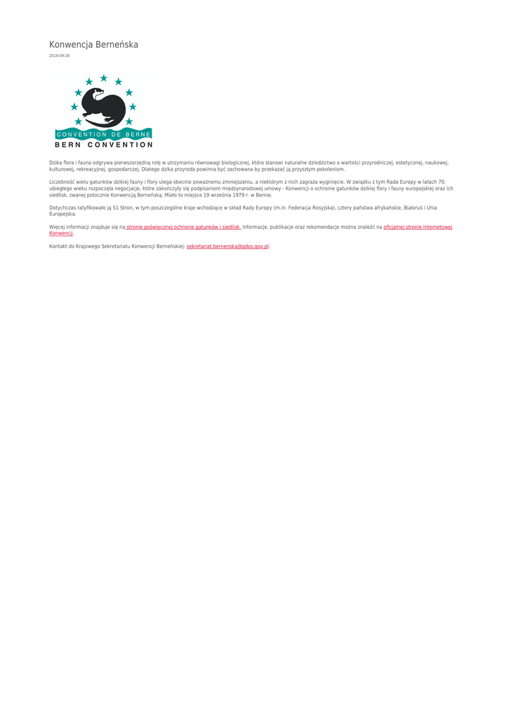 Konwencja Berneńska 2016-09-28 Dzika flora i fauna odgrywa pierwszorzędną rolę w utrzymaniu równowagi biologicznej, która stanowi naturalne dziedzictwo o wartości przyrodniczej, estetycznej, naukowej, kulturowej, rekreacyjnej, gospodarczej. Dlatego dzika przyroda powinna być zachowana by przekazać ją przyszłym pokoleniom. Liczebność wielu gatunków dzikiej fauny i flory ulega obecnie poważnemu zmniejszeniu, a niektórym z nich zagraża wyginięcie. W związku z tym Rada Europy w latach 70. ubiegłego wieku rozpoczęła negocjacje, które zakończyły się podpisaniem międzynarodowej umowy - Konwencji o ochronie gatunków dzikiej flory i fauny europejskiej oraz ich siedlisk, zwanej potocznie Konwencją Berneńską. Miało to miejsce 19 września 1979 r. w Bernie. Dotychczas ratyfikowało ją 51 Stron, w tym poszczególne kraje wchodzące w skład Rady Europy (m.in. Federacja Rosyjska), cztery państwa afrykańskie, Białoruś i Unia Europejska. Więcej informacji znajduje się na stronie poświęconej ochronie gatunków i siedlisk. Informacje, publikacje oraz rekomendacje można znaleźć na oficjalnej stronie internetowej Konwencji. Kontakt do Krajowego Sekretariatu Konwencji Berneńskiej: [email protected].