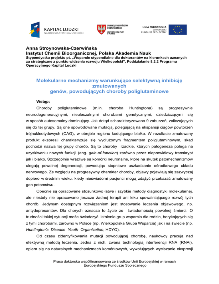 Anna Stroynowska-Czerwińska Instytut Chemii Bioorganicznej, Polska Akademia Nauk Stypendystka projektu pt. „Wsparcie stypendialne dla doktorantów na kierunkach uznanych za strategiczne z punktu widzenia rozwoju Wielkopolski”, Poddziałanie 8.2.2 Programu Operacyjnego Kapitał Ludzki Molekularne mechanizmy warunkujące selektywną inhibicję zmutowanych genów, powodujących choroby poliglutaminowe Wstęp: Choroby poliglutaminowe neurodegeneracyjnymi, (m.in. nieuleczalnymi choroba chorobami Huntingtona) genetycznymi, są progresywnie dziedziczącymi się w sposób autosomalny dominujący. Jak dotąd scharakteryzowano 9 zaburzeń, zaliczających się do tej grupy. Są one spowodowane mutacją, polegającą na ekspansji ciągów powtórzeń trójnukleotydowych (CAG)n w obrębie regionu kodującego białko. W rezultacie zmutowany produkt ekspresji charakteryzuje się wydłużonym fragmentem poliglutaminowym, skąd pochodzi nazwa tej grupy chorób. Są to choroby rzadkie, których patogeneza polega na uzyskiwaniu nowych funkcji (ang. gain-of-function) zarówno przez nieprawidłowy transkrypt jak i białko. Szczególnie wrażliwe są komórki neuronalne, które na skutek patomechanizmów ulegają powolnej degeneracji, powodując stopniowe uszkadzanie ośrodkowego układu nerwowego. Ze względu na progresywny charakter choroby, objawy pojawiają się zazwyczaj dopiero w średnim wieku, kiedy nieświadomi pacjenci mogą zdążyć przekazać zmutowany gen potomstwu. Obecnie są opracowane stosunkowo łatwe i szybkie metody diagnostyki molekularnej, ale niestety nie opracowano jeszcze żadnej terapii ani leku spowalniającego rozwój tych chorób. Jedynym dostępnym rozwiązaniem jest stosowanie leczenia objawowego, np. antydepresantów. Dla chorych oznacza to życie ze świadomością powolnej śmierci. O trudności takiej sytuacji może świadczyć istnienie grup wsparcia dla rodzin, borykających się z tymi chorobami, zarówno w Polsce (np. Wielkopolska Grupa Wsparcia) jak i na świecie (np. Huntington’s Disease Youth Organization, HDYO). Od czasu zidentyfikowania mutacji powodującej chorobę, naukowcy pracują nad efektywną metodą leczenia. Jedna z nich, zwana technologią interferencji RNA (RNAi), opiera się na naturalnych mechanizmach komórkowych, wywołujących wyciszanie ekspresji Praca doktorska współfinansowana ze środków Unii Europejskiej w ramach Europejskiego Funduszu Społecznego wybranych genów poprzez degradację transkryptu za pomocą syntetycznych, krótkich, w pełni komplementarnych do sekwencji celowanej oligonukleotydów siRNA. Jednocześnie prowadzone są badania nad wykorzystaniem innego rodzaju oligonukleotydów – naturalnych miRNA, których cechą charakterystyczną jest występowanie niesparowań pomiędzy sekwencją miRNA i mRNA oraz wyciszenie ekspresji na poziomie deadenylacji i degradacji transkryptu i/lub inhibicji translacji. Cele naukowe projektu: W ramach projektu dotyczącego mojej pracy doktorskiej badam molekularny mechanizm działania syntetycznych miRNA-podobnych siRNA, które są potencjalnymi terapeutykami dla chorób poliglutaminowych. Sekwencja tych oligonukleotydów to kilkukrotnie powtórzony motyw CUG, zawierający pojedyncze substytucje. Umożliwia to celowanie i wiązanie się z wydłużonymi ciągami powtórzeń CAG, w nie pełni komplementarny sposób. Dzięki powstającym niesparowaniom pomiędzy siRNA oraz transkryptem, obserwujemy miRNA-podobny mechanizm regulacji ekspresji genów. Podobnie do miRNA badane oligonukleotydy wykazują silniejszy efekt wyciszania w przypadku obecności dłuższej, powtórzonej sekwencji docelowej. Ta obserwacja ma bezpośrednie przełożenie na obserwowaną allelo-selektywność, tzn. silniejsze wyciszenie ekspresji allelu zmutowanego w porównaniu do allelu normalnego. Jest to bardzo pożądany efekt, ponieważ prawidłowy allel (potrzebny do prawidłowego funkcjonowanie komórki) ulega niezmienionej lub nieznacznie zmienionej ekspresji podobnie jak inne geny zawierające powtórzenia CAG, np. TRBP. Dzięki temu obserwuje się mniejszą cytotoksyczność miRNApodobnych siRNA (przez ograniczenie niespecyficznego wyciszania znanego jako zjawisko off-target). Możliwości praktycznego wykorzystania wiedzy: Dokładna analiza mechanizmu działania badanych oligonukleotydów dostarczy nowych informacji na temat procesów regulacji ekspresji genów w komórkach ludzkich oraz cennych wskazówek na temat projektowania bardziej wydajnych i specyficznych siRNA, zawierających niesparowania z sekwencją docelową. Mamy nadzieję, że uzyskane wyniki pozwolą nam otrzymać dokładne informacje na temat czynników determinujących efektywność działania miRNA-podobnych siRNA. Dzięki temu, można będzie precyzyjniej i skuteczniej projektować oligonukleotydy o pożądanych cechach terapeutycznych. Praca doktorska współfinansowana ze środków Unii Europejskiej w ramach Europejskiego Funduszu Społecznego