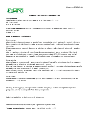 Warszawa 2016-03-03 ZAPROSZENIE DO SKŁADANIA OFERT Zamawiający: Miejskie Przedsiębiorstwo Oczyszczania w m. st. Warszawie Sp. z o.o. ul. Obozowa 43 01-161 Warszawa Przedmiot zamówienia (z wyszczególnieniem rodzaju asortymentu/towaru jego ilości oraz jednostki miary): Usługi DDD Opis przedmiotu zamówienia: Deratyzacja: a) rozstawienie i zamontowanie na koszt własny pojemników - stacji bajtowych i poideł, w których będą rozkładane trutki. Ponadto trutki na szczury należy również rozkładać bezpośrednio do nor szczurów, b) przeprowadzenie inspekcji dwa razy w miesiącu w celu sprawdzenia stacji bajtowych i wymiany trutek, c) w przypadku występujących zagrożeń wykonawca zobowiązuje się do przyjazdu i likwidacji zagrożeń po telefonicznym zawiadomieniu przez pracownika OUZ-2. Wykonawca musi podjąć interwencję nie później niż w ciągu 24 h od telefonicznego zgłoszenia przez zamawiającego. Dezynsekcja: a) rozpylanie na zewnętrznych i wewnętrznych ścianach budynków administracyjnych preparatów owadobójczych, głównie w miesiącach wiosennych i letnich, b) rozpylenie dwa razy w miesiącu w pomieszczeniach socjalnych pozostałych budynków preparatów owadobójczych na wewnętrznych ścianach pomieszczeń, c) rozpylenie dwa razy w miesiącu preparatów owadobójczych na bramach zasypowych i ścianach wewnętrznych budynku fos. Dezynfekcja: a) nakładanie preparatów bakteriobójczych na poszczególne urządzenia każdorazowo przed ich remontem - 3 razy w roku. Intencją zamawiającego jest wyłonienie w drodze niniejszego zamówienia wykonawcy w celu podpisania umowy na usługi DDD na okres jednego roku. Lokalizacja obiektu: ul. Zabraniecka 2, Warszawa. Przed złożeniem oferty zapraszamy do zapoznania się z obiektem. Termin składania ofert upływa w dn.: 2016-03-08 o godz. 10:00 Osoba do kontaktu w sprawie zamówienia z ramienia komórki metorycznie odpowiedzialnej za przedmiot zamówienia: Małgorzata Doktór Tel. kontaktowy: 228110028 wew. 130 Oferty należy nadesłać w jednej z następujących form: - drogą mailową na adres: [email protected] - w formie pisemnej: ul. Obozowa 43 Ocena ofert będzie dokonywana na podstawie następujących kryteriów: cena - 100% Zapraszamy do składania ofert.
