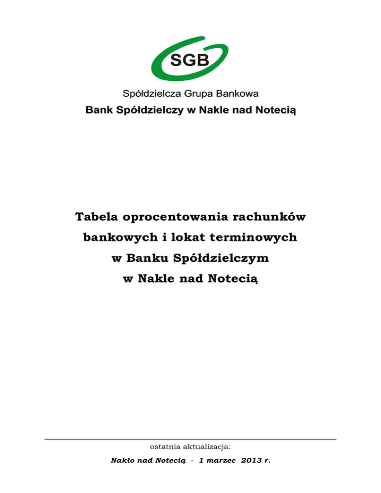 Tabela oprocentowania rachunków bankowych i lokat terminowych w Banku Spółdzielczym w Nakle nad Notecią ostatnia aktualizacja: Nakło nad Notecią - 1 marzec 2013 r. Rachunki bankowe – oprocentowanie zmienne rodzaj rachunku Rachunek oszczędnościowo-rozliczeniowy /ROR/ Rachunek oszczędnościowy a’vista Rachunek bieżący / pomocniczy oprocentowanie minimalna wpłata 0,20 % 0,00 % 0,10 % 100 zł - Rachunek oszczędnościowy – oprocentowanie zmienne Minimalna wpłata warunkująca otwarcie rachunku oszczędnościowego wynosi 100 zł stan środków na rachunku Oprocentowanie do 100 zł powyżej 100 zł do 20.000 zł powyżej 20.000 zł 0,00 % 3,40 % 4,40 % Wkłady i lokaty terminowe - oprocentowanie zmienne Minimalna wpłata warunkująca otwarcie rachunku lokaty wynosi 50 zł zdeponowana kwota pieniężna: zadeklarowany okres dla lokaty pieniężnej poniżej 20.000 zł od 20.000 zł od 50.000 zł od 100.000 zł Oprocentowanie 4 dniowe 14 dniowe 1 miesięczne 3 miesięczne 4 miesięczne 6 miesięczne 9 miesięczne 12 miesięczne 1,60% 1,80% 3,10% 3,75% 3,75% 4,20% 4,25% 4,70% 1,70% 1,90% 3,20% 3,80% 3,80% 4,30% 4,35% 4,90% 1,80% 2,00% 3,40% 3,85% 3,85% 4,40% 4,45% 5,10% 1,90% 2,10% 3,80% 4,00% 4,00% 4,50% 4,60% 5,30% Wkłady i lokaty terminowe - oprocentowanie stałe Minimalna wpłata warunkująca otwarcie rachunku lokaty wynosi 50 zł. zdeponowana kwota pieniężna: zadeklarowany okres dla lokaty pieniężnej poniżej 20.000 zł od 20.000 zł od 50.000 zł od 100.000 zł oprocentowanie 3 miesięczne 4 miesięczne 6 miesięczne 4,10% 4,10% 4,00% 4,10% 4,10% 4,00% 4,20% 4,20% 4,10% 4,20% 4,20% 4,10% 2 Wkłady i lokaty terminowe - oprocentowanie zmienne Minimalna wpłata warunkująca otwarcie rachunku lokaty wynosi 50 zł. zadeklarowany okres dla lokaty oprocentowanie 18 miesięczne 24 miesięczne 36 miesięczne 5,00% 5,10% 5,20% Lokata „KASKADA” – oprocentowanie zmienne zadeklarowany okres dla lokaty oprocentowanie Minimalna wpłata 5,00% 5,10% 5,20% 5,30% 5,40% 20 zł 20 zł 20 zł 20 zł 20 zł 2 letnie 3 letnie 5 letnie 10 letnie 15 letnie Lokata „PLEJADA” – oprocentowanie zmienne Minimalna wpłata warunkująca otwarcie rachunku lokaty wynosi: • 500 zł dla Klientów Indywidualnych • 1 000 zł dla Klientów Instytucjonalnych zdeponowana kwota pieniężna: zadeklarowany okres dla lokaty do 5.000 zł od 5.000 zł oprocentowanie 1 miesięczne 2 miesięczne 3 miesięczne 4 miesięczne 5 miesięczne 6 miesięczne 7 miesięczne 8 miesięczne 9 miesięczne 10 miesięczne 11 miesięczne 12 miesięczne 2,4000% 2,5200% 2,6400% 2,7600% 2,8800% 3,0000% 3,1200% 3,2400% 3,3600% 3,4800% 3,6000% 3,7200% 2,5200% 2,6400% 2,7600% 2,8400% 2,9600% 3,0800% 3,2000% 3,3200% 3,4400% 3,5600% 3,6800% 3,8000% Indywidualne Konto Emerytalne – oprocentowanie zmienne rodzaj oprocentowanie minimalna wpłata IKE SGB do 12 miesięcy 4,00 % - IKE SGB do 24 miesięcy IKE SGB do 60 miesięcy IKE SGB pow. 60 miesięcy 5,10 % 5,20 % 5,30 % - 3 Rachunki bankowe walutowe – oprocentowanie zmienne rodzaj rachunku Rachunek bieżący Rachunek bieżący Rachunek bieżący Rachunek oszczędnościowo - rozliczeniowy Rachunek oszczędnościowo - rozliczeniowy Rachunek oszczędnościowo - rozliczeniowy waluta oprocentowanie USD EUR GBP USD EUR GBP 0,25% 0,60% 0,25% 0,25% 0,60% 0,25% Lokaty terminowe walutowe – oprocentowanie stałe zadeklarowany okres dla lokaty waluta oprocentowanie 1 miesięczne USD 0,50% 1 miesięczne 3 miesięczne 3 miesięczne 6 miesięczne 6 miesięczne EUR USD EUR USD EUR 1,20% 0,60% 1,30% 0,70% 1,40% 4