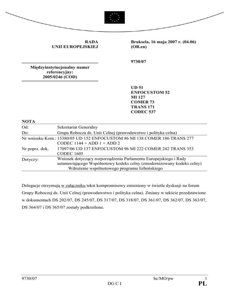 RADA UNII EUROPEJSKIEJ Bruksela, 16 maja 2007 r. (04.06) (OR.en) 9730/07 Międzyinstytucjonalny numer referencyjny: 2005/0246 (COD) UD 51 ENFOCUSTOM 52 MI 127 COMER 73 TRANS 171 CODEC 537 NOTA Od: Sekretariat Generalny Do: Grupa Robocza ds. Unii Celnej (prawodawstwo i polityka celna) Nr wniosku Kom.: 15380/05 UD 152 ENFOCUSTOM 86 MI 138 COMER 186 TRANS 277 CODEC 1144 + ADD 1 + ADD 2 Nr poprz. dok. 17097/06 UD 137 ENFOCUSTOM 96 MI 222 COMER 242 TRANS 353 CODEC 1605 Wniosek dotyczący rozporządzenia Parlamentu Europejskiego i Rady Dotyczy: ustanawiającego Wspólnotowy kodeks celny (zmodernizowany kodeks celny) WdroŜenie wspólnotowego programu lizbońskiego Delegacje otrzymują w załączniku tekst kompromisowy zmieniony w świetle dyskusji na forum Grupy Roboczej ds. Unii Celnej (prawodawstwo i polityka celna). Zmiany w tekście przedstawione w dokumentach DS 202/07, DS 245/07, DS 317/07, DS 318/07, DS 361/07, DS 362/07, DS 363/07, DS 364/07 i DS 365/07 zostały podkreślone. 9730/07 bc/MO/pw DG C I 1 PL Ponadto wprowadzono następujące zmiany o charakterze horyzontalnym: - dostosowanie artykułów dotyczących procedury regulacyjnej połączonej z kontrolą w celu ujednolicenia ich z formułą uzgodnioną na poziomie międzyinstytucjonalnym, - w całym tekście stosuje się termin „przepisy prawa celnego”, - odniesienia do długu celnego w całym tekście zostało dostosowane do zmienionej definicji w art. 4 pkt 13 („kwota naleŜna”). _______________________ 9730/07 bc/MO/pw DG C I 2 PL ZAŁĄCZNIK WdroŜenie wspólnotowego programu lizbońskiego Wniosek ROZPORZĄDZENIE (WE) PARLAMENTU EUROPEJSKIEGO I RADY ustanawiające wspólnotowy kodeks celny (zmodernizowany kodeks celny) PARLAMENT EUROPEJSKI I RADA UNII EUROPEJSKIEJ, uwzględniając Traktat ustanawiający Wspólnotę Europejską, w szczególności jego art. 26, 95, 133 oraz 135, uwzględniając Protokół nr 2 do aktu przystąpienia Hiszpanii i Portugalii, w odniesieniu do Wysp Kanaryjskich oraz Ceuty i Melilli, a w szczególności jego art. 9 ust. 1, uwzględniając wniosek Komisji1, uwzględniając opinię Europejskiego Komitetu Ekonomiczno-Społecznego2, stanowiąc zgodnie z procedurą określoną w art. 251 Traktatu3, a takŜe mając na uwadze, co następuje: (1) Podstawą Wspólnoty jest unia celna. W interesie zarówno przedsiębiorców, jak i organów celnych Wspólnoty leŜy zebranie obowiązujących przepisów prawa celnego we wspólnotowym kodeksie celnym (zwanym dalej „kodeksem”). Kodeks, oparty na załoŜeniach rynku wewnętrznego, powinien zawierać ogólne zasady i procedury, które zapewniają stosowanie środków taryfowych i innych środków wspólnej polityki ustanowionych na szczeblu Wspólnoty, związanych z wymianą towarową pomiędzy Wspólnotą a krajami lub terytoriami znajdującymi się poza obszarem celnym Wspólnoty, z uwzględnieniem wymogów tych wspólnych polityk. Przepisy prawa celnego powinny zostać w większym stopniu dostosowane do przepisów dotyczących poboru naleŜności związanych z przywozem bez zmiany zakresu obowiązujących przepisów podatkowych. 1 2 3 Dz.U. C […] z […], str. […]. Dz.U. C […] z […], str. […]. [Opinia Parlamentu Europejskiego z dnia […], wspólne stanowisko Rady z dnia […] oraz stanowisko Parlamentu Europejskiego z dnia […]]. 9730/07 ZAŁĄCZNIK bc/MO/pw DG C I 3 PL (2) Zgodnie z komunikatem Komisji dotyczącym ochrony interesów finansowych Wspólnoty oraz planu działania na lata 2004-20054, w celu zapewnienia ochrony interesów finansowych Wspólnoty właściwe jest ustanowienie odpowiednich ram prawnych. (3) Rozporządzenie Rady (EWG) nr 2913/92 z dnia 12 października 1992 r. ustanawiające wspólnotowy kodeks celny5 oparte było na integracji procedur celnych stosowanych oddzielnie przez państwa członkowskie w latach 80. Od momentu wejścia w Ŝycie rozporządzenie to było wielokrotnie i w znaczący sposób zmieniane, w celu rozwiązania określonych problemów, takich jak ochrona działania w dobrej wierze oraz uwzględnienie wymogów bezpieczeństwa. Konieczne jest wprowadzenie dodatkowych zmian w kodeksie w następstwie istotnych zmian w prawodawstwie, które zaszły w ostatnich latach, zarówno na poziomie Wspólnoty, jak i międzynarodowym, jak np. wygaśnięcie Traktatu ustanawiającego Europejską Wspólnotę Węgla i Stali, wejście w Ŝycie aktu przystąpienia z dniem 1 maja 2004 r., czy zmiany wprowadzone w Międzynarodowej konwencji dotyczącej uproszczenia i harmonizacji postępowania celnego (zwanej dalej „konwencją z Kioto”), do której przystąpienie przez Wspólnotę zostało zatwierdzone decyzją Rady 2003/231/WE6. Obecnie niezbędne jest usprawnienie procedur celnych oraz uwzględnienie faktu, Ŝe składanie deklaracji i przetwarzanie danych w formie elektronicznej stało się regułą, a czynienie tego w formie papierowej – wyjątkiem. Z wyŜej wymienionych powodów, dalsze wprowadzanie zmian do obowiązującego kodeksu nie jest juŜ wystarczające, naleŜy więc dokonać jego gruntownej modyfikacji. 4 5 6 COM(2004) 544 wersja ostateczna, 9.8.2004. Dz.U. L 302 z 19.10.1992, str. 1. Rozporządzenie ostatnio zmienione rozporządzeniem (WE) nr 648/2005 Parlamentu Europejskiego i Rady (Dz.U. L 117 z 4.5.2005, str. 13). Dz.U. L 86 z 03.04.03, str. 21. 9730/07 ZAŁĄCZNIK bc/MO/pw DG C I 4 PL (4) Aby ułatwić legalną wymianę handlową oraz zwalczanie naduŜyć, konieczne są proste, szybkie i ujednolicone procedury i postępowanie celne. NaleŜy zatem, zgodnie z komunikatem Komisji w sprawie prostego, elektronicznego środowiska dla urzędów celnych i handlu7, uprościć przepisy prawa celnego w taki sposób, aby zapewnić wykorzystanie nowoczesnych narzędzi i technik, w dalszym ciągu wspierać jednolite stosowanie przepisów prawa celnego oraz nowoczesne podejście do kontroli celnych, co przyczyni się do ustanowienia podstawy skutecznych i prostych procedur odprawy celnej. W celu zwiększania konkur