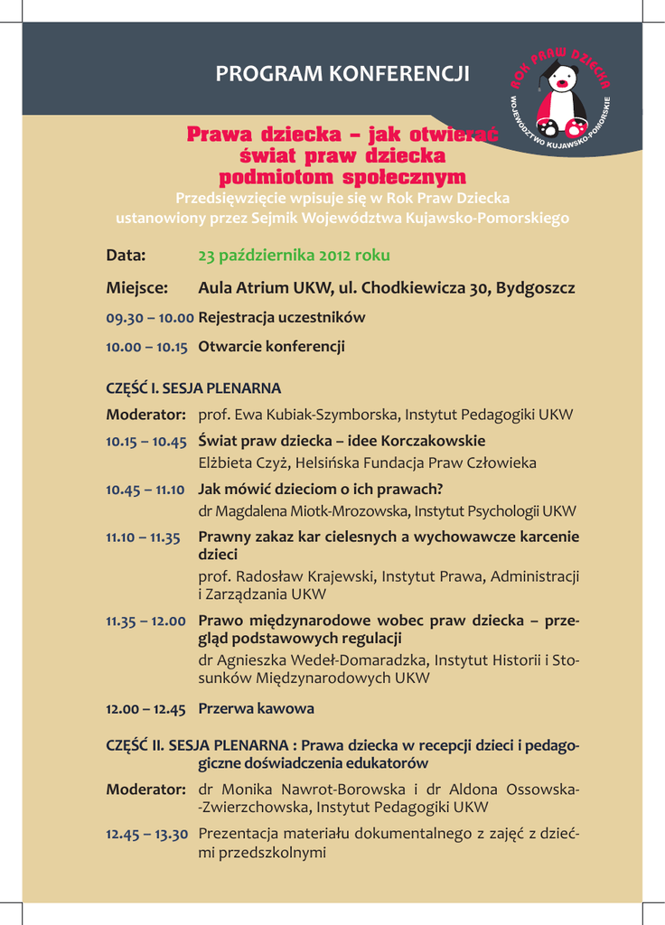 PROGRAM KONFERENCJI Prawa dziecka – jak otwierać świat praw dziecka podmiotom społecznym Przedsięwzięcie wpisuje się w Rok Praw Dziecka ustanowiony przez Sejmik Województwa Kujawsko-Pomorskiego Data: 23 października 2012 roku Miejsce: Aula Atrium UKW, ul. Chodkiewicza 30, Bydgoszcz 09.30 – 10.00Rejestracja uczestników 10.00 – 10.15 Otwarcie konferencji CZĘŚĆ I. SESJA PLENARNA Moderator: prof. Ewa Kubiak-Szymborska, Instytut Pedagogiki UKW 10.15 – 10.45 Świat praw dziecka – idee Korczakowskie Elżbieta Czyż, Helsińska Fundacja Praw Człowieka 10.45 – 11.10 Jak mówić dzieciom o ich prawach? dr Magdalena Miotk-Mrozowska, Instytut Psychologii UKW 11.10 – 11.35 Prawny zakaz kar cielesnych a wychowawcze karcenie dzieci prof. Radosław Krajewski, Instytut Prawa, Administracji i Zarządzania UKW 11.35 – 12.00 Prawo międzynarodowe wobec praw dziecka – przegląd podstawowych regulacji dr Agnieszka Wedeł-Domaradzka, Instytut Historii i Stosunków Międzynarodowych UKW 12.00 – 12.45 Przerwa kawowa CZĘŚĆ II. SESJA PLENARNA : Prawa dziecka w recepcji dzieci i pedagogiczne doświadczenia edukatorów Moderator: dr Monika Nawrot-Borowska i dr Aldona Ossowska-Zwierzchowska, Instytut Pedagogiki UKW 12.45 – 13.30 Prezentacja materiału dokumentalnego z zajęć z dziećmi przedszkolnymi Doświadczenia nauczycieli przedszkola z zajęć i zabaw poświęconych prawom dziecka Lidia Jasińska i Małgorzata Bartelak, Przedszkole Publiczne nr 20 w Bydgoszczy Bogumiła Frankowska i Aleksandra Żmudzińska, Przedszkole Niepubliczne „Przedszkolna Chatka” w Bydgoszczy 13.30 – 14.10 Prezentacja materiału dokumentalnego z zajęć z dziećmi w wieku wczesnoszkolnym i gimnazjalnym Doświadczenia edukacyjne z zajęć w ramach projektu: Porozmawiajmy o prawach. Od Deklaracji do Konwencji Ewa Bedełek, Pedagogiczna Biblioteka Wojewódzka im. Mariana Rejewskiego w Bydgoszczy 14.10 – 14.30 Doświadczenia Stowarzyszenia „Bezpieczeństwo Dziecka” w sytuacjach łamania praw dziecka Robert Lubrant, Stowarzyszenie „Bezpieczeństwo Dziecka” w Bydgoszczy 14.30 Zakończenie obrad plenarnych WARSZTATY (dla osób zarejestrowanych) 15.00 – 16.30 WARSZTAT I Jak budować świadomość podmiotów społecznych w zakresie praw dziecka? prowadzenie: Krystyna Miklas i Lilianna Dyks WARSZTAT II Jak budować świadomość praw dziecka u dzieci? prowadzenie: Monika Banaszak i Kamila Gąsiorek WARSZTAT III Jak pomagać dzieciom w sytuacji łamania ich praw? prowadzenie: Emilia Głuchowska-Gąsiorowska i Maciej Kluczyk