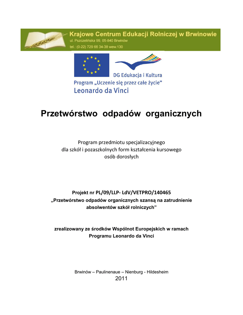 Przetwórstwo odpadów organicznych Program przedmiotu specjalizacyjnego dla szkół i pozaszkolnych form kształcenia kursowego osób dorosłych Projekt nr PL/09/LLP- LdV/VETPRO/140465 „Przetwórstwo odpadów organicznych szansą na zatrudnienie absolwentów szkół rolniczych” zrealizowany ze środków Wspólnot Europejskich w ramach Programu Leonardo da Vinci Brwinów – Paulinenaue – Nienburg - Hildesheim 2011 Krajowe Centrum Edukacji Rolniczej w Brwinowie Dyrektor: Wojciech Gregorczyk Partnerzy zagraniczni: ILLUT - Berlin - Brandenburg DEULA Nienburg DEULA Hildesheim Opracowanie programu – mgr inż. Zofia Blajer – Zespół Szkół Rolniczych w Grzybnie Program opracowano na podstawie materiałów otrzymanych od uczestników projektu. Opinia – mgr inż. Małgorzata Pawlonka – nauczyciel konsultant KCER w Brwinowie Za wszelkie treści rozpowszechniane w ramach projektu odpowiada wyłącznie jego Beneficjent: Krajowe Centrum Edukacji Rolniczej w Brwinowie. Narodowa Agencja oraz Komisja Europejska nie ponoszą odpowiedzialności za sposób wykorzystania informacji, publikacji i materiałów powstałych w związku z realizacją projektu. Projekt nr PL/09/LLP- LdV/VETPRO/140465 „Przetwórstwo odpadów organicznych szansą na zatrudnienie absolwentów szkół rolniczych” zrealizowany ze środków Wspólnot Europejskich w ramach programu Leonardo da Vinci Opracowanie redakcyjne: Marek Rudziński Wydawca Krajowe Centrum Edukacji Rolniczej, Brwinów 2011 „Projekt finansowany ze środków Unii Europejskiej z Programu Leonardo da Vinci” 2 Spis treści 1. Wstęp 4 2. Szczegółowe cele kształcenia 6 3. Podział materiału nauczania 8 4. Treści kształcenia 9 5. Wskazówki metodyczne dotyczące realizacji programu 16 6. Propozycje metod sprawdzania i oceny osiągnięć edukacyjnych ucznia 18 Literatura 20 7. „Projekt finansowany ze środków Unii Europejskiej z Programu Leonardo da Vinci” 3 1. Wstęp Krajowe Centrum Edukacji Rolniczej w Brwinowie jest państwową placówką doskonalenia nauczycieli, która zajmuje się doskonaleniem merytorycznym i metodycznym nauczycieli przedmiotów zawodowych ze szkół rolniczych. Jednym z celów realizowanych przez Centrum jest opracowanie i realizowanie projektów edukacyjnych finansowanych ze środków funduszy europejskich. Są to projekty Leonardo da Vinci – wymiany doświadczeń VETPRO w których biorą udział nauczyciele szkół rolniczych z całego kraju. Jednym z efektów wymiany doświadczeń w ramach projektu „Przetwórstwo odpadów organicznych szansą na zatrudnienie absolwentów szkół rolniczych”, realizowanego w niemieckich ośrodkach: ILLUT - Berlin – Brandenburg, DEULA Nienburg, DEULA Hildesheim, jest program nauczania przedmiotu specjalizującego: „Przetwórstwo odpadów organicznych”. Odpady i związane z nimi zagrożenia stają się w naszych czasach ważnym problemem w ochronie środowiska. Strategia Wspólnoty w zakresie gospodarki odpadami określa podstawowe cele dotyczące: zapobiegania powstawaniu odpadów, zmniejszenia ich ilości i szkodliwości, odzyskiwania i powtórnego wykorzystywania. Ta problematyka ujęta jest w przepisach prawnych Unii Europejskiej i naszego kraju. Jest to dla nas ogromne wyzwanie, aby te regulacje prawne były respektowane i egzekwowane. Odbyta wymiana doświadczeń u partnerów niemieckich pozwoliła na praktyczne poznanie przez uczestników projektu problematyki przetwórstwa odpadów. W Niemczech można podpatrzeć wzorowo prowadzone działania w tym zakresie. Podstawowym krokiem, który trzeba wykonać w kraju, aby osiągnąć taki poziom to edukacja młodzieży i osób dorosłych w tym kierunku. Opracowany program nauczania może być realizowany, jako przedmiot specjalizacyjny w klasie III lub IV technikum na podbudowie gimnazjum oraz w technikum uzupełniającym i w szkołach policealnych oraz z uczestnikami szkoleń kursowych. Dotychczas tematyka ta w niewielkim stopniu ma miejsce w edukacji szkolnej. Jest to wyzwanie dla szkół, aby przybliżyć młodzieży, dorosłym i upowszechnić możliwości odzyskiwania i przetwarzania odpadów, a w szczególności biodegradacji odpadów organicznych. Temu celowi ma służyć opracowany program nauczania. Program ten może ułatwić nauczycielom realizację zajęć, a przyszłym rolnikom poznanie treści dotyczących możliwości przetwarzania odpadów organicznych. Dla uczestników szkolenia kursowego program daje możliwości uzupełnienia i uaktualnienia „Projekt finansowany ze środków Unii Europejskiej z Programu Leonardo da Vinci” 4 kształcenia szkolnego lub zdobycia dodatkowej wiedzy i umiejętności z tego zakresu tematycznego. Do zaprezentowania tematyki przedmiotu specjalizacyjnego skłania również konieczność poszukiwania alternatywnych źródeł dochodu w stosunku do produkcji rolniczej na terenach wiejskich. Aktywność w tym kierunku przejawiają ludzie mieszkający w Europie Zachodniej, co mogli zaobserwować uczestnicy projektu wymiany doświadczeń. Korzystając z doświadczeń sąsiadów możemy zaprezentować możliwości przetwarzania odpadów organicznych w polskich warunkach, z uwzględnieniem aktualnych rozwiązaniach prawnych. Prowadzenie działalności gospodarczej w zakresie przetwarzania odpadów organicznych pomoże zminimalizować niekorzystne zjawiska społeczne, które dotykają polską wieś, a w szczególności: zagrożenia wynikające z ubożenia ludności wiejskiej oraz z nierównych szans rozwoju i dysparytetu dochodowego w stosunku do innych grup zawodowych. Zagadnienia te nie są tak groźne dla społeczeństwa, gdy mieszkańcy wsi posiadają alternatywne źródła dochodu. Dodatkowo podejmowane działania pobudzają aktywność i przedsiębiorczość oraz przyczyniają się do zlikwidowania ukrytego bezrobocia na wsi. Materiał nauczania i szczegółowe cele kształcenia zostały zawarte w sześciu działach programowych: 1. Podstawowe pojęcia dotyczące przetwórs