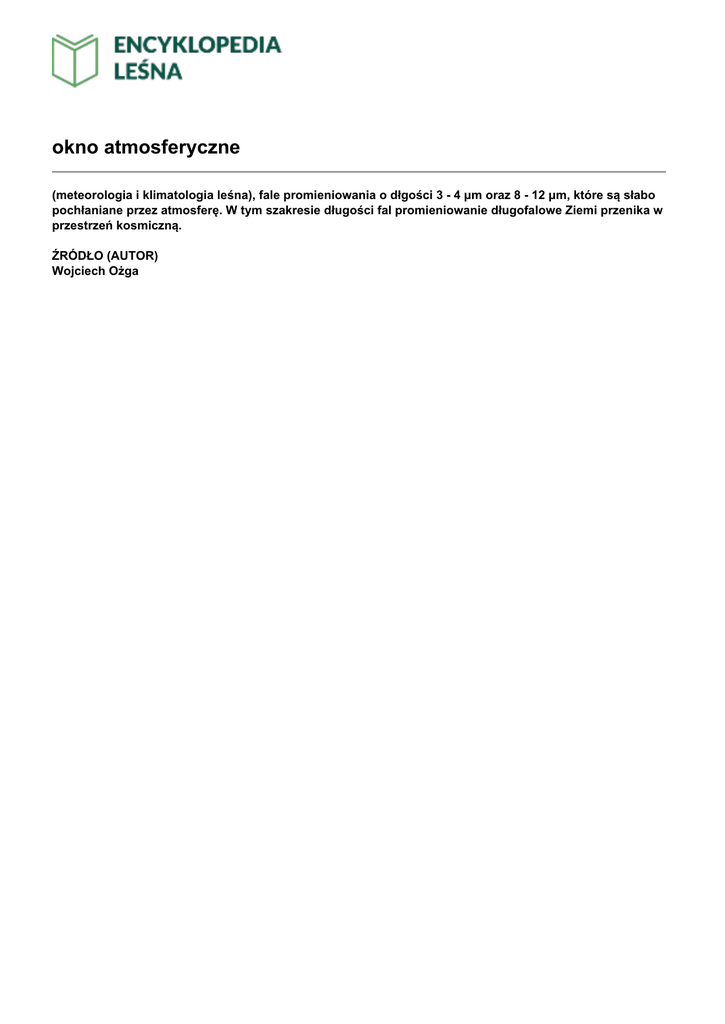 okno atmosferyczne (meteorologia i klimatologia leśna), fale promieniowania o dłgości 3 - 4 μm oraz 8 - 12 μm, które są słabo pochłaniane przez atmosferę. W tym szakresie długości fal promieniowanie długofalowe Ziemi przenika w przestrzeń kosmiczną. ŹRÓDŁO (AUTOR) Wojciech Ożga