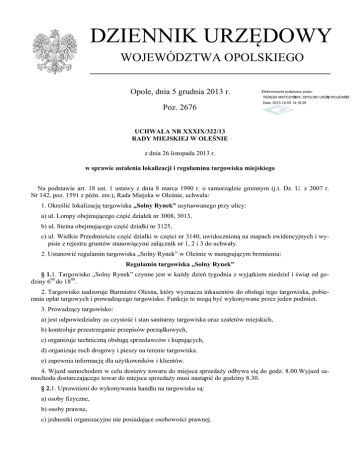 DZIENNIK URZĘDOWY WOJEWÓDZTWA OPOLSKIEGO Opole, dnia 5 grudnia 2013 r. Elektronicznie podpisany przez: TERESA MATCZYŃSKA; OPOLSKI URZĄD WOJEWÓDZKI Poz. 2676 Data: 2013-12-05 14:16:29 UCHWAŁA NR XXXIX/322/13 RADY MIEJSKIEJ W OLEŚNIE z dnia 26 listopada 2013 r. w sprawie ustalenia lokalizacji i regulaminu targowiska miejskiego Na podstawie art. 18 ust. 1 ustawy z dnia 8 marca 1990 r. o samorządzie gminnym (j.t. Dz. U. z 2007 r. Nr 142, poz. 1591 z późn. zm.), Rada Miejska w Oleśnie, uchwala: 1. Określić lokalizację targowiska „Solny Rynek” usytuowanego przy ulicy: a) ul. Lompy obejmującego część działek nr 3008, 3013, b) ul. Steina obejmującego część działki nr 3125, c) ul. Wielkie Przedmieście część działki w części nr 3140, uwidocznioną na mapach ewidencyjnych i wypisie z rejestru gruntów stanowiącymi załącznik nr 1, 2 i 3 do uchwały. 2. Ustanowić regulamin targowiska „Solny Rynek” w Oleśnie w następującym brzmieniu: Regulamin targowiska „Solny Rynek” § 1.1. Targowisko „Solny Rynek” czynne jest w każdy dzień tygodnia z wyjątkiem niedziel i świąt od godziny 600 do 1800. 2. Targowisko nadzoruje Burmistrz Olesna, który wyznacza inkasentów do obsługi tego targowiska, pobierania opłat targowych i prowadzącego targowisko. Funkcje te mogą być wykonywane przez jeden podmiot. 3. Prowadzący targowisko: a) jest odpowiedzialny za czystość i stan sanitarny targowiska oraz szaletów miejskich, b) kontroluje przestrzeganie przepisów porządkowych, c) organizuje techniczną obsługę sprzedawców i kupujących, d) organizuje ruch drogowy i pieszy na terenie targowiska. e) zapewnia informację dla użytkowników i klientów. 4. Wjazd samochodem w celu dostawy towaru do miejsca sprzedaży odbywa się do godz. 8.00.Wyjazd samochodu dostarczającego towar do miejsca sprzedaży musi nastąpić do godziny 8.30. § 2.1. Uprawnieni do wykonywania handlu na targowisku są: a) osoby fizyczne, b) osoby prawne, c) jednostki organizacyjne nie posiadające osobowości prawnej. Dziennik Urzędowy Województwa Opolskiego –2– Poz. 2676 2. Osoby prowadzące działalność na targowisku zobowiązane są do posiadania przy sobie dokumentu umożliwiającego ustalenie ich tożsamości. § 3.1. Na targowisku mogą być sprzedawane wszystkie towary z wyjątkiem: a) napojów alkoholowych, b) nafty, benzyny, spirytusu skażonego, trucizn, narkotyków, dopalaczy, c) środków farmakologicznych, materiałów medycznych, środków leczniczych, d) zagranicznych banknotów i monet będących w obiegu oraz papierów wartościowych, e) żywych zwierząt (nie dotyczy ryb), f) mięsa i wędlin oraz przetworów rybnych, sprzedawanych poza przewoźnymi pawilonami handlowymi, g) broni, amunicji, materiałów wybuchowych w tym artykułów pirotechnicznych, h) przedmiotów ekwipunku wojskowego, i) grzybów świeżych i suszonych rosnących w warunkach naturalnych oraz przetworów grzybowych, bez atestu klasyfikatora, j) innych artykułów, których sprzedaż jest zabroniona na podstawie odrębnych przepisów. 2. Sprzedaż artykułów spożywczych powinna odbywać się zgodnie z wymogami zawartymi w przepisach odrębnych, a w szczególności zgodnie z przepisami dotyczącymi bezpieczeństwa żywności i żywienia oraz jakości handlowej artykułów rolno-spożywczych. 3. Prowadzący targowisko jest zobowiązany do wstrzymania sprzedaży towaru i powiadomienia organów sanitarnych i ścigania, jeżeli zachodzi podejrzenie, iż jest on szkodliwy dla zdrowia, pochodzi z kradzieży lub nielegalnego źródła nabycia. § 4.1. Miejsce sprzedaży wyznacza prowadzący targowisko. 2. Wyznaczonego miejsca sprzedaży osoba, której to miejsce wyznaczono nie może zmienić, ani też odstąpić innej osobie. § 5.1. Osoby prowadzące handel na targowisku zobowiązane są do: a) przestrzegania regulaminu targowiska, b) niezwłocznego wniesienia dziennej opłaty targowej oraz innych należności dotyczących usług dodatkowych dostępnych na targowisku, c) stosowania się do poleceń wydanych przez prowadzącego targowisko, d) przestrzegania przepisów sanitarno-epidemiologicznych, przeciwpożarowych oraz innych obowiązujących w obrocie towarowym, e) utrzymywania miejsc wyznaczonych do sprzedaży w należytym porządku i czystości oraz usunięcia po zakończeniu sprzedaży wszelkich opakowań, kartonów i odpadów pozostałych w związku z prowadzoną przez nie sprzedażą, f) wyposażenia miejsc sprzedaży udostępnionych w czytelne tabliczki informacyjne zawierające imię i nazwisko prowadzącego handel właściciela lub firmy oraz adres zamieszkania lub siedziby firmy, umieszczone w miejscu dobrze widocznym dla kupującego. 2. Osoby handlujące na targowisku z namiotów lub przenośnych pawilonów handlowych zobowiązane są ponadto do posiadania sprawnych gaśnic. § 6.1. Na targowisku zabrania się: a) wnoszenia, podawania oraz spożywania napojów alkoholowych oraz środków odurzających, b) wnoszenia oraz używania materiałów i substancji niebezpiecznych, c) prowadzenia gier hazardowych i losowych, Dziennik Urzędowy Województwa Opolskiego –3– Poz. 2676 d) ustawiania kiosków i straganów bez zgody prowadzącego targowisko, pozostawiania przenośnych lub przewoźnych stanowisk handlowych, e) instalowania przenośnych stanowisk handlowych poprzez wbijanie pali, gwoździ, prętów mogących powodować uszkodzenie nawierzchni, f) wprowadzania na teren targowiska psów i innych zwierząt domowych, g) handlu w miejscach do tego nieprzeznaczonych tj. na jezdniach, chodnikach, przejściach dla pieszych, utrudniających komunikację pieszą oraz urządzonych zieleńcach, h) zakłócania porządku publicznego, i) sprzedaży towarów w drodze publicznych losowań lub przetargów. § 7.1. Prowadzący targowisko ma prawo do: a) usuwania z terenu targowiska osób, które nie przestrzegają zasad określonych regulaminem, b) usuwania na koszt właściciela obiektów handlowych