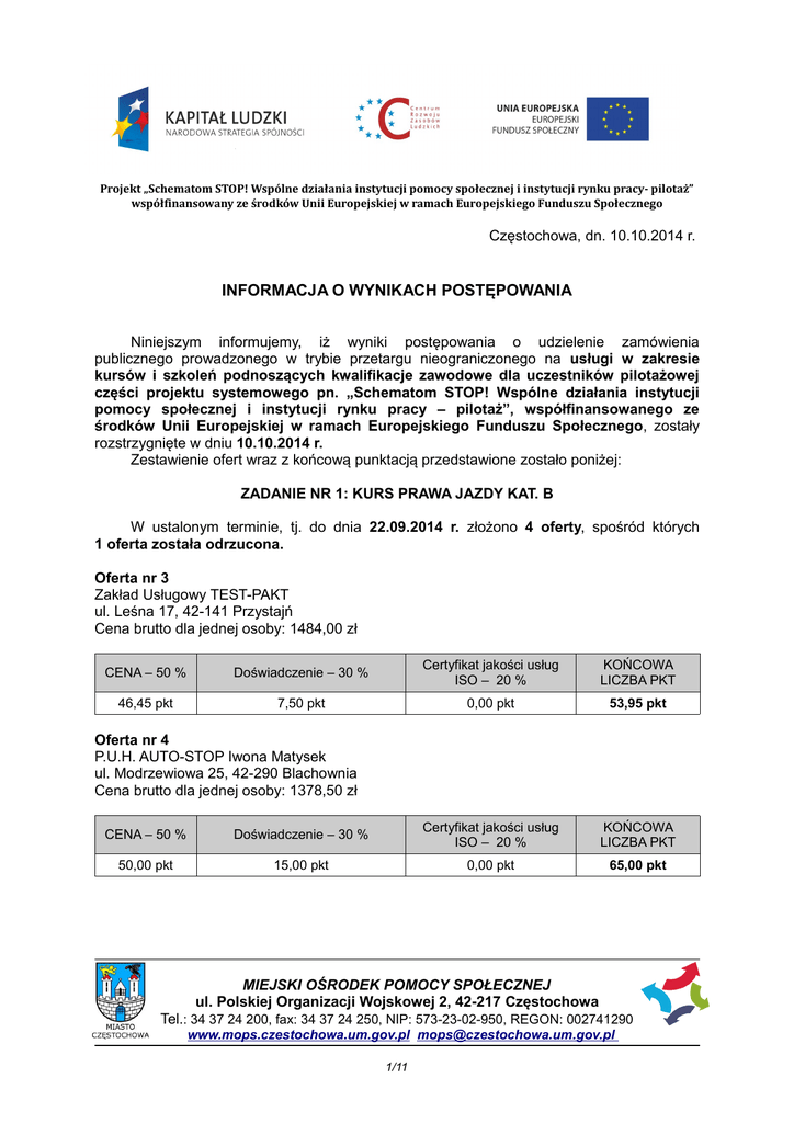 Projekt „Schematom STOP! Wspólne działania instytucji pomocy społecznej i instytucji rynku pracy- pilotaż” współfinansowany ze środków Unii Europejskiej w ramach Europejskiego Funduszu Społecznego Częstochowa, dn. 10.10.2014 r. INFORMACJA O WYNIKACH POSTĘPOWANIA Niniejszym informujemy, iż wyniki postępowania o udzielenie zamówienia publicznego prowadzonego w trybie przetargu nieograniczonego na usługi w zakresie kursów i szkoleń podnoszących kwalifikacje zawodowe dla uczestników pilotażowej części projektu systemowego pn. „Schematom STOP! Wspólne działania instytucji pomocy społecznej i instytucji rynku pracy – pilotaż”, współfinansowanego ze środków Unii Europejskiej w ramach Europejskiego Funduszu Społecznego, zostały rozstrzygnięte w dniu 10.10.2014 r. Zestawienie ofert wraz z końcową punktacją przedstawione zostało poniżej: ZADANIE NR 1: KURS PRAWA JAZDY KAT. B W ustalonym terminie, tj. do dnia 22.09.2014 r. złożono 4 oferty, spośród których 1 oferta została odrzucona. Oferta nr 3 Zakład Usługowy TEST-PAKT ul. Leśna 17, 42-141 Przystajń Cena brutto dla jednej osoby: 1484,00 zł CENA – 50 % Doświadczenie – 30 % Certyfikat jakości usług ISO – 20 % KOŃCOWA LICZBA PKT 46,45 pkt 7,50 pkt 0,00 pkt 53,95 pkt Oferta nr 4 P.U.H. AUTO-STOP Iwona Matysek ul. Modrzewiowa 25, 42-290 Blachownia Cena brutto dla jednej osoby: 1378,50 zł CENA – 50 % Doświadczenie – 30 % Certyfikat jakości usług ISO – 20 % KOŃCOWA LICZBA PKT 50,00 pkt 15,00 pkt 0,00 pkt 65,00 pkt MIEJSKI OŚRODEK POMOCY SPOŁECZNEJ ul. Polskiej Organizacji Wojskowej 2, 42-217 Częstochowa Tel.: 34 37 24 200, fax: 34 37 24 250, NIP: 573-23-02-950, REGON: 002741290 www.mops.czestochowa.um.gov.pl [email protected] 1/11 Projekt „Schematom STOP! Wspólne działania instytucji pomocy społecznej i instytucji rynku pracy- pilotaż” współfinansowany ze środków Unii Europejskiej w ramach Europejskiego Funduszu Społecznego Oferta nr 17 Ośrodek Kursowego Szkolenia Kierowców Andrzej Tyła ul. Wapienna 3, 42-200 Częstochowa Cena brutto dla jednej osoby po uwzględnieniu omyłek rachunkowych: 1434,16 zł Oferta została odrzucona ze względu na wykluczenie Wykonawcy z udziału w postępowaniu o udzielenie zamówienia na podstawie art. 24 ust. 2 pkt 4 ustawy Prawo zamówień publicznych – Wykonawca nie wykazał spełnienia warunków udziału w postępowaniu. Uzasadnienie: Zamawiający w celu wykazania braku podstaw do wykluczenia z postępowania o udzielenie zamówienia publicznego, o których mowa w art. 24 ustawy Prawo zamówień publicznych, wymagał dołączenia do oferty m.in oświadczenia o braku podstaw do wykluczenia, stanowiącego załącznik nr 5 do SIWZ. Pomimo wystosowanego wezwania o uzupełnienie braków, Wykonawca nie dostarczył wymaganego dokumentu i tym samym podlega wkluczeniu. Oferta nr 18 Ośrodek Kursowego Szkolenia Kierowców „ADROM” Roman Adamiak ul. Ogrodowa 6 lok. 24, 42-200 Częstochowa P. P. H. U. „Albertina” Bożena Kmita ul. Jaworznicka 28, 41-208 Sosnowiec Cena brutto dla jednej osoby po uwzględnieniu omyłek rachunkowych: 1569,70 zł CENA – 50 % Doświadczenie – 30 % Certyfikat jakości usług ISO – 20 % KOŃCOWA LICZBA PKT 43,91 pkt 15,00 pkt 20,00 pkt 78,91 pkt Najkorzystniejszą ofertę złożyła firma: Ośrodek Kursowego Szkolenia Kierowców „ADROM” Roman Adamiak ul. Ogrodowa 6 lok. 24, 42-200 Częstochowa P. P. H. U. „Albertina” Bożena Kmita ul. Jaworznicka 28, 41-208 Sosnowiec ZADANIE NR 2: KURS OBSŁUGI WÓZKA JEZDNIOWEGO Z NAPĘDEM SILNIKOWY I BEZPIECZNĄ WYMIANĄ BUTLI W tej części postępowanie zostało unieważnione na podstawie art. 93 ust. 1 ustawy Prawo zamówień publicznych – nie wpłynęła żadna oferta niepodlegająca odrzuceniu. MIEJSKI OŚRODEK POMOCY SPOŁECZNEJ ul. Polskiej Organizacji Wojskowej 2, 42-217 Częstochowa Tel.: 34 37 24 200, fax: 34 37 24 250, NIP: 573-23-02-950, REGON: 002741290 www.mops.czestochowa.um.gov.pl [email protected] 2/11 Projekt „Schematom STOP! Wspólne działania instytucji pomocy społecznej i instytucji rynku pracy- pilotaż” współfinansowany ze środków Unii Europejskiej w ramach Europejskiego Funduszu Społecznego ZADANIE NR 3: KURS TECHNOLOG ROBÓT WYKOŃCZENIOWYCH W ustalonym terminie, tj. do dnia 22.09.2014 r. złożono 1 ofertę zgodną z przedmiotem zamówienia i niepodlegającą odrzuceniu. Oferta nr 7 Spółdzielnia Pracy „OŚWIATA” ul. Faradaya 31, 42-200 Częstochowa Cena brutto dla jednej osoby: 3918,00 zł CENA – 50 % Doświadczenie – 30 % Certyfikat jakości usług ISO – 20 % KOŃCOWA LICZBA PKT 50,00 pkt 7,50 pkt 20,00 pkt 77,50 pkt Najkorzystniejszą ofertę złożyła firma: Spółdzielnia Pracy „OŚWIATA” ul. Faradaya 31 42-200 Częstochowa ZADANIE NR 4: KURS SEKRETARKA, ADMINISTRATOR BIURA W ustalonym terminie, tj. do dnia 22.09.2014 r. złożono 2 oferty, spośród których 1 oferta została odrzucona. Oferta nr 1 Konsorcjum: „LUGA” Glińska Agnieszka ul. Jasnogórska 32 nr lok. 8, 42-200 Częstochowa Z.P.U. Alicja Glińska ul. Paderewskiego 50, 42-200 Częstochowa Cena brutto dla jednej osoby: 4750,80 zł CENA – 50 % Doświadczenie – 30 % Certyfikat jakości usług ISO – 20 % KOŃCOWA LICZBA PKT 50,00 pkt 30,00 pkt 20,00 pkt 100,00 pkt Oferta nr 14 AP EDUKACJA Centrum Szkolenia w Częstochowie Aleja N.M.P. 21, 42-202 Częstochowa Cena brutto dla jednej osoby: 6100,00 zł MIEJSKI OŚRODEK POMOCY SPOŁECZNEJ ul. Polskiej Organizacji Wojskowej 2, 42-217 Częstochowa Tel.: 34 37 24 200, fax: 34 37 24 250, NIP: 573-23-02-950, REGON: 002741290 www.mops.czestochowa.um.gov.pl [email protected] 3/11 Projekt „Schematom STOP! Wspólne działania instytucji pomocy społecznej i instytucji rynku pracy- pilotaż” współfinansowany ze środków Unii Europejskiej w ramach Europejskiego Funduszu Społecznego Oferta została odrzucona ze względu na wykluczenie Wykonawcy z udziału w postępowaniu o udzieleni