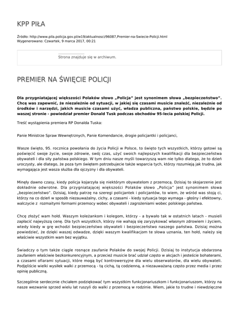 KPP PIŁA Źródło: http://www.pila.policja.gov.pl/w19/aktualnosci/96087,Premier-na-Swiecie-Policji.html Wygenerowano: Czwartek, 9 marca 2017, 00:21 Strona znajduje się w archiwum. PREMIER NA ŚWIĘCIE POLICJI Dla przygniatającej większości Polaków słowo „Policja” jest synonimem słowa „bezpieczeństwo”. Chcę was zapewnić, że niezależnie od sytuacji, w jakiej się czasami musicie znaleźć, niezależnie od środków i narzędzi, jakich musicie czasami użyć, władza publiczna, państwo polskie, będzie po waszej stronie - powiedział premier Donald Tusk podczas obchodów 95-lecia polskiej Policji. Treść wystąpienia premiera RP Donalda Tuska: Panie Ministrze Spraw Wewnętrznych, Panie Komendancie, drogie policjantki i policjanci, Wasze święto, 95. rocznica powołania do życia Policji w Polsce, to święto tych wszystkich, którzy gotowi są poświęcić swoje życie, swoje zdrowie, swój czas, użyć swoich najlepszych kwalifikacji dla bezpieczeństwa obywateli i dla siły państwa polskiego. W tym dniu nasze myśli towarzyszą wam nie tylko dlatego, że to dzień uroczysty, ale dlatego, że poza tym świętem potrzebujecie także wsparcia tych, którzy rozumieją jak trudna, jak wymagająca jest wasza służba dla ojczyzny i dla obywateli. Minęły dawno czasy, kiedy policja kojarzyła się niektórym obywatelom z przemocą. Dzisiaj to skojarzenie jest dokładnie odwrotne. Dla przygniatającej większości Polaków słowo „Policja” jest synonimem słowa „bezpieczeństwo”. Dzisiaj, kiedy patrzę na szeregi policjantek i policjantów, to wiem, że wśród was stoją ci, którzy na co dzień w sposób niezauważalny, cichy, a czasami - kiedy sytuacja tego wymaga - głośny i efektowny, walczycie z rozmaitymi formami przemocy wobec obywateli i zagrożeniami wobec polskiego państwa. Chcę złożyć wam hołd. Waszym koleżankom i kolegom, którzy - a bywało tak w ostatnich latach - musieli zapłacić najwyższą cenę. Dla tych wszystkich, którzy nie wahają się zaryzykować własnym zdrowiem i życiem, wtedy kiedy w grę wchodzi bezpieczeństwo obywateli i bezpieczeństwo naszego państwa. Dzisiaj można powiedzieć, że dzięki waszej odwadze, dzięki waszym kwalifikacjom te słowa uznania, ten hołd, należy się właściwie wszystkim wam bez wyjątku. Świadczy o tym także ciągle rosnące zaufanie Polaków do swojej Policji. Dzisiaj to instytucja obdarzona zaufaniem właściwie bezkonkurencyjnym, a przecież musicie brać udział często w akcjach i jesteście bohaterami, a czasami ofiarami sytuacji, które mogą być kontrowersyjne dla wielu obserwatorów, dla wielu obywateli. Podjęliście wielki wysiłek walki z przemocą - tą cichą, tą codzienną, a niezauważaną często przez media i przez opinię publiczną. Szczególnie serdecznie chciałem podziękować tym wszystkim funkcjonariuszkom i funkcjonariuszom, którzy na nasze wezwanie sprzed wielu lat ruszyli do walki z przemocą w rodzinie. Wiem, jakie to trudne i niewdzięczne zadanie, wymagające od was profesjonalizmu, odwagi cywilnej, a także stosownej delikatności. Osiągnęliście naprawdę rewelacyjne rezultaty. Dużo ważniejsze niż moje słowa podziękowania są dziesiątki, setki listów i słów serdecznych podziękowań od tych, których uchroniliście od codziennej przemocy. Ale są wśród was także ci, którzy zasłużyli na wyróżnienie, bo muszą stosować czasami twarde metody w celu obrony obywateli i obrony własnego państwa. Chcę bardzo mocno podkreślić, że każdy, kto łamie prawo i zagraża funkcjonariuszom wtedy, kiedy to prawo chcą przywrócić, każdy, kto podnosi rękę na polskiego policjanta, de facto podnosi rękę na państwo polskie. Każdy, kto obraża policjantkę czy policjanta na służbie, obraża majestat Rzeczpospolitej. Chcę was zapewnić, że niezależnie od sytuacji, w jakiej się czasami musicie znaleźć, niezależnie od środków i narzędzi, jakich musicie czasami użyć - władza publiczna, państwo polskie będzie po waszej stronie. A ci przestępcy, ci, którzy narażają prawo, ci którzy godzą w bezpieczeństwo obywateli, a często także w bezpieczeństwo tych, którzy noszą mundur, muszą wiedzieć, że nie pozostaną bezkarni. Muszą wiedzieć, że kiedy będzie trzeba, Policja użyje środków, łącznie z bronią, kiedy nie ma innego wyjścia. Badamy każdy z takich przypadków, muszę powiedzieć, że jestem pełen uznania dla waszego profesjonalizmu i powściągliwości w takich sytuacjach, które wymagają działań drastycznych. I chcę też powiedzieć, że w tych - na szczęście nielicznych - sytuacjach będziemy was wspierać - nawet jeśli nie wszyscy jeszcze rozumieją, że pierwszym zadaniem policjanta jest ochrona życia i zdrowia obywateli, i ich majątku, i bezpieczeństwa państwa niezależnie od kosztów, jakie policjant musi ponieść. Jestem przekonany, że z miesiąca na miesiąc, z roku na rok Polacy będą to rozumieli coraz lepiej. Za waszą służbę, za to, że tak godnie znosicie również czasami przejawy niezrozumienia, komplikacje, jakie czekają na was każdego dnia w służbie, za to że z taką ofiarnością, nie licząc godzin i nie przeliczając tego na wysokość pensji, służycie obywatelom, za wasz rosnący profesjonalizm - jeszcze raz serdecznie dziękuję. Rzadko kiedy przychodzi mi z takim przekonaniem i taką dumą składać wyrazy uznania i hołdu dla czyjejś pracy i czyjejś służby. Dziś robię to z przekonaniem najgłębszym. Przyjmijcie od wszystkich Polaków, nie tylko z polskiego rządu, słowa podziękowania, uznania i gratulacji. Wszystkiego dobrego dla was i dla waszych rodzin. One najlepiej wiedzą, co znaczy ofiarna służba Rzeczpospolitej, wasi bliscy najlepiej wiedzą jak ciężka, jak wymagająca jest wasza służba i im w tym dniu także podziękowania się należą. Wszystkiego dobrego. http://www.policja.pl/pol/aktualnosci/101474,Premier-na-Swiecie-Policji-maci
