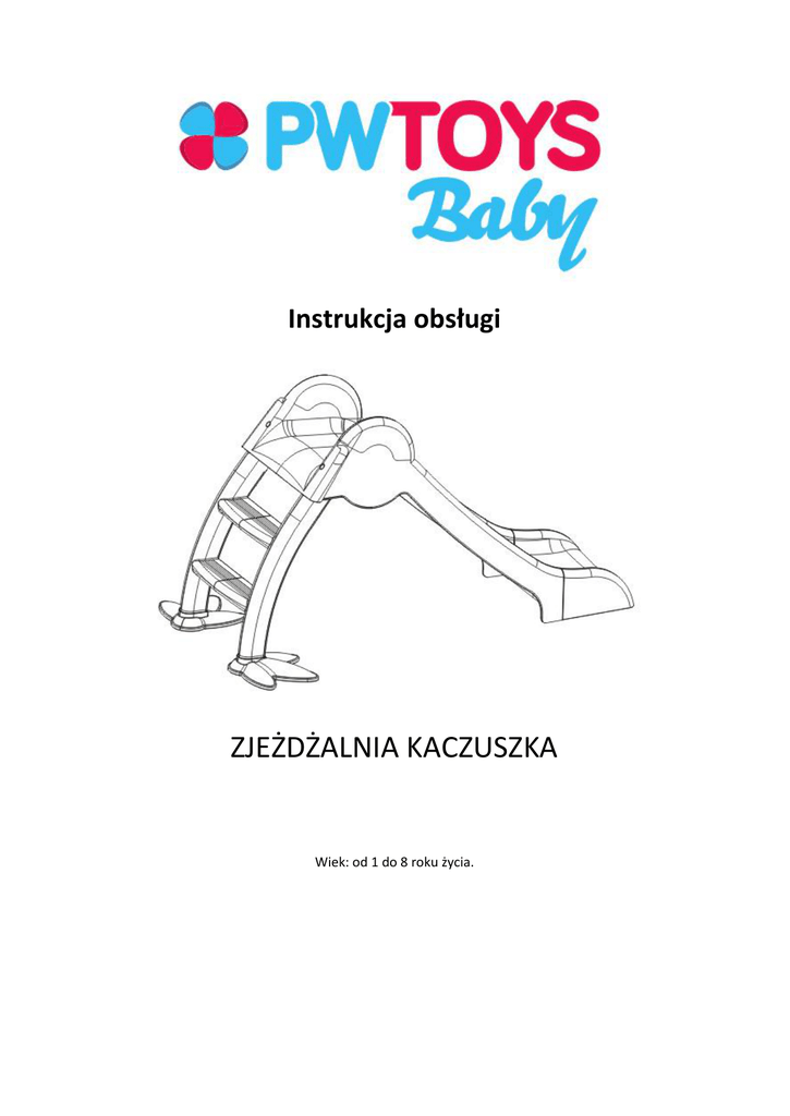 Instrukcja obsługi ZJEŻDŻALNIA KACZUSZKA Wiek: od 1 do 8 roku życia. Spis elementów. A) Ślizg x 1 szt. B) Drabinka x 1 szt. C) Ślizg dolny x 1 szt. D) Stopka x2 szt. Montaż: Zapoznaj się z poniższą instrukcją i sprawdź czy wszystkie elementy produktu znajdują się w opakowaniu, następnie złóż produkt dokładnie według instrukcji montażu. Uwaga! Podczas montażu nie pozwól dzieciom zbliżać się do elementów produktu. Nie stawiaj produktu na miękkim, niestabilnym podłożu. Nigdy nie pozostawiaj dzieci bez opieki, kiedy korzystają z tego produktu. Przechowywanie: Wytrzeć do czysta wilgotną szmatką i upewnić się, że produkt jest całkowicie suchy i czysty przed przechowywaniem, przechowuj go w suchym i wentylowanym miejscu, aby zapobiec pleśni. http://www.pwtoys.pl http://www.pwstore.pl