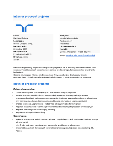 inżynier procesu/ projektu Firma: Kategoria: Randstad Polska Inżynieria i produkcja Lokalizacja: Rodzaj pracy: okolice Gorzowa Wlkp. Praca stała Data ważności: Liczba wakatów:1 20 grudnia 2015 Data publikacji: Kontakt: 21 października 2015 Nr referencyjny: Ewelina Wieczorek +48 605 302 501 e-mail: [email protected] 32529 Randstad Engineering od ponad dziesięciu lat specjalizuje się w rekrutacji kadry kierowniczej oraz wysoko wykwalifikowanych specjalistów do sektora produkcyjnego, łańcucha dostaw oraz branży budowlanej. Obecnie dla naszego Klienta, międzynarodowej firmy produkcyjnej działającej w branży opakowaniowej, zlokalizowanej w województwie lubuskim, poszukujemy osoby na stanowisko: inżynier procesu/ projektu Zakres obowiązków: zarządzanie ogółem prac związanych z wdrożeniem nowych projektów wdrażanie zmian produktu do procesu produkcji w połączeniu z optymalizacją procesu proponowanie działań mających na celu zapewnienie stałego ulepszania systemu produkcyjnego przy zachowaniu odpowiedniej jakości produktu oraz minimalizacji kosztów produkcji analiza, tworzenie, usprawnianie i nadzór nad istniejącymi standardami pracy wsparcie przygotowania i weryfikacja dokumentacji technicznej dla procesów produkcyjnych wsparcie technologiczne dla bieżącej produkcji współpraca z innymi działami firmy Oczekiwania: wykształcenie wyższe techniczne (zarządzanie i inżynieria produkcji, mechanika i budowa maszyn lub pokrewne) min. 2-letni staż pracy na pokrewnym stanowisku w zakładzie produkcyjnym znajomość zagadnień dotyczących optymalizacji procesu produkcji (Lean Manufacturing, 5S, Kaizen) wysokie umiejętności analityczne i umiejętność rozwiązywania problemów komunikatywna znajomość języka angielskiego Oferta: możliwość rozwoju w organizacji umowa o pracę stałe wynagrodzenie plus bonus kwartalny Dziękujemy za wszystkie aplikacje. Informujemy, że skontaktujemy się z wybranymi kandydatami. Agencja zatrudnienia (nr licencji 47)