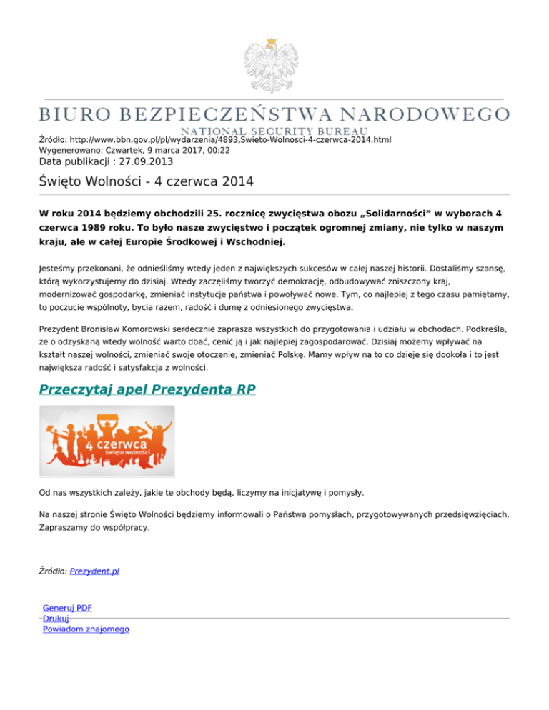 Święto Wolności - 4 czerwca 2014 Przeczytaj apel Prezydenta RP