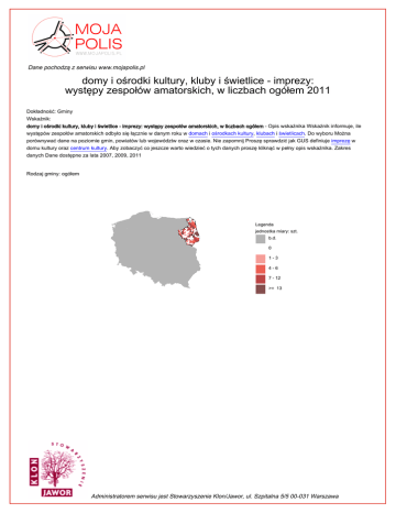 Dane pochodzą z serwisu www.mojapolis.pl domy i ośrodki kultury, kluby i świetlice - imprezy: występy zespołów amatorskich, w liczbach ogółem 2011 Dokładność: Gminy Wskaźnik: domy i ośrodki kultury, kluby i świetlice - imprezy: występy zespołów amatorskich, w liczbach ogółem - Opis wskaźnika Wskaźnik informuje, ile występów zespołów amatorskich odbyło się łącznie w danym roku w domach i ośrodkach kultury, klubach i świetlicach. Do wyboru Można porównywać dane na poziomie gmin, powiatów lub województw oraz w czasie. Nie zapomnij Proszę sprawdzić jak GUS definiuje imprezę w domu kultury oraz centrum kultury. Aby zobaczyć co jeszcze warto wiedzieć o tych danych proszę kliknąć w pełny opis wskaźnika. Zakres danych Dane dostępne za lata 2007, 2009, 2011 Rodzaj gminy: ogółem Legenda jednostka miary: szt. b.d. 0 1-3 4-6 7 - 12 >= 13 Administratorem serwisu jest Stowarzyszenie Klon/Jawor, ul. Szpitalna 5/5 00-031 Warszawa Dane pochodzą z serwisu www.mojapolis.pl Gminy domy i ośrodki kultury, kluby i świetlice - imprezy: występy zespołów amatorskich, w liczbach ogółem 2011, szt. Miejsce w rankingu Białystok 301 1 Suwałki-miasto 97 2 Zabłudów 63 3 Augustów-miasto 63 3 Łapy 58 5 Kolno-miasto 55 6 Łomża-miasto 41 7 Puńsk 38 8 Bielsk Podlaski-miasto 36 9 Krynki 34 10 Szczuczyn 34 10 Dąbrowa Białostocka 32 12 Kuźnica 30 13 Sejny-miasto 26 14 Choroszcz 23 15 Szudziałowo 21 16 Szepietowo 21 16 Zambrów-miasto 20 18 Rajgród 20 18 Mielnik 19 20 Hajnówka-miasto 18 21 Klukowo 18 21 Brańsk-miasto 15 23 Jasionówka 15 23 Czarna Białostocka 14 25 Gródek 14 25 Mały Płock 13 27 Narew 12 28 Wysokie Mazowieckie-miasto 11 29 Czeremcha 11 29 Nowinka 11 29 Dziadkowice 11 29 Białowieża 10 33 Grajewo-miasto 10 33 Hajnówka-wieś 10 33 Filipów 10 33 Jaświły 10 33 Knyszyn 10 33 Sokoły 10 33 Siemiatycze-miasto 9 40 Piątnica 9 40 Sztabin 9 40 Czyże 9 40 Raczki 8 44 Goniądz 8 44 Augustów-wieś 7 46 Stawiski 7 46 Przerośl 6 48 Narewka 6 48 Turośl 5 50 Jedwabne 5 50 Śniadowo 5 50 Czyżew-Osada 5 50 Giby 5 50 Administratorem serwisu jest Stowarzyszenie Klon/Jawor, ul. Szpitalna 5/5 00-031 Warszawa Dane pochodzą z serwisu www.mojapolis.pl Wasilków 5 50 Lipsk 5 50 Wąsosz 4 57 Ciechanowiec 4 57 Nowogród 4 57 Grabowo 4 57 Płaska 4 57 Nowy Dwór 4 57 Dubicze Cerkiewne 4 57 Orla 4 57 Miastkowo 4 57 Boćki 4 57 Kleszczele 4 57 Dobrzyniewo Duże 3 68 Tykocin 3 68 Milejczyce 3 68 Turośń Kościelna 3 68 Drohiczyn 2 72 Szumowo 2 72 Suchowola 2 72 Zbójna 2 72 Janów 2 72 Krypno 1 77 Brańsk-wieś 1 77 Krasnopol 1 77 Rutki 1 77 Bielsk Podlaski-wieś 0 81 Juchnowiec Kościelny 0 81 Michałowo 0 81 Poświętne 0 81 Supraśl 0 81 Suraż 0 81 Zawady 0 81 Korycin 0 81 Sidra 0 81 Sokółka 0 81 Rudka 0 81 Wyszki 0 81 Kolno-wieś 0 81 Łomża-wieś 0 81 Przytuły 0 81 Wizna 0 81 Grodzisk 0 81 Nurzec-Stacja 0 81 Perlejewo 0 81 Siemiatycze-wieś 0 81 Kobylin-Borzymy 0 81 Kulesze Kościelne 0 81 Nowe Piekuty 0 81 Wysokie Mazowieckie-wieś 0 81 Kołaki Kościelne 0 81 Zambrów-wieś 0 81 Bargłów Kościelny 0 81 Grajewo-wieś 0 81 Radziłów 0 81 Mońki 0 81 Trzcianne 0 81 Sejny-wieś 0 81 Bakałarzewo 0 81 Jeleniewo 0 81 Administratorem serwisu jest Stowarzyszenie Klon/Jawor, ul. Szpitalna 5/5 00-031 Warszawa Dane pochodzą z serwisu www.mojapolis.pl Rutka-Tartak 0 81 Suwałki-wieś 0 81 Szypliszki 0 81 Wiżajny 0 81 Administratorem serwisu jest Stowarzyszenie Klon/Jawor, ul. Szpitalna 5/5 00-031 Warszawa Dane pochodzą z serwisu www.mojapolis.pl Administratorem serwisu jest Stowarzyszenie Klon/Jawor, ul. Szpitalna 5/5 00-031 Warszawa Dane pochodzą z serwisu www.mojapolis.pl Administratorem serwisu jest Stowarzyszenie Klon/Jawor, ul. Szpitalna 5/5 00-031 Warszawa