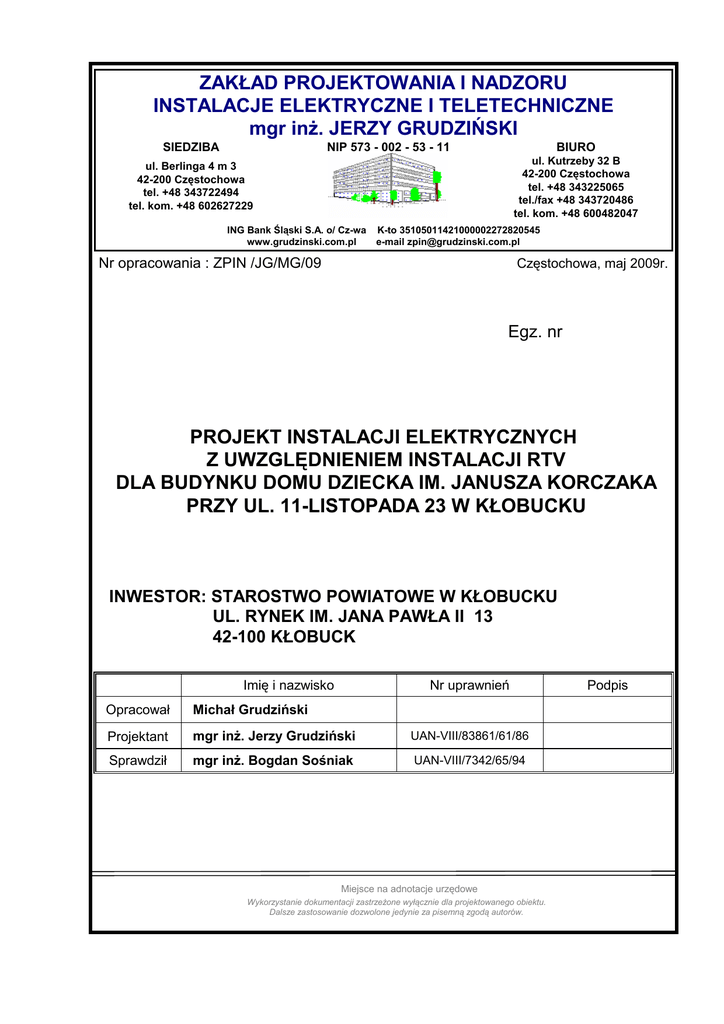 ZAKŁAD PROJEKTOWANIA I NADZORU INSTALACJE ELEKTRYCZNE I TELETECHNICZNE mgr inŜ. JERZY GRUDZIŃSKI SIEDZIBA NIP 573 - 002 - 53 - 11 BIURO ul. Kutrzeby 32 B 42-200 Częstochowa tel. +48 343225065 tel./fax +48 343720486 tel. kom. +48 600482047 ul. Berlinga 4 m 3 42-200 Częstochowa tel. +48 343722494 tel. kom. +48 602627229 ING Bank Śląski S.A. o/ Cz-wa www.grudzinski.com.pl K-to 35105011421000002272820545 e-mail [email protected] Nr opracowania : ZPIN /JG/MG/09 Częstochowa, maj 2009r. Egz. nr PROJEKT INSTALACJI ELEKTRYCZNYCH Z UWZGLĘDNIENIEM INSTALACJI RTV DLA BUDYNKU DOMU DZIECKA IM. JANUSZA KORCZAKA PRZY UL. 11-LISTOPADA 23 W KŁOBUCKU INWESTOR: STAROSTWO POWIATOWE W KŁOBUCKU UL. RYNEK IM. JANA PAWŁA II 13 42-100 KŁOBUCK Imię i nazwisko Nr uprawnień Opracował Michał Grudziński Projektant mgr inŜ. Jerzy Grudziński UAN-VIII/83861/61/86 Sprawdził mgr inŜ. Bogdan Sośniak UAN-VIII/7342/65/94 Miejsce na adnotacje urzędowe Wykorzystanie dokumentacji zastrzeŜone wyłącznie dla projektowanego obiektu. Dalsze zastosowanie dozwolone jedynie za pisemną zgodą autorów. Podpis Projekt instalacji elektrycznych z uwzględnieniem instalacji RTV dla budynku Domu Dziecka im. Janusza Korczaka przy ul. 11-Listopada 23 w Kłobucku. PROJEKT INSTALACJI ELEKTRYCZNYCH Z UWZGLĘDNIENIEM INSTALACJI RTV DLA BUDYNKU DOMU DZIECKA IM. JANUSZA KORCZAKA PRZY UL. 11-LISTOPADA 23 W KŁOBUCKU Oświadczam, Ŝe projekt jest wykonany zgodnie z obowiązującymi przepisami i normami oraz wiedzą techniczną, a takŜe zgodnie z umową i jest kompletny z punktu widzenia celu, któremu ma słuŜyć. mgr inŜ. Jerzy Grudziński UAN VIII / 83861 / 61 /86 Oświadczam, Ŝe projekt jest wykonany przepisami i normami oraz wiedzą techniczną. zgodnie z obowiązującymi mgr inŜ. Bogdan Sośniak UAN VIII / 7342 / 65 /94 Zakład Projektowania i Nadzoru Instalacje Elektryczne i Teletechniczne mgr inŜ. Jerzy Grudziński 42-200 Częstochowa ul. Kutrzeby 32B tel. kom. właściciel +48 602627229 www.grudzinski.com.pl tel. +48 343225065, tel/fax. +48 343720486 tel. kom. +48 600482047 e-mail [email protected] Projekt instalacji elektrycznych z uwzględnieniem instalacji RTV dla budynku Domu Dziecka im. Janusza Korczaka przy ul. 11-Listopada 23 w Kłobucku. 3. Zawartość dokumentacji 1. Strona tytułowa 2. Oświadczenia projektanta oraz sprawdzającego projekt 3. Zawartość dokumentacji 4. ZałoŜenia projektowe 4.1 Kopie pism i uzgodnień 4.2 Podstawa opracowania 4.3 Zakres opracowania 4.4 Stan istniejący 5. Opis techniczny 5.1 Wstęp, 5.2 Charakterystyka techniczna instalacji elektrycznych w budynku Domu Dziecka przy ul. 11-Listopada w Kłobucku, 5.3 Przebudowa układu zasilania budynku Domu Dziecka wraz z montaŜem głównego wyłącznika przeciwpoŜarowego DPX IS 250 w skrzynce OSZ 26x40 + F przy elewacji budynku, 5.4 Tablica główna budynku TG1, 5.5 Tablica główna TG2 - pion 2, 5.6 Tablice piętrowe TP1 X - pion 1 i TP2 X - pion 2 oraz TA3, 5.7 Tablice piętrowe w kondygnacji podziemnej – piwnice, 5.8 DemontaŜ istniejących tablic i rozdzielni, 5.9 Wewnętrzne linie zasilające WLZ, 5.10 Prowadzenie instalacji elektrycznej. Osprzęt instalacyjny, 5.11 Charakterystyka oświetlenia, 5.12 Oświetlenie awaryjne, 5.13 Ochrona przeciwporaŜeniowa, 5.14 Główna szyna wyrównawcza - instalacja połączeń wyrównawczych, 5.15 Ochrona odgromowa, 5.16 Ochrona przeciwprzepięciowa, 5.17 Przystosowanie budynku do instalacji RTV – rurarz, 5.18 Instalacje elektryczne w kotłowni. 6. Obliczenia 7. Uwagi końcowe Zakład Projektowania i Nadzoru Instalacje Elektryczne i Teletechniczne mgr inŜ. Jerzy Grudziński 42-200 Częstochowa ul. Kutrzeby 32B tel. kom. właściciel +48 602627229 www.grudzinski.com.pl tel. +48 343225065, tel/fax. +48 343720486 tel. kom. +48 600482047 e-mail [email protected] Projekt instalacji elektrycznych z uwzględnieniem instalacji RTV dla budynku Domu Dziecka im. Janusza Korczaka przy ul. 11-Listopada 23 w Kłobucku. Część rysunkowa: Rys. 0: Rys. 1: Rys. 2: Rys. 3: Rys. 4: Rys. 5: Rys. 6: Rys. 7: Rys. 8: Rys. 9: Rys. 10: Rys. 11: Rys. 12: Rys. 13: Rys. 14: Rys. 15: Rys. 16: Rys. 17: Rys. 18: Rys. 19: Rys. 20: Orientacja Widok przyłącza i głównego wyłącznika p.poŜ. Plan instalacji WLZ i połączeń wyrównawczych – rzut piwnic Plan instalacji WLZ – rzut parteru Plan instalacji elektrycznej – rzut piwnic Plan instalacji elektrycznej – rzut parteru Plan instalacji elektrycznej – rzut 1 piętra Plan instalacji elektrycznej – rzut 2 piętra Plan instalacji elektrycznej – rzut strychu Schemat ideowy układu zasilania z tablicą TG1 Schemat ideowy układu zasilania z tablicy TG2 (TRR2 + TA2) Schemat ideowy układu zasilania z tablicy TA1 Schemat ideowy układu zasilania z tablicy TA3 Schemat ideowy układu zasilania z tablicy TP1 I Schemat ideowy układu zasilania z tablicy TP1 II Schemat ideowy układu zasilania z tablic TP1 S i TP2 S Schemat ideowy układu zasilania z tablicy TP2 I Schemat ideowy układu zasilania z tablicy TP2 II Schemat ideowy układu zasilania z tablic TP1 P i TP1 W Schemat ideowy układu zasilania z tablic TP2 P Schemat ideowy układu zasilania z istniejącej tablicy TG-K w kotłowni wg. wskazań Rys. 21: Widoki tablic – parter Rys. 22: Widoki tablic – piwnica, piętro 1 i 2, strych Rys. 23: Schemat ideowy przystosowania budynku do instalacji RTV - rurarz Zakład Projektowania i Nadzoru Instalacje Elektryczne i Teletechniczne mgr inŜ. Jerzy Grudziński 42-200 Częstochowa ul. Kutrzeby 32B tel. kom. właściciel +48 602627229 www.grudzinski.com.pl tel. +48 343225065, tel/fax. +48 343720486 tel. kom. +48 600482047 e-mail [email protected] Projekt instalacji elektrycznych z uwzględnieniem instalacji RTV dla budynku Domu Dziecka im. Janusza Korczaka przy ul. 11-Listopada 23 w Kłobucku. 4 ZałoŜenia projektowe 4.1. Kopie pism i uzgodnień • Warunki przyłączenia budynku Domu Dziecka przy ul. 11-Listopada w Kłobucku do sieci elektroenergetycznej wydan